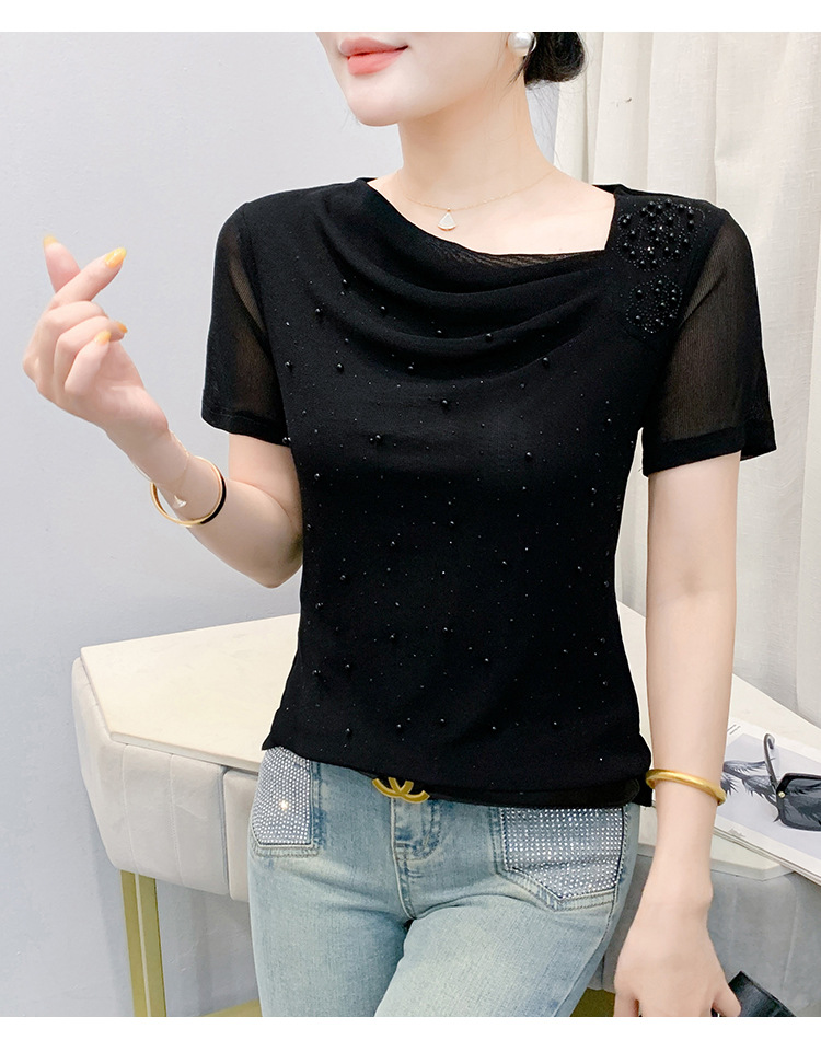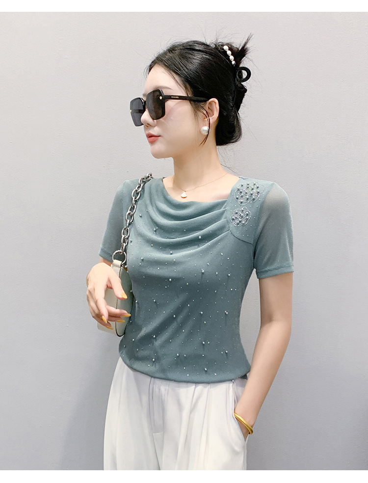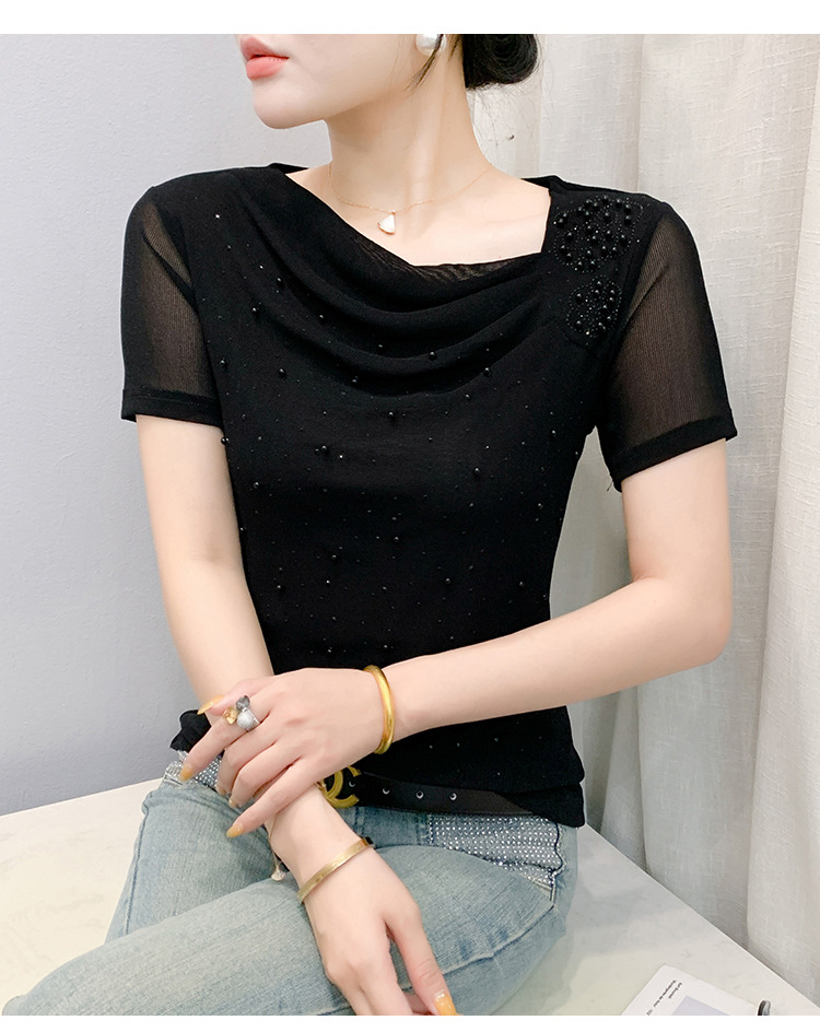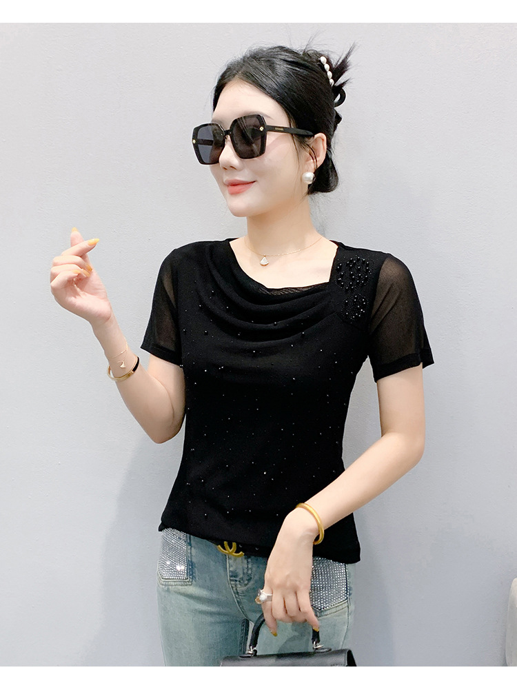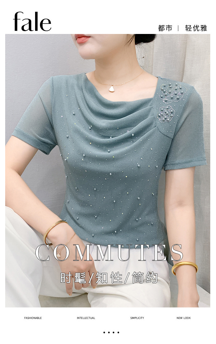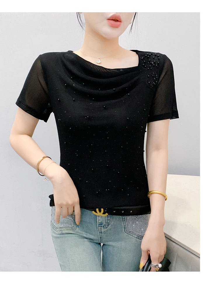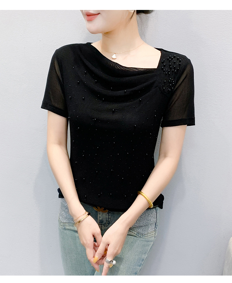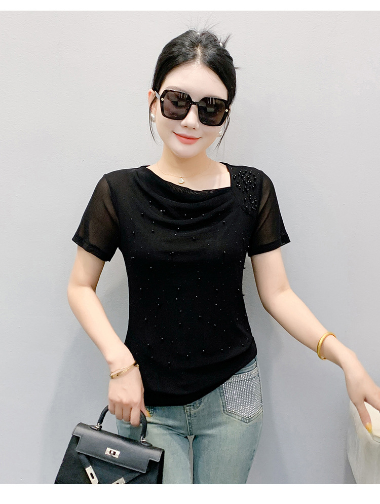 KQL 311H9039满天星烫钻斜领网纱短袖纯色洋气时尚休闲