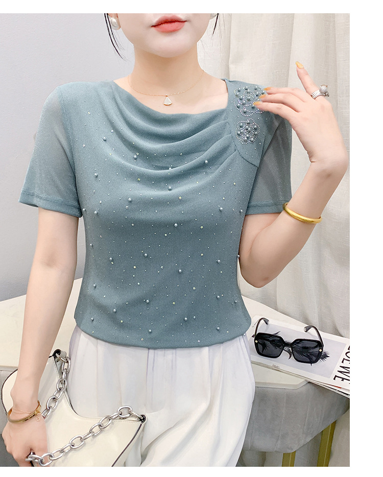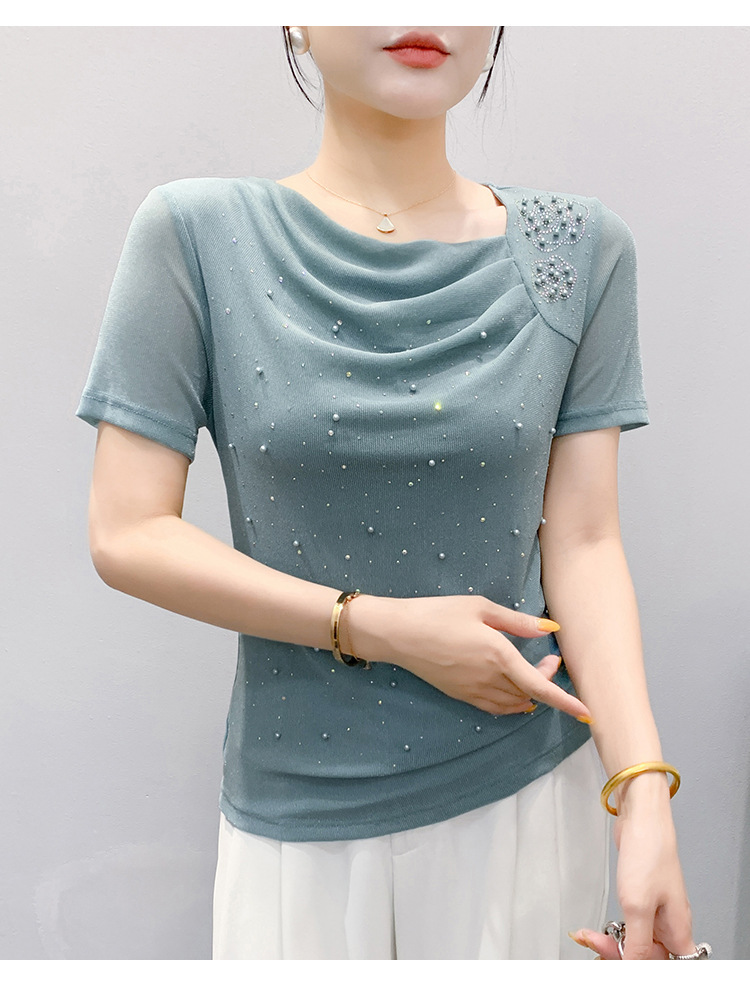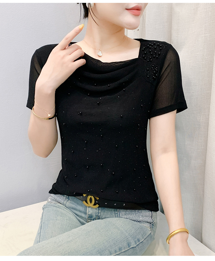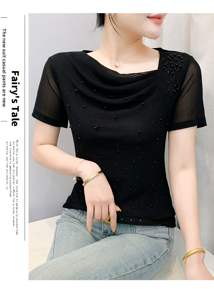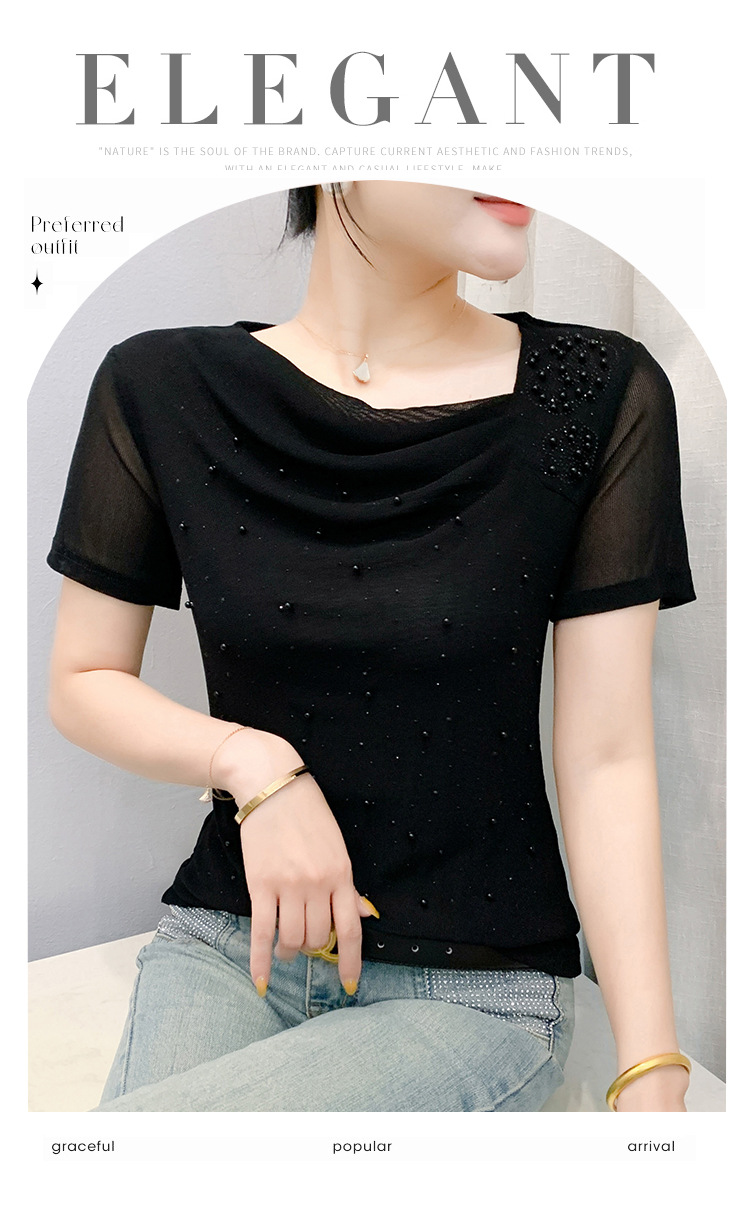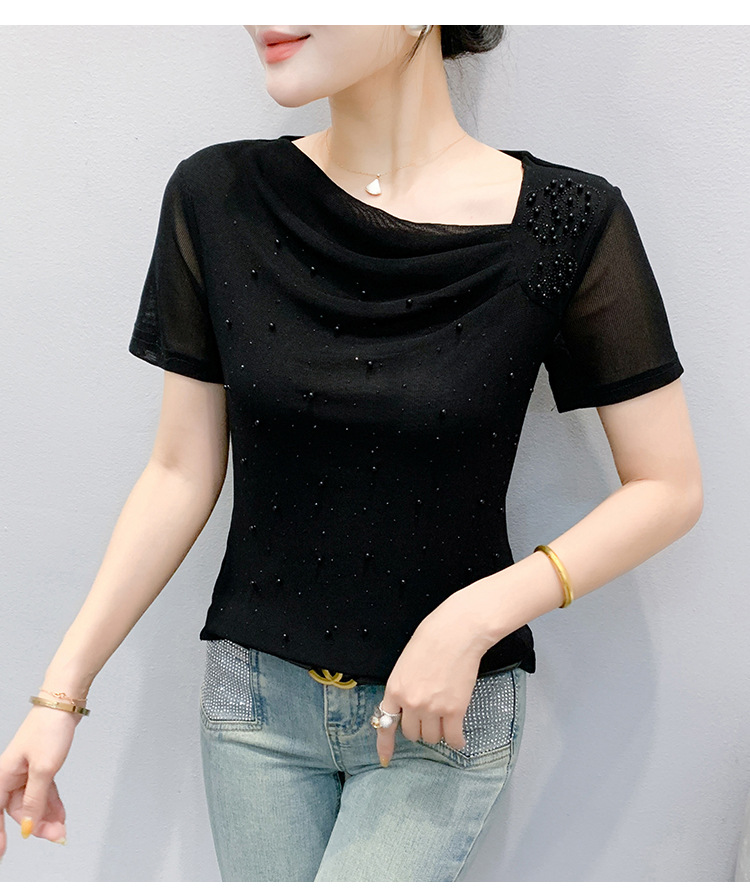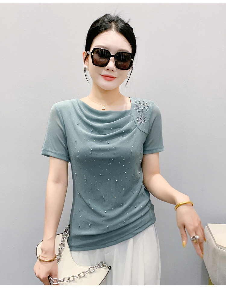 KQL 311H9039满天星烫钻斜领网纱短袖纯色洋气时尚休闲