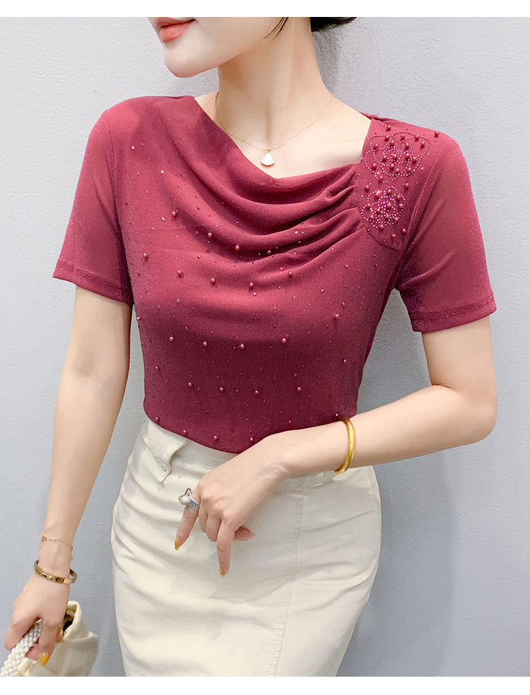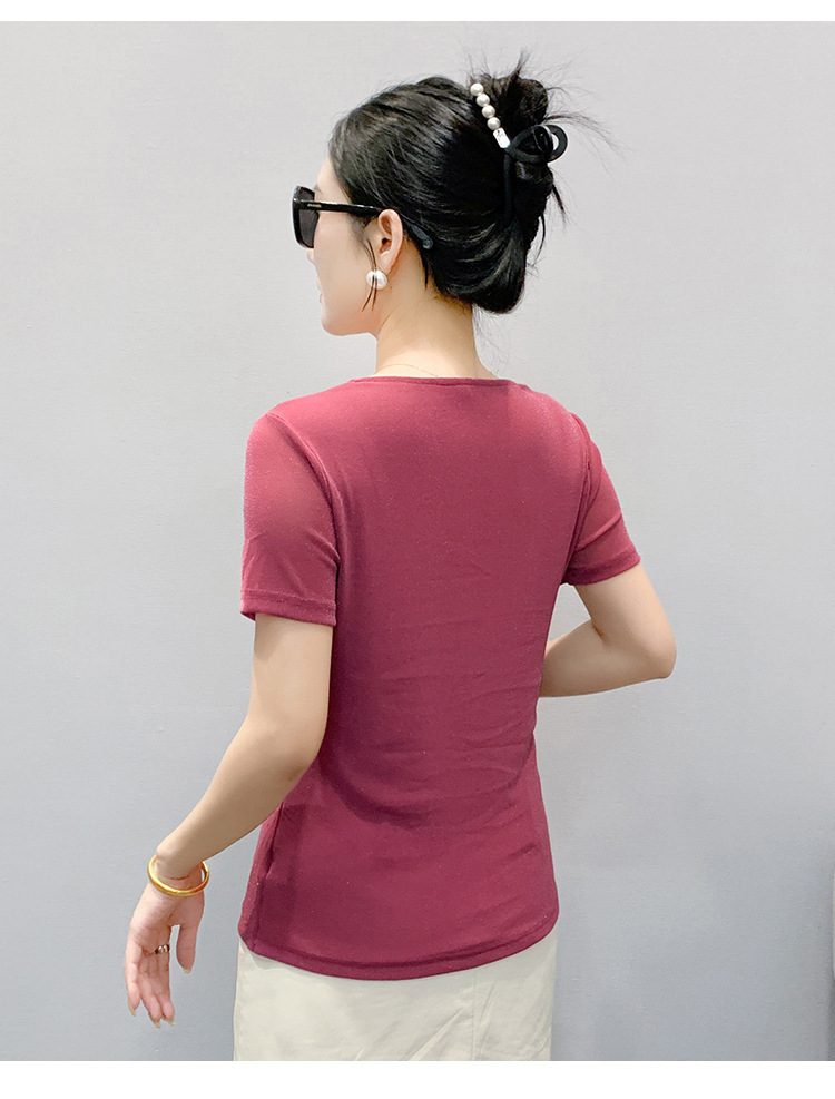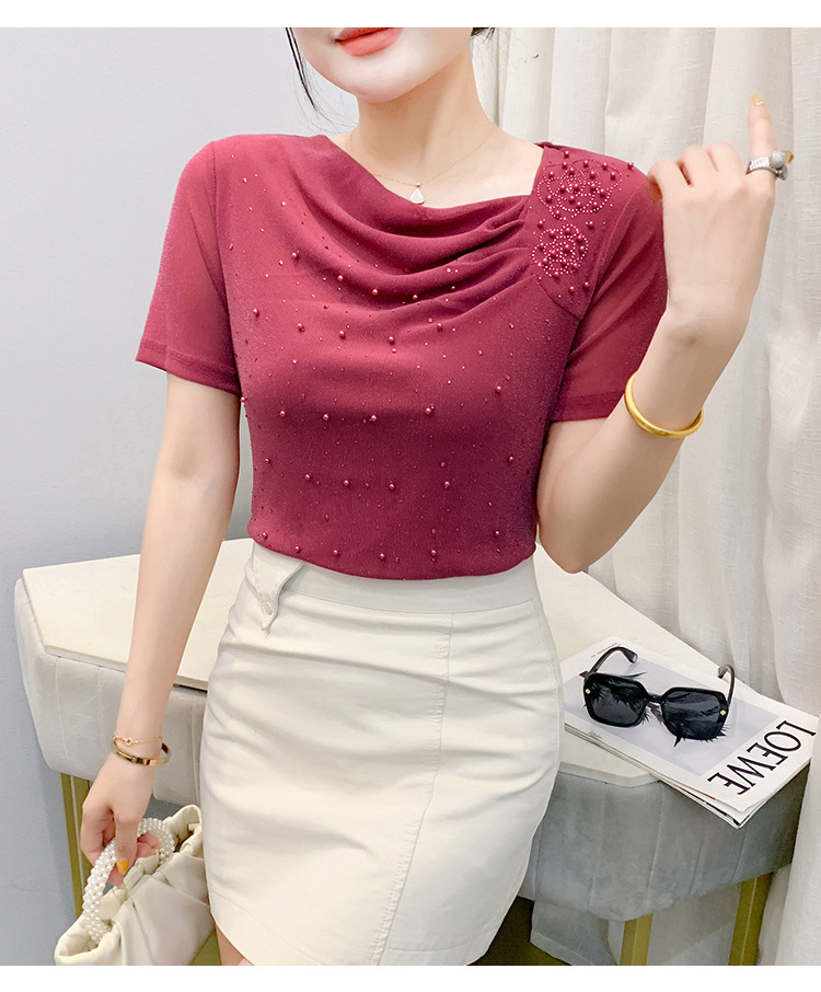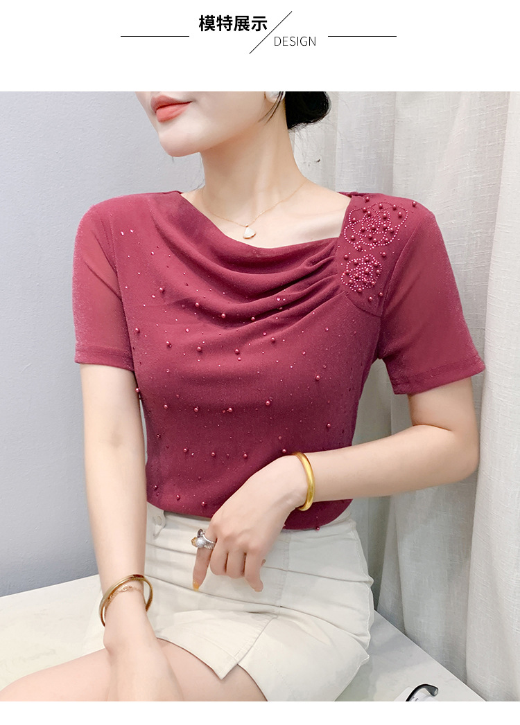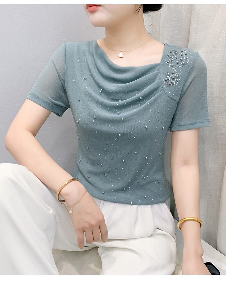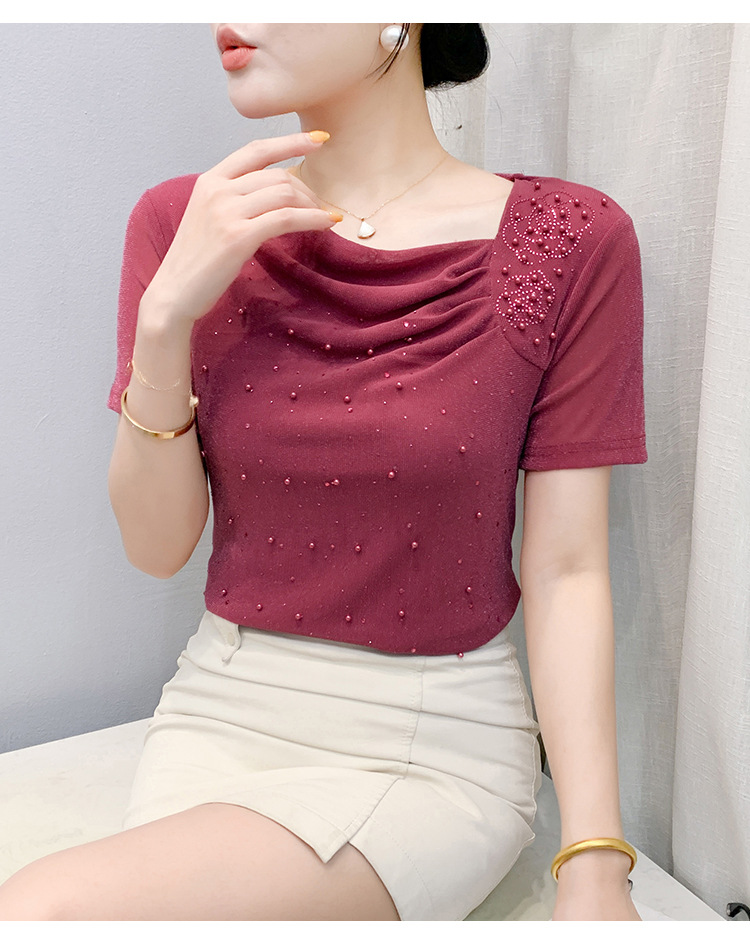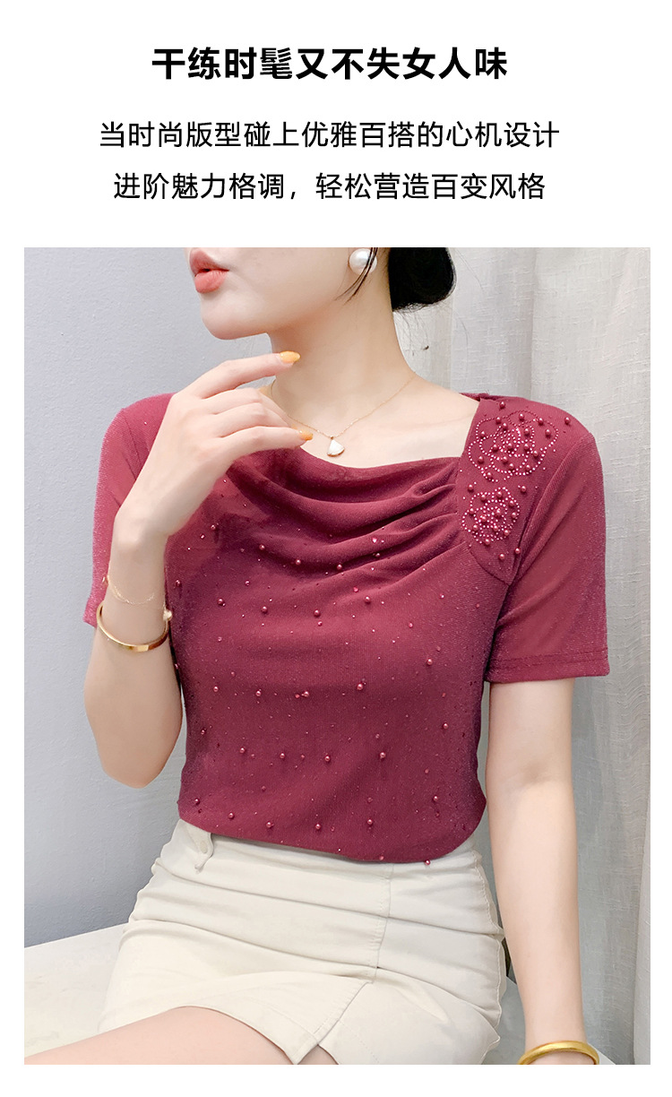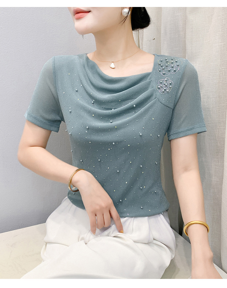 KQL 311H9039满天星烫钻斜领网纱短袖纯色洋气时尚休闲