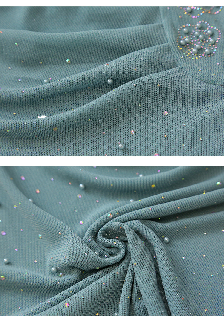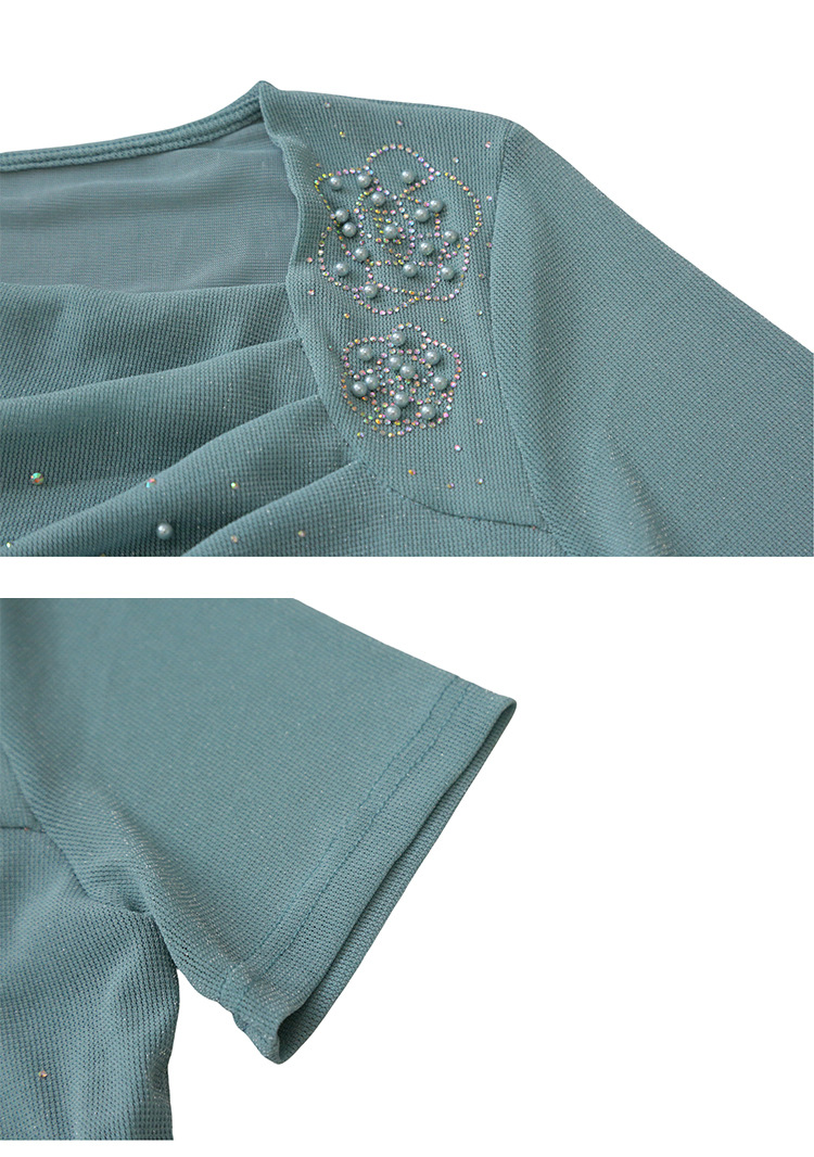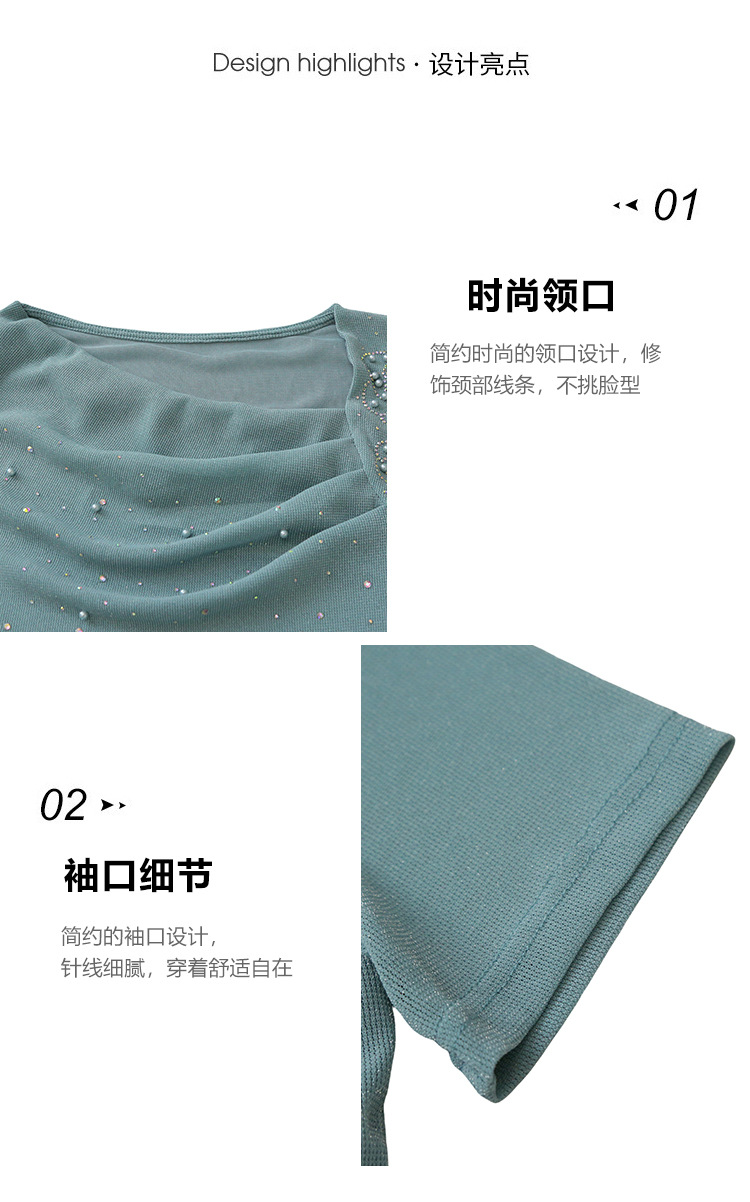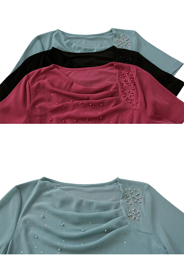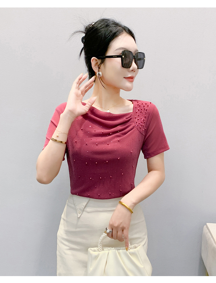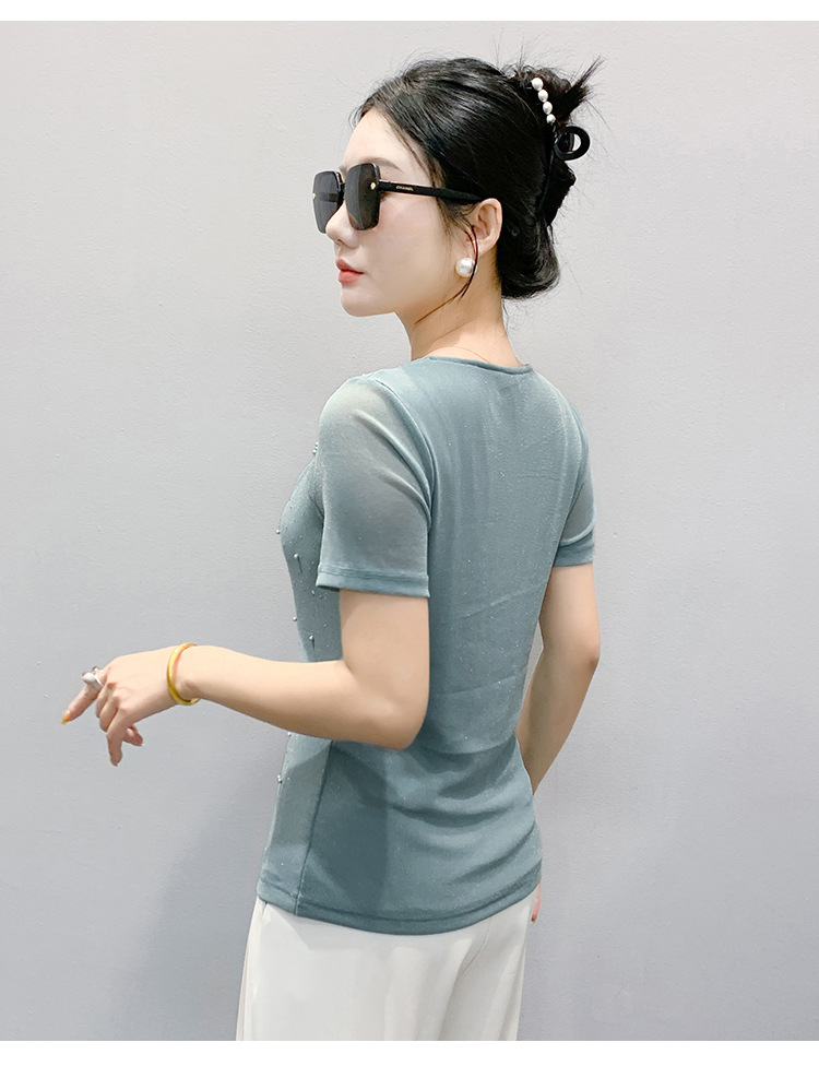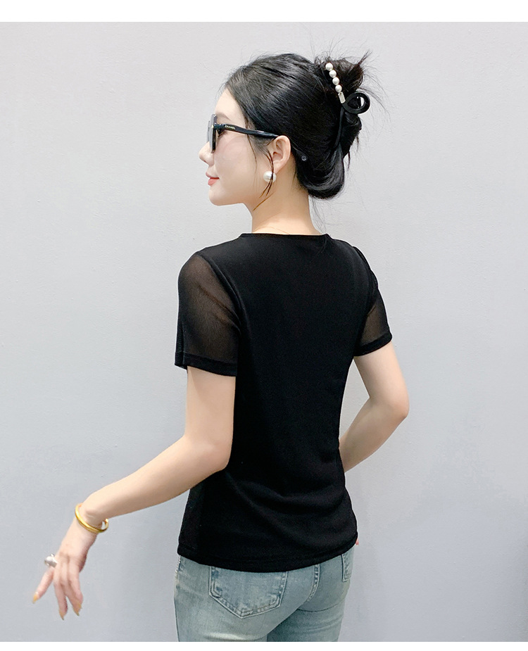 KQL 311H9039满天星烫钻斜领网纱短袖纯色洋气时尚休闲