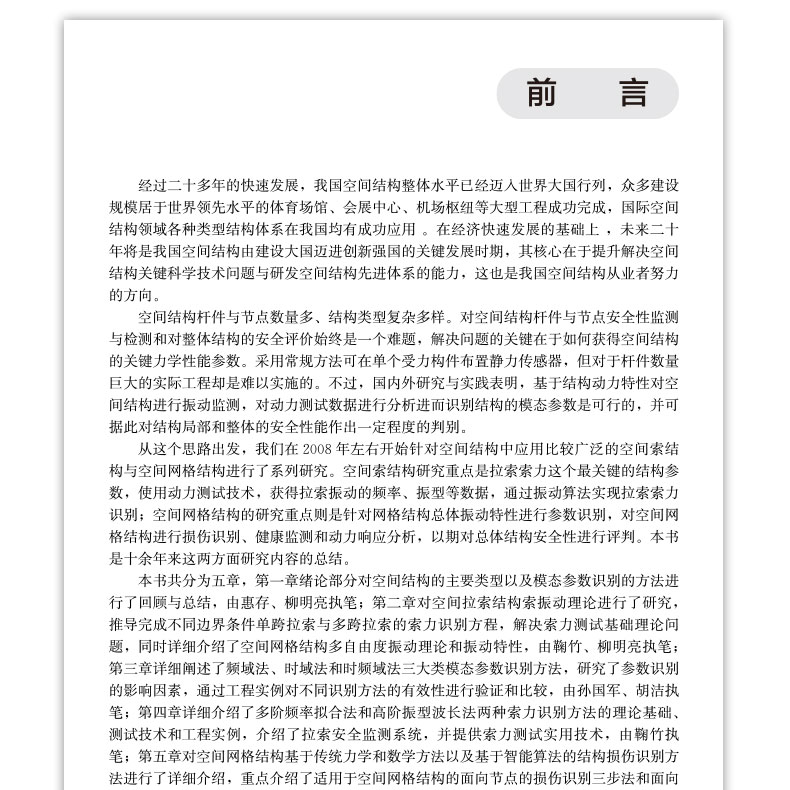 本书主要描述了空间结构振动特性与参数识别,文中对空间结构概述和参数识别方法、空间结构振动理论进行了概述,并且结合实际工程及试验数据,详细介绍了空间结构模态识别方法、拉索索力识别方法以及空间网格结构损伤识别等方面的内容,且对各种识别方法得出的结果与实际情况进行比较分析,并得出结论。 本书主要特色是结合作者工程建设及技术研究实践,总结索结构工程在建造、施工及索力安全评估方面的一些理论与技术成果,为从事索结构研究与施工的学者与工程技术人员提供有价值的参考。