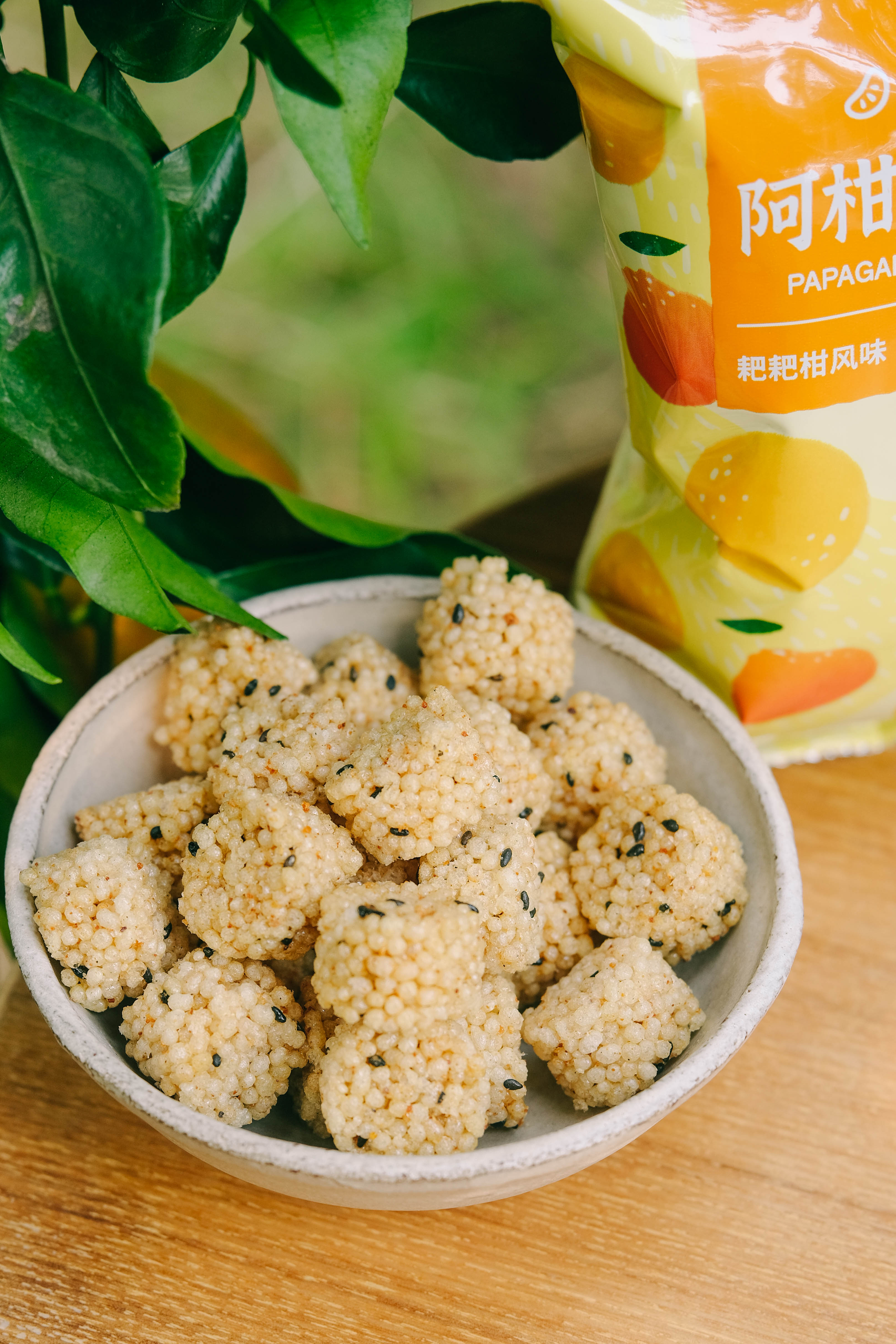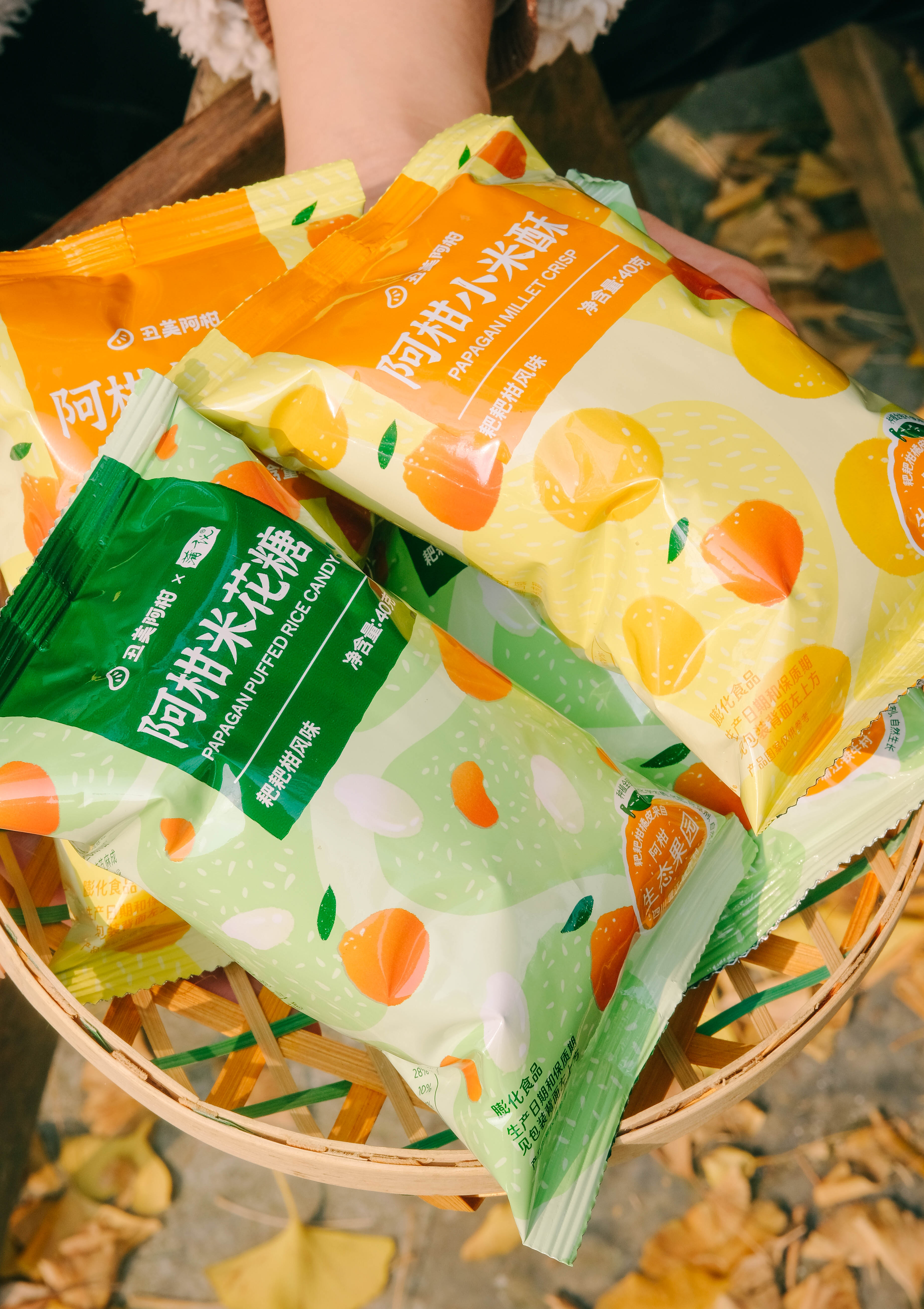 在成都蒲江县西来镇铁牛村的返乡青年们,除了生态种植耙耙柑,还将这一颗柑橘做出了各种有趣的、美味健康的加工品,米花糖和小米酥加入橘皮后,又附带清甜果香。