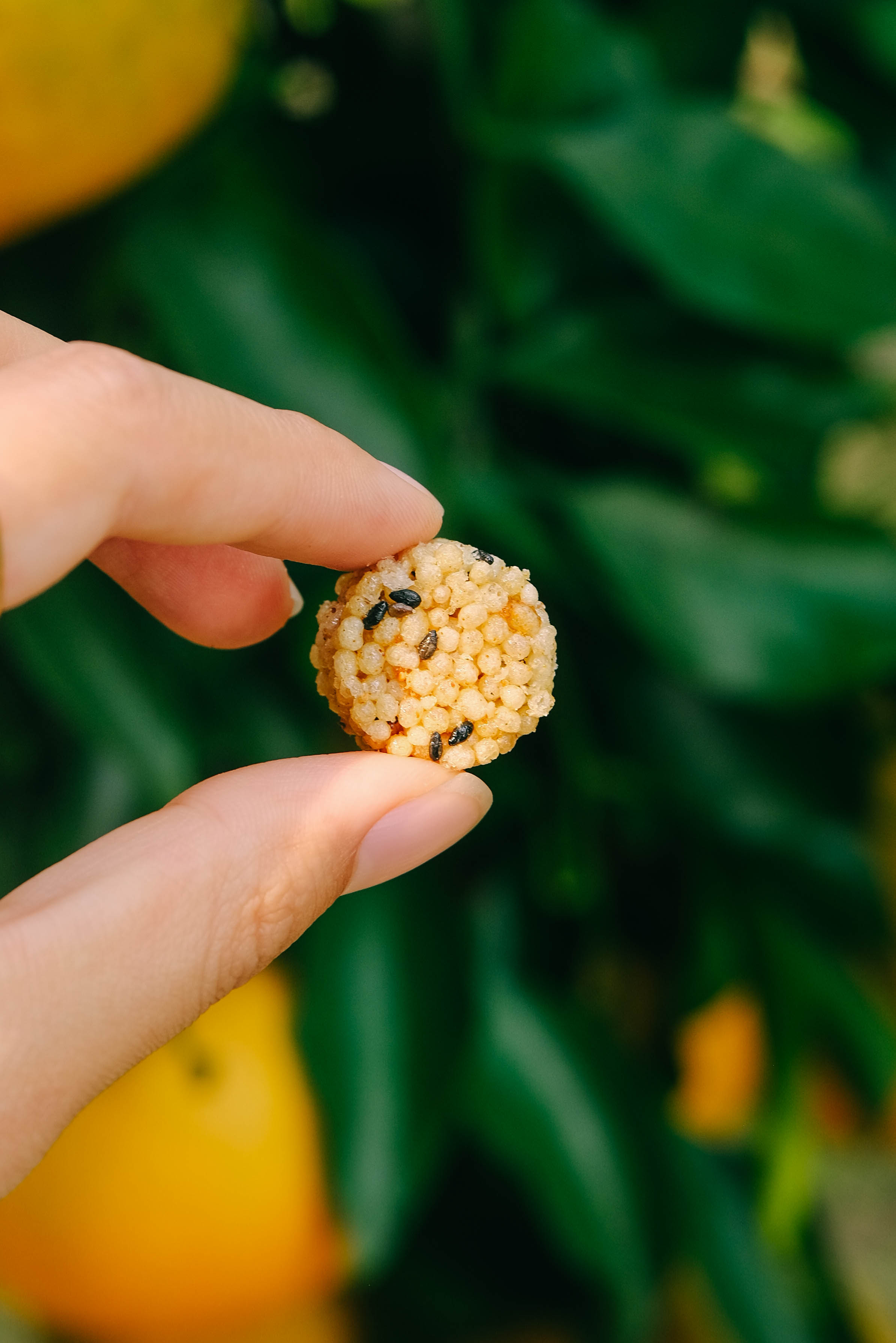 生态种植的耙耙柑油包丰富,内含芳香精油,香气充盈,在其成熟季新鲜采摘,手工剥皮烘干,研磨成粉。赋予米花糖清甜果香,风味别致。