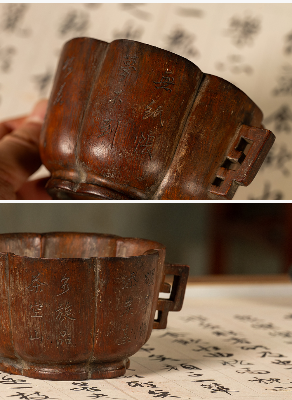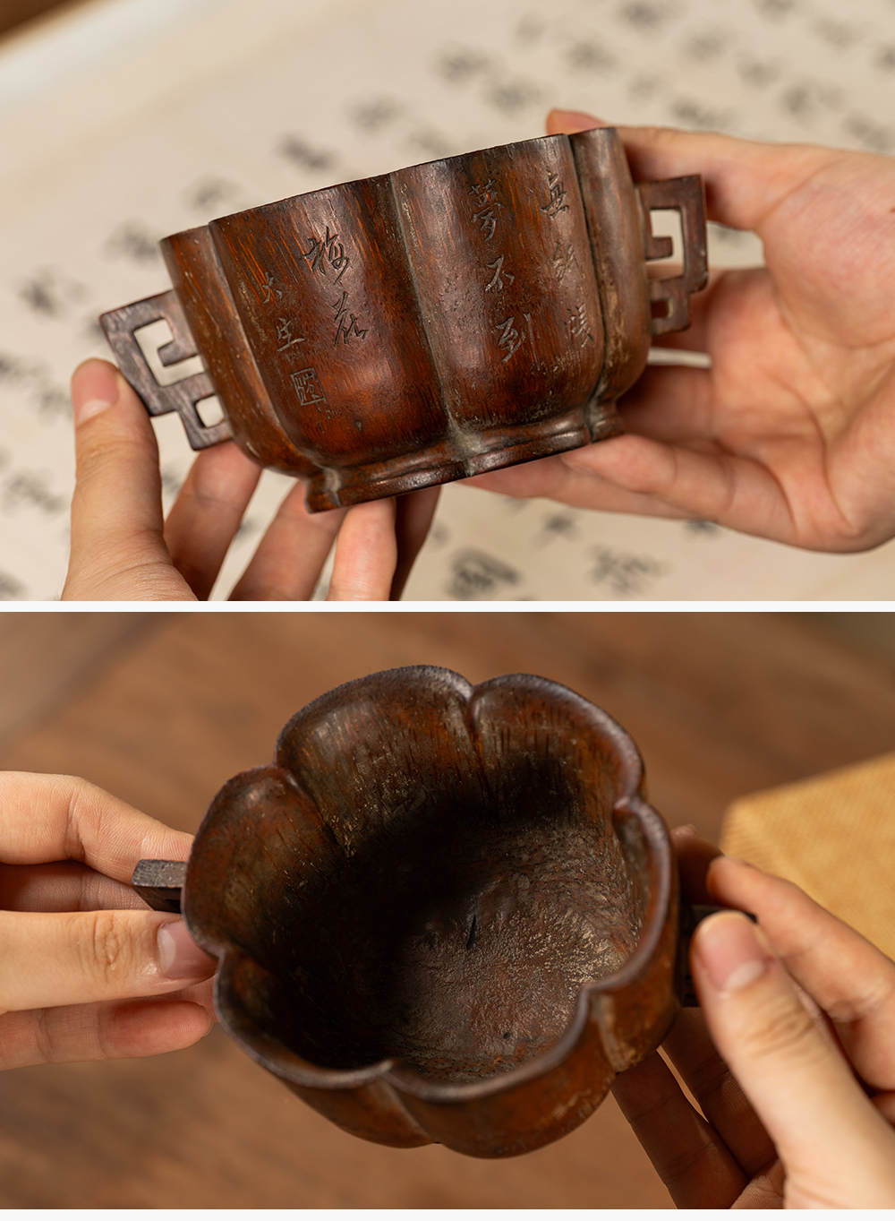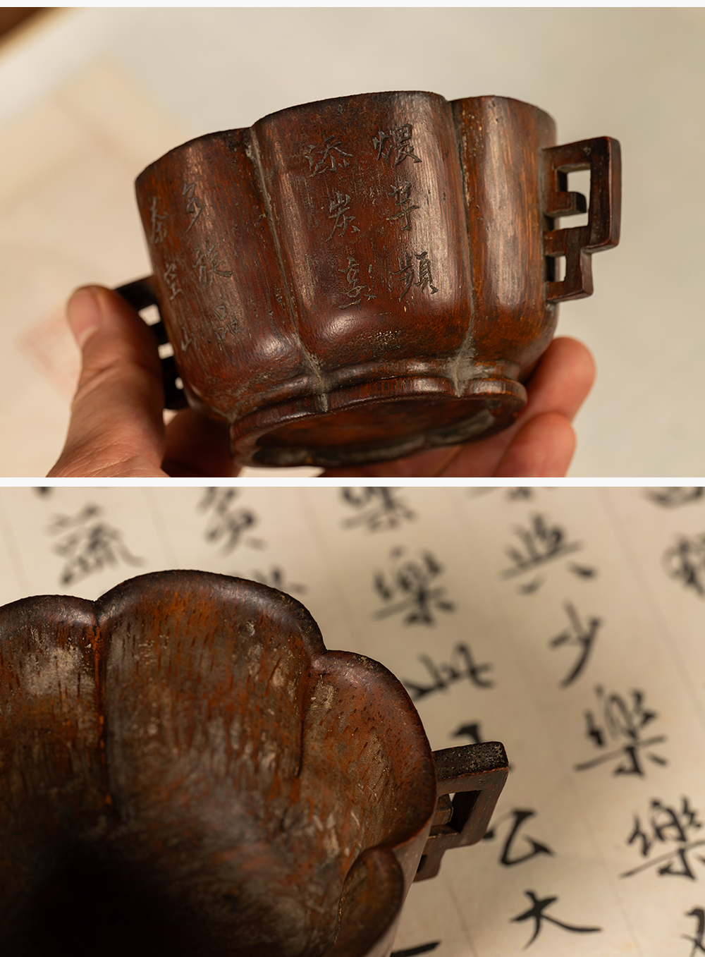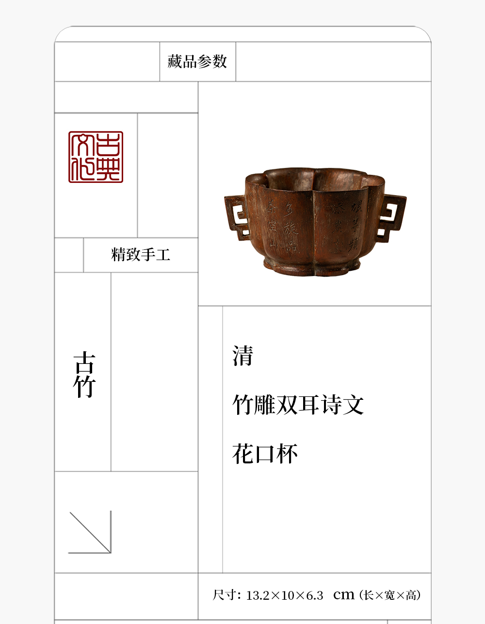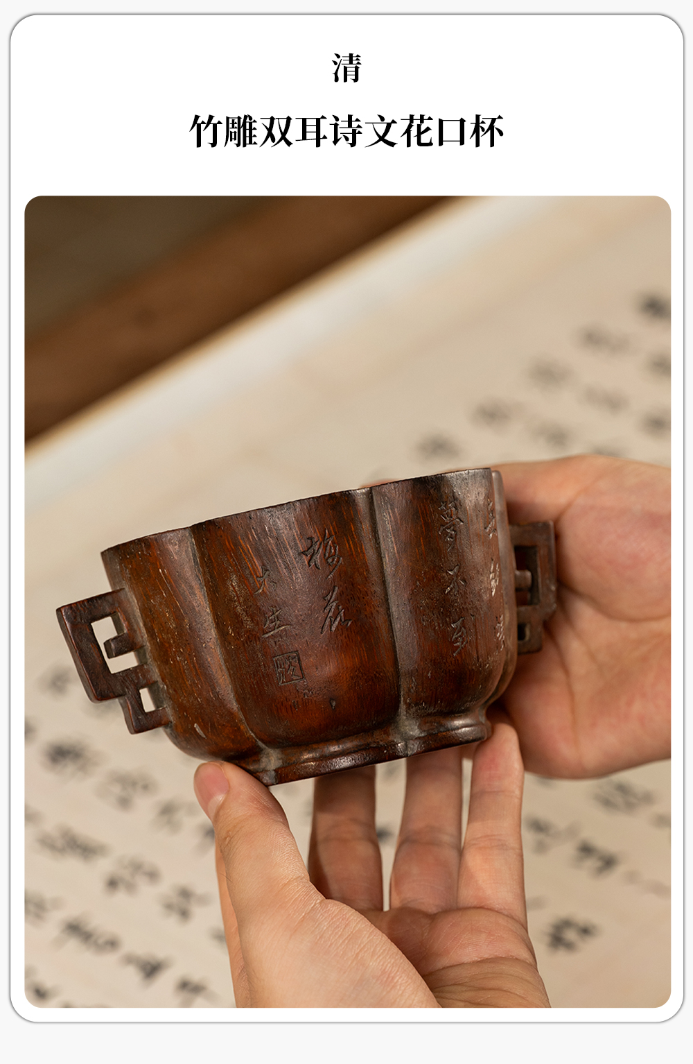 清 竹雕双耳诗文花口杯
