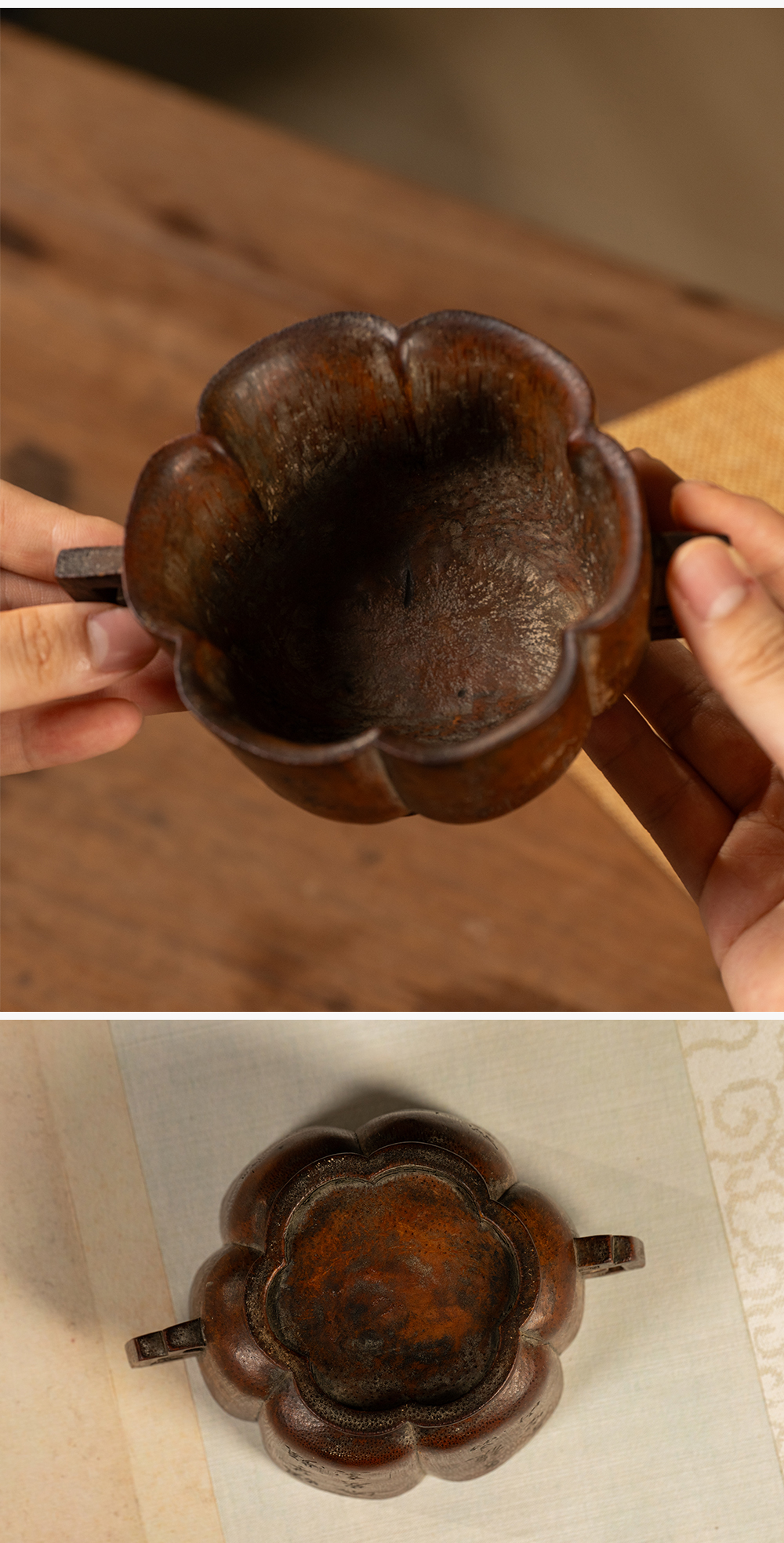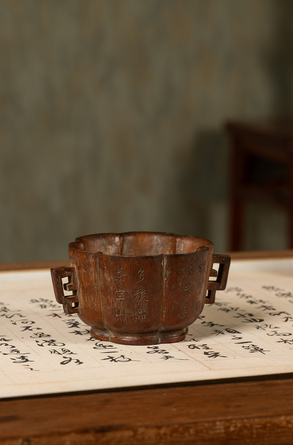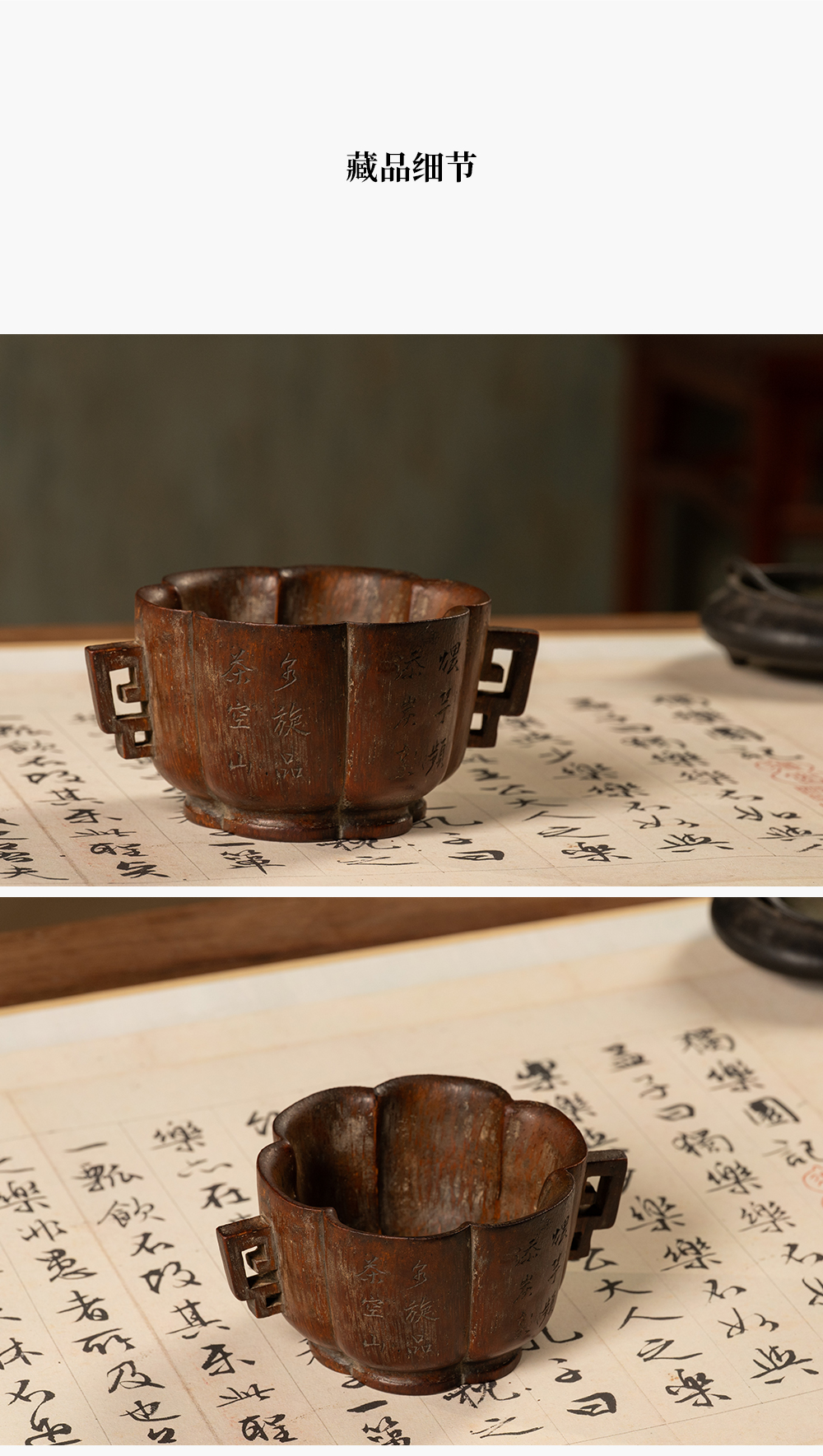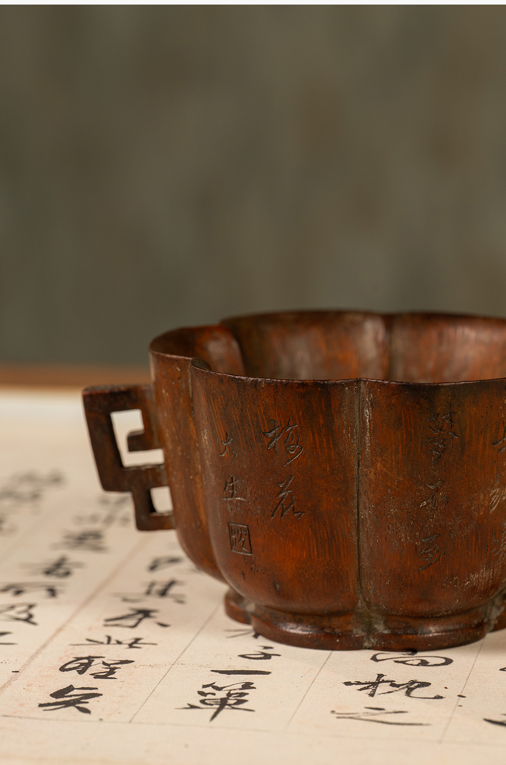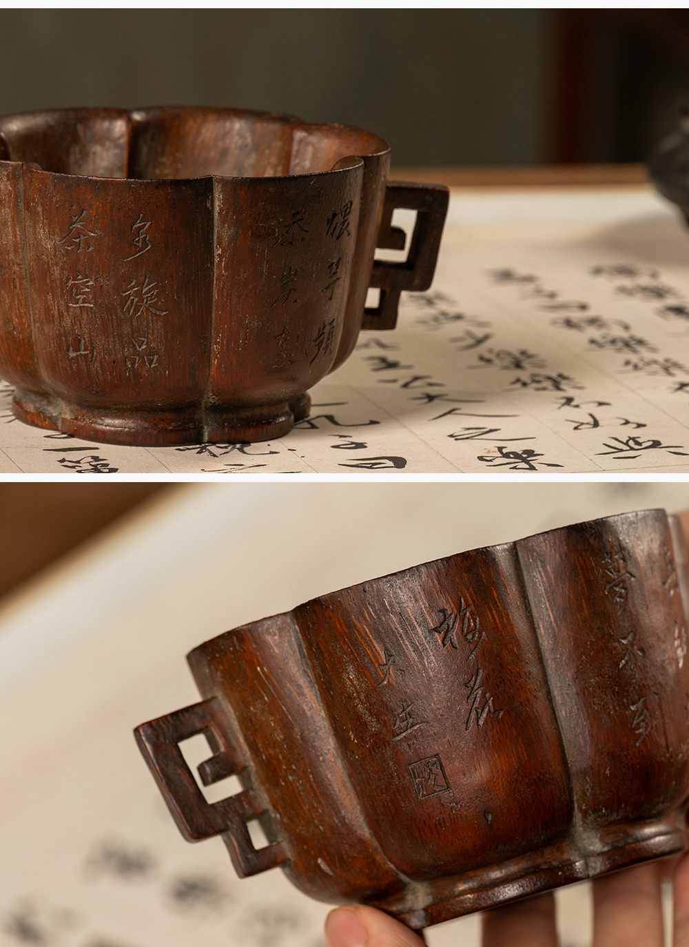 清 竹雕双耳诗文花口杯