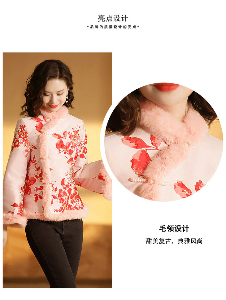 AYK-提花长袖毛边立领夹棉唐装上衣女