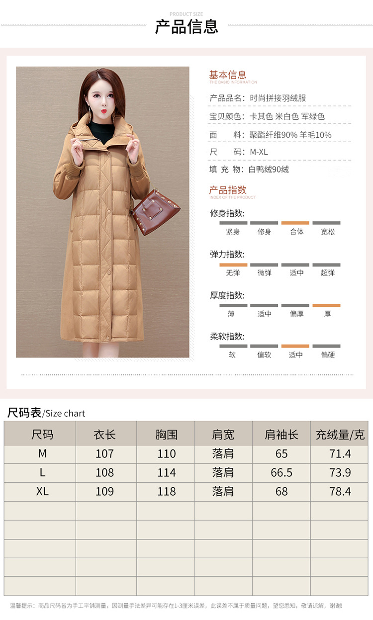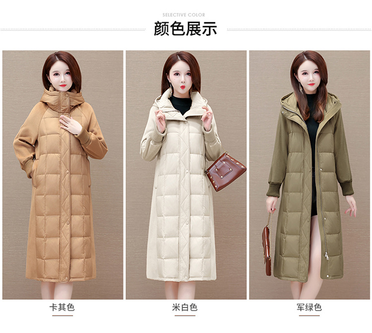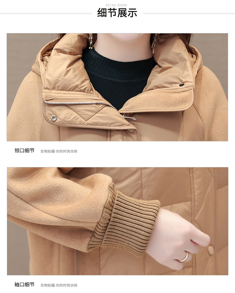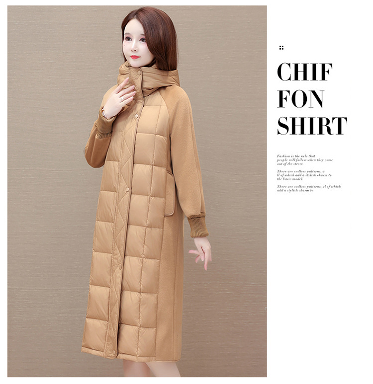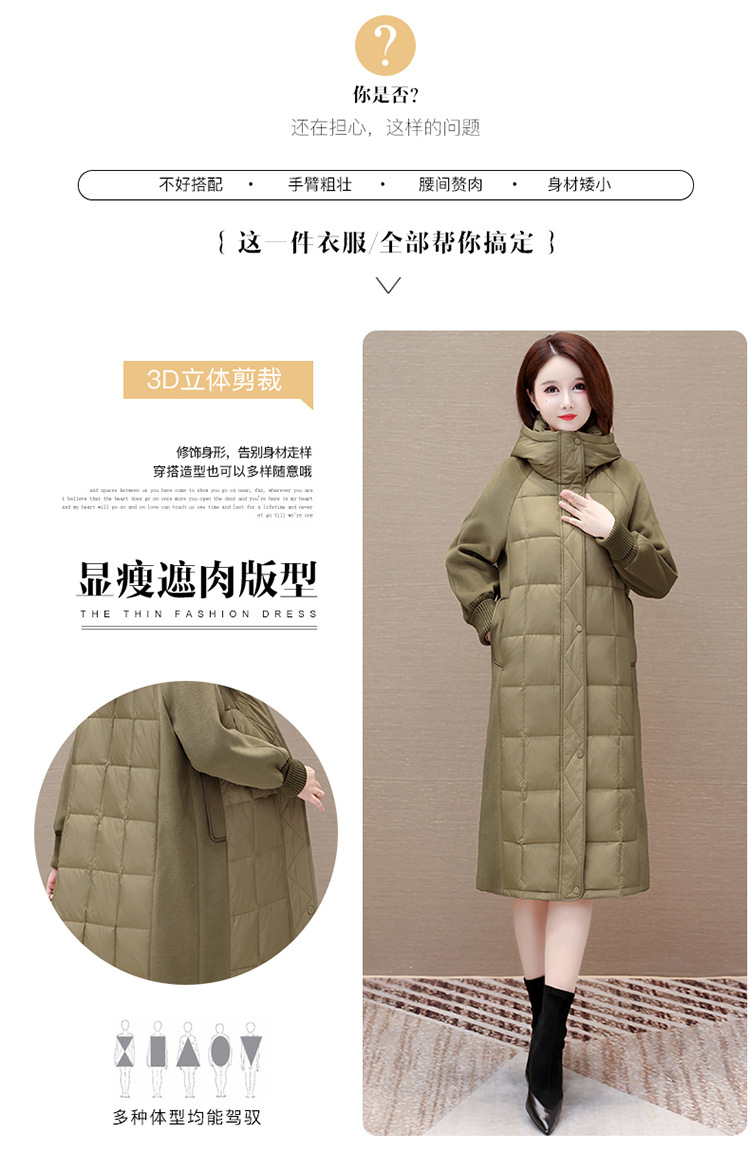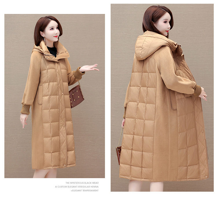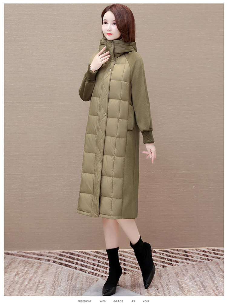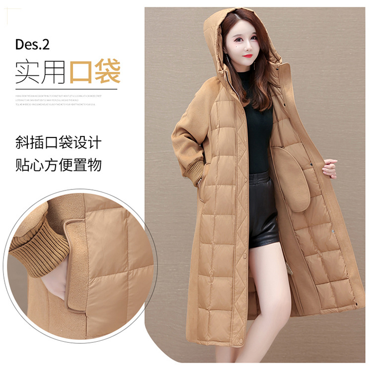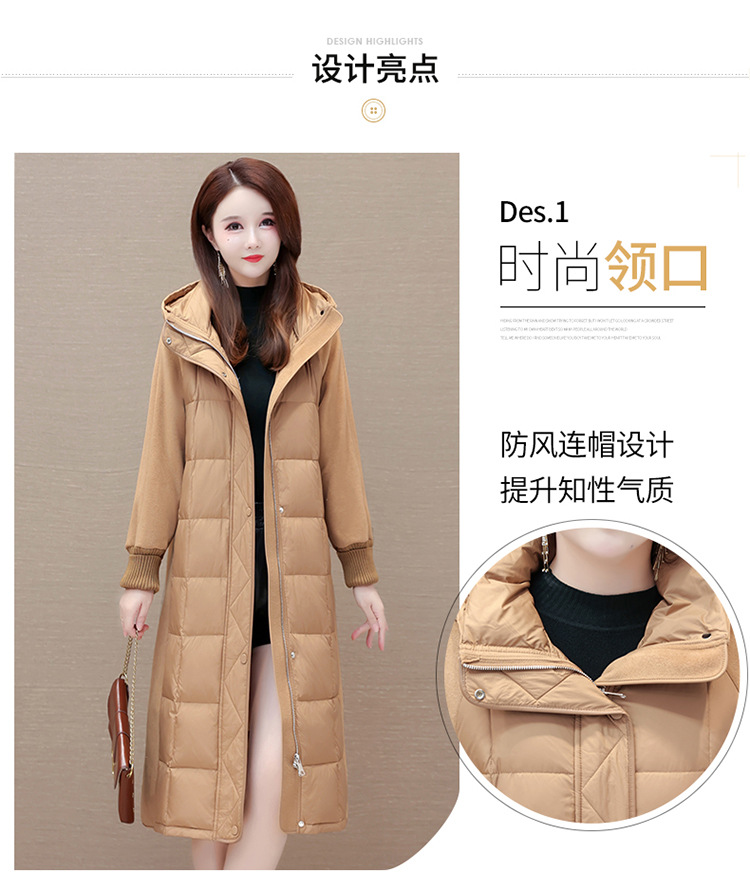冬款长袖连帽时尚鸭绒外套,长款毛呢拼接洋气时髦保暖羽绒服QYM-XYKL-21125-L