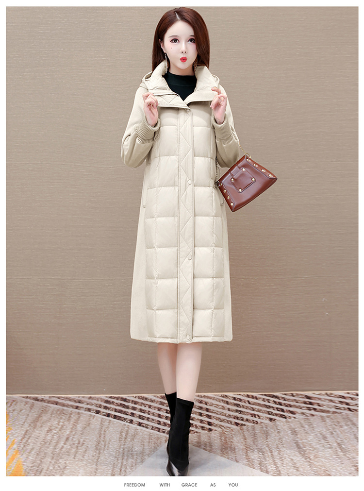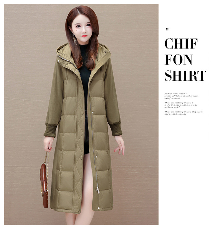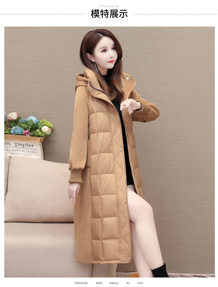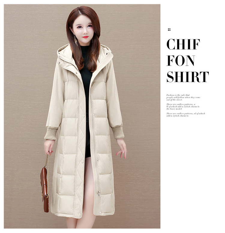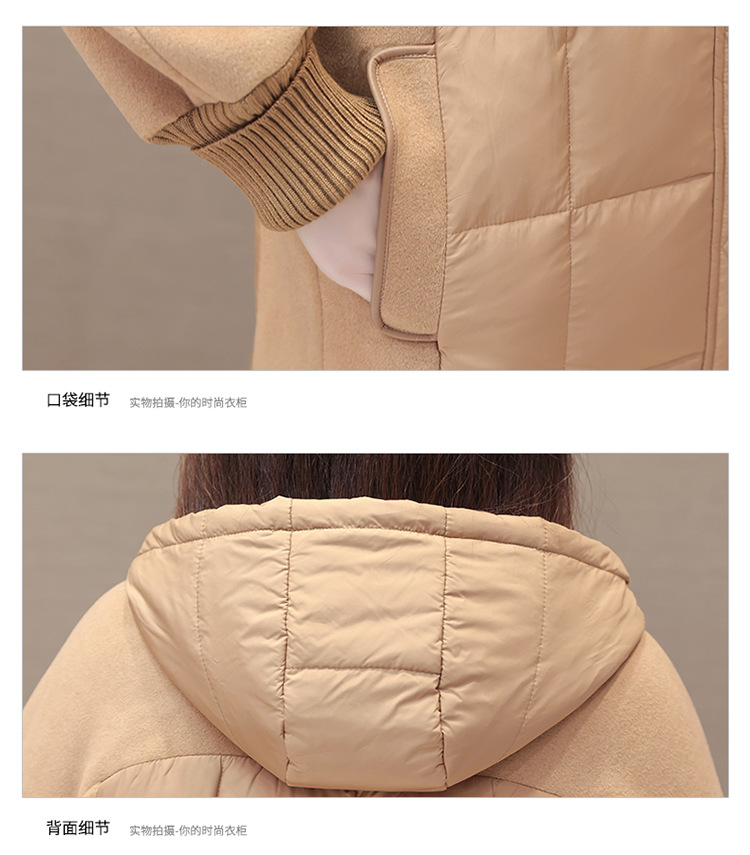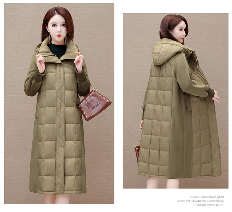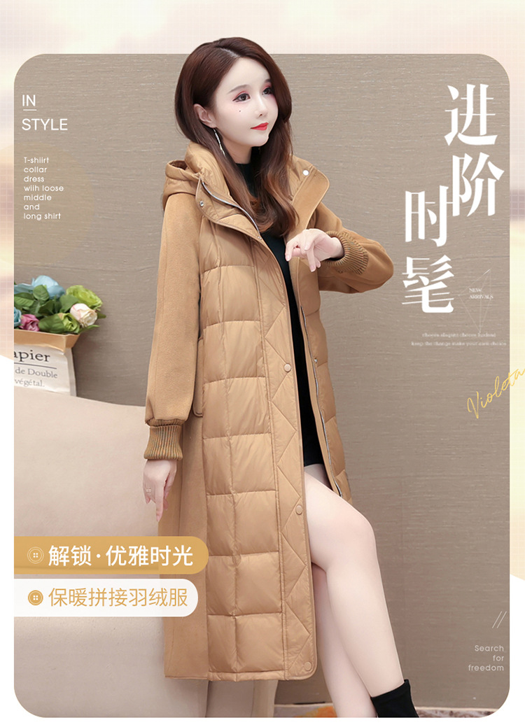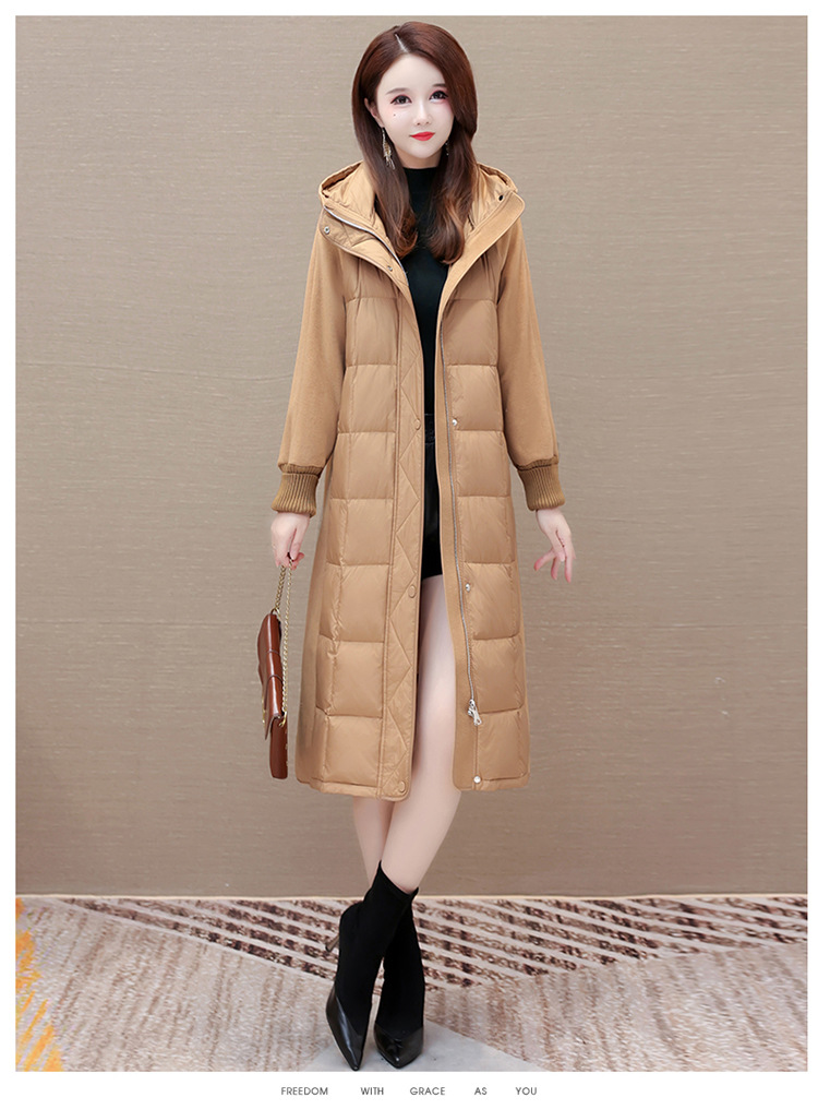 冬款长袖连帽时尚鸭绒外套,长款毛呢拼接洋气时髦保暖羽绒服QYM-XYKL-21125-L