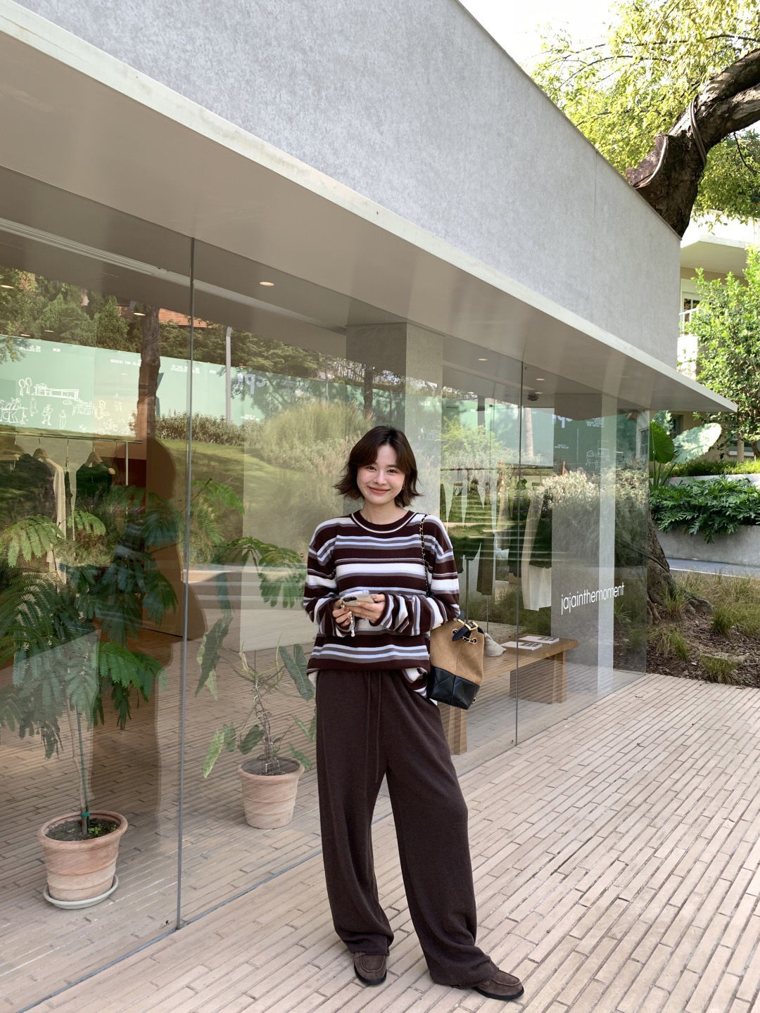它是由蓝色灰色咖色组成 搭配咖色系羊毛裤 慵懒舒适