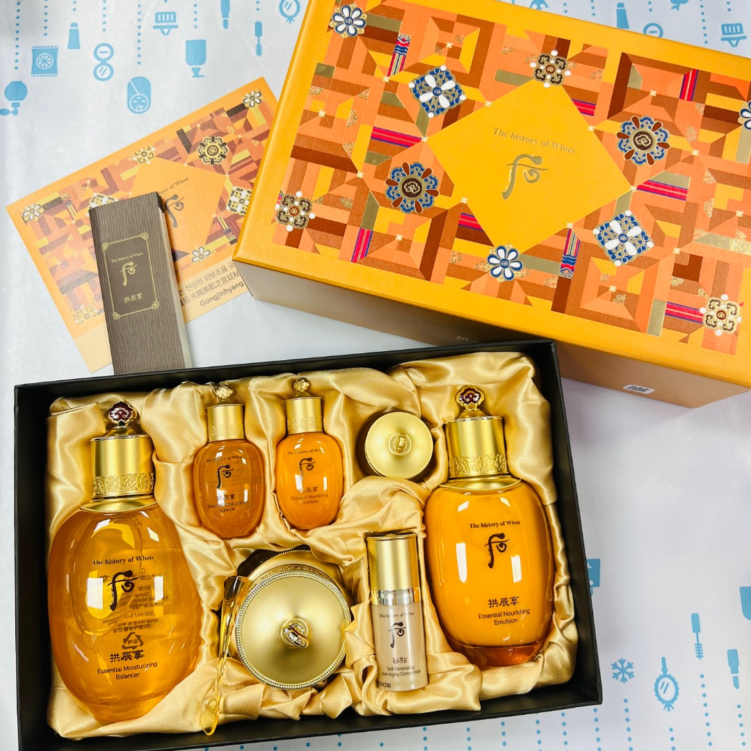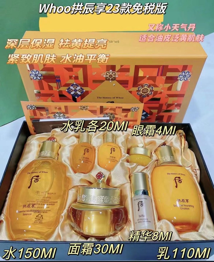 👑WHOO后拱辰享23年新款免税3件套 🌱蕴含东当归、麝香草等珍贵成分等拱辰精萃 💎赋予肌肤水润营养、直击干燥缺水、水油不均等问题 💦轻松摆脱肌肤干渴烦恼,焕现清透弹润的华美气韵 ✅有效:深层保湿、去黄提亮、紧致肌肤、水油平衡 ✨又称小天气丹,适合油皮泛黄肌肤✔️ 【套盒包括】:水(150ml+20ml)+乳(110ml+20ml)+面霜30ml+精华8ml+眼霜4ml