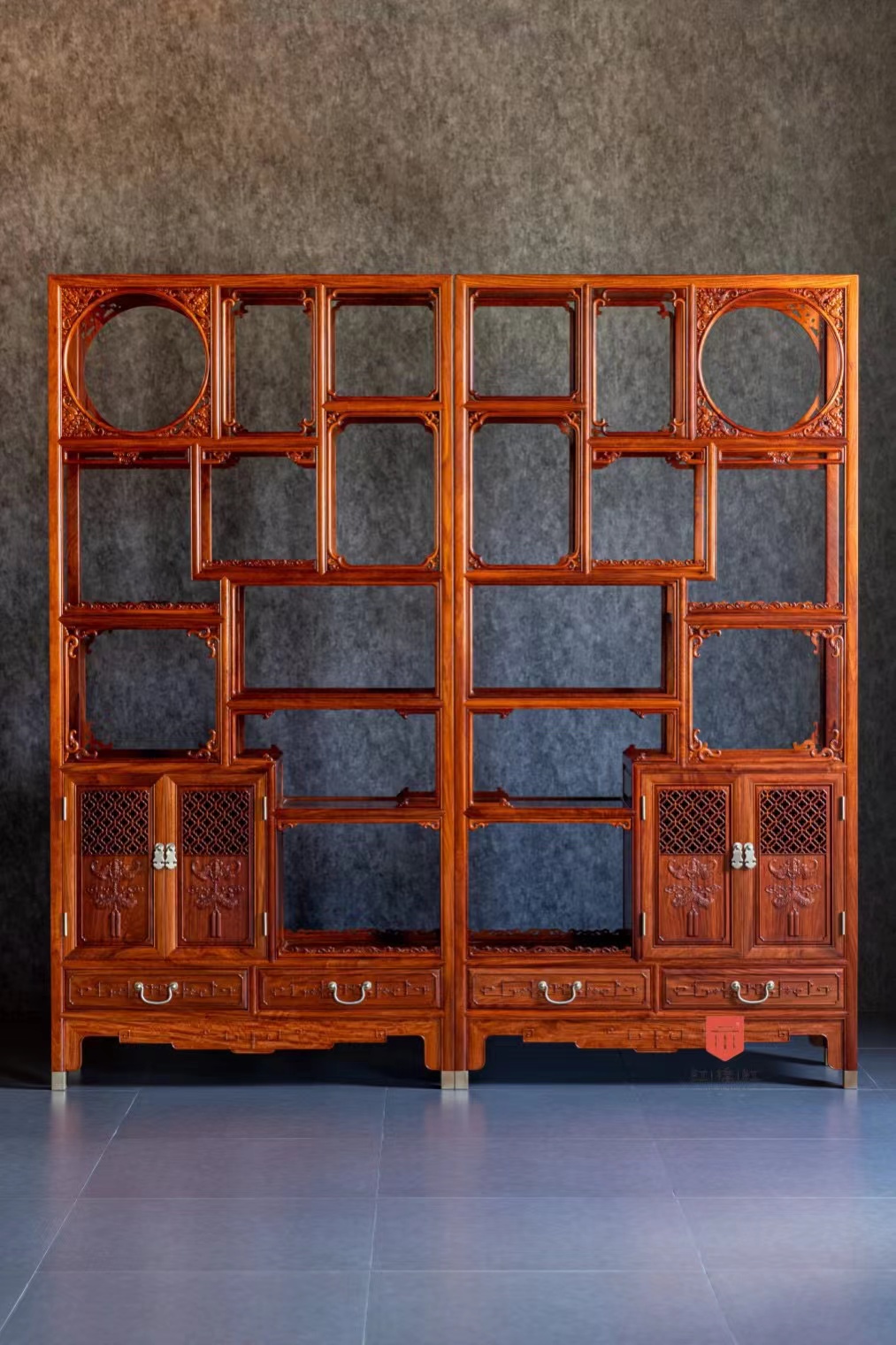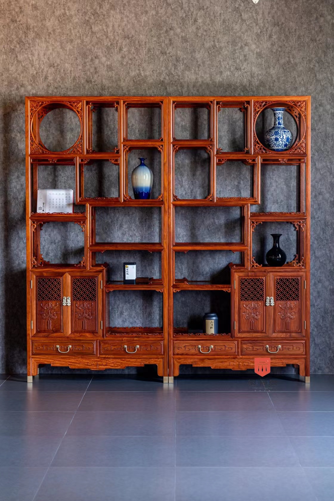 博古架一般成对或成排陈设,兼有空间隔断功能。