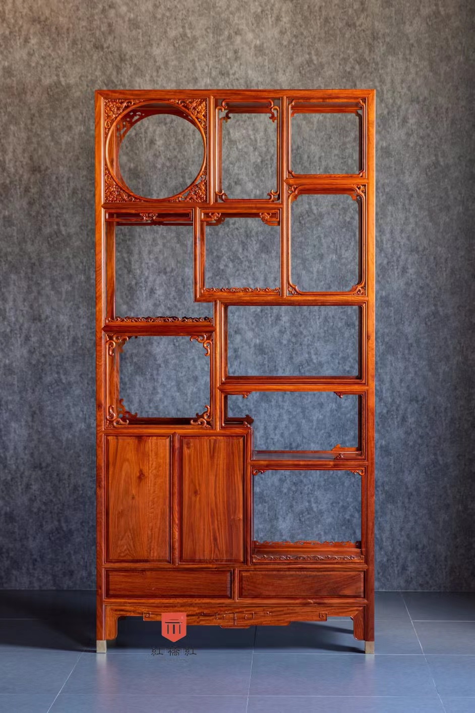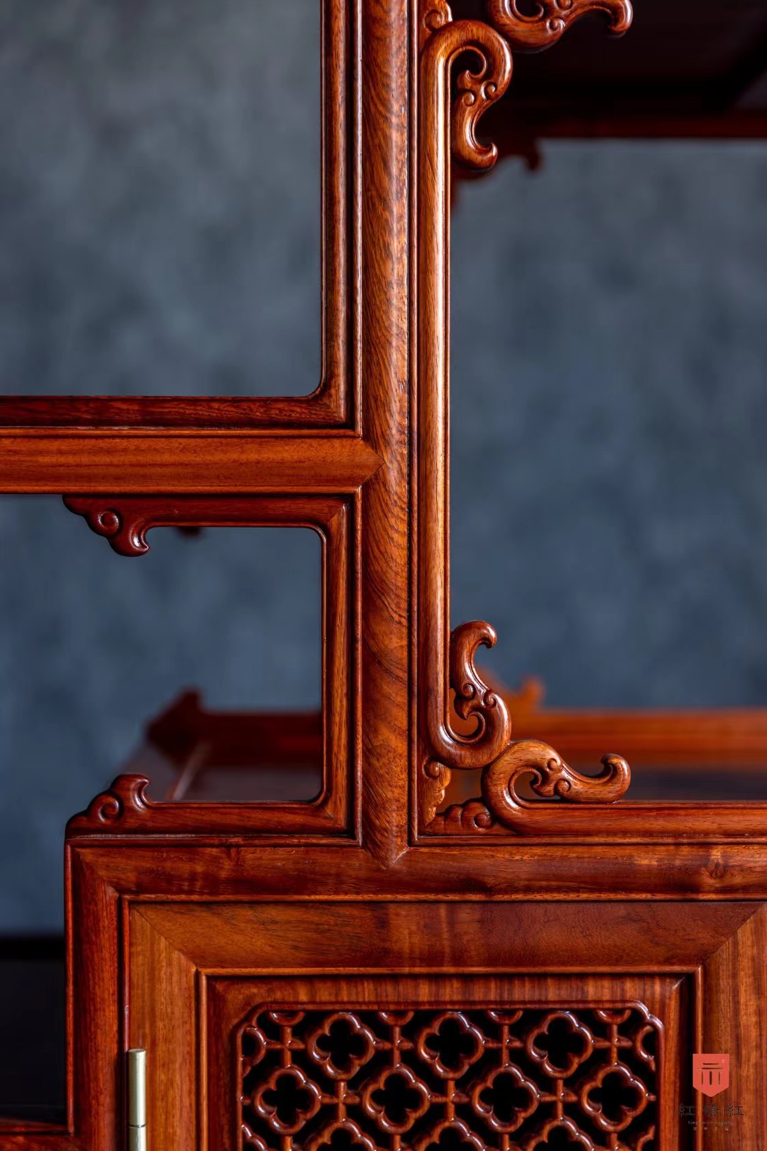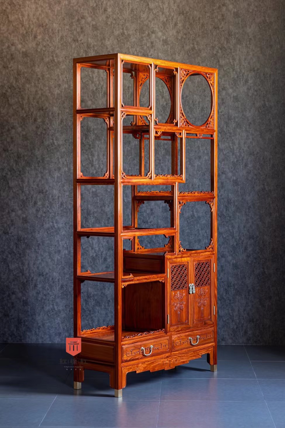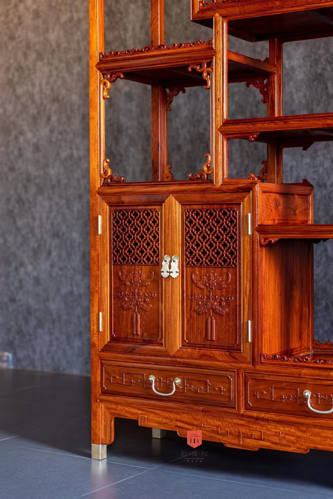 柜门镂空十字海棠纹,浮雕福庆纹,双屉做底,整体十分宝气,与《博古幽思图》中的博古架颇有神似之处。