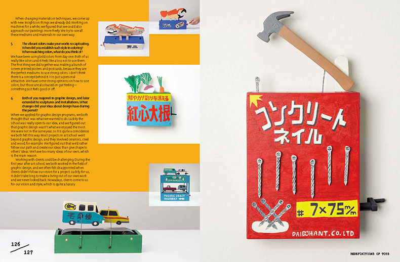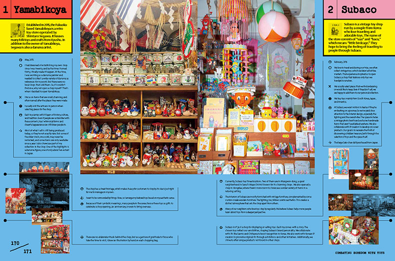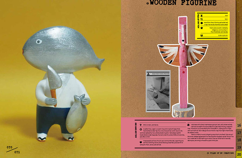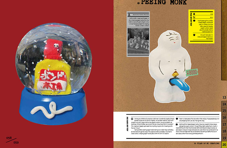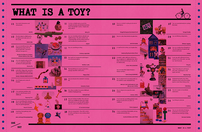 Toys are not limited to paper airplanes, sofubis or figures. Redefining the concept of toys means opening up new possibilities for mediums of toys. From miniature figures to full-scale installations, anything that evokes a positive emotional response can, in essence, be a toy. The editorial team interviewed 8 groups of designers and artists from 7 countries. They choose various mediums: paper mache masks, conceptual toys made by discarded objects, Russian nesting dolls, hand-cranked whirligigs, large-scale wooden sculptures, building blocks, spinning tops, and miniature models. With various mediums, they convey the same message to people: small though they may be, toys carry immense power.