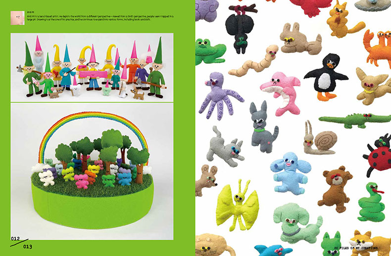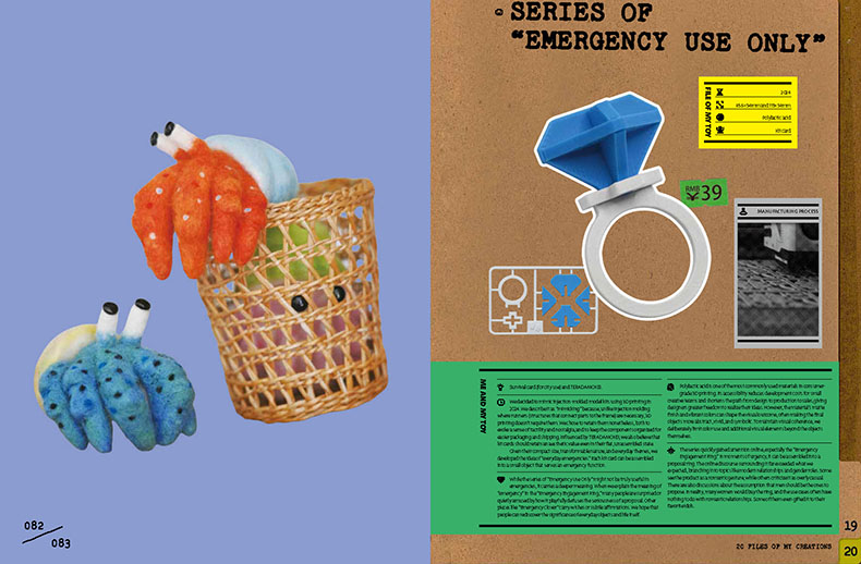 创作者除了构思概念,还需要将概念“落地”。材质的选择在这时显得尤为重要,因为设计师的情感和信息大多可以借助材料来传递。本期采访的20位玩具创作者选用了不同的材质,包括毛毡,软胶,防撕裂尼龙,樱桃木、榉木、椴木等木材,尼龙线、涤纶线、腈纶线等线材,陶土,毛绒,纸黏土,软陶,聚乳酸(PLA)等材料。他们利用材质独有的特质,激发读者的情感共鸣。通过他们的分享,读者也可以逐一了解材质的特性,把握不同材质的表达潜力。