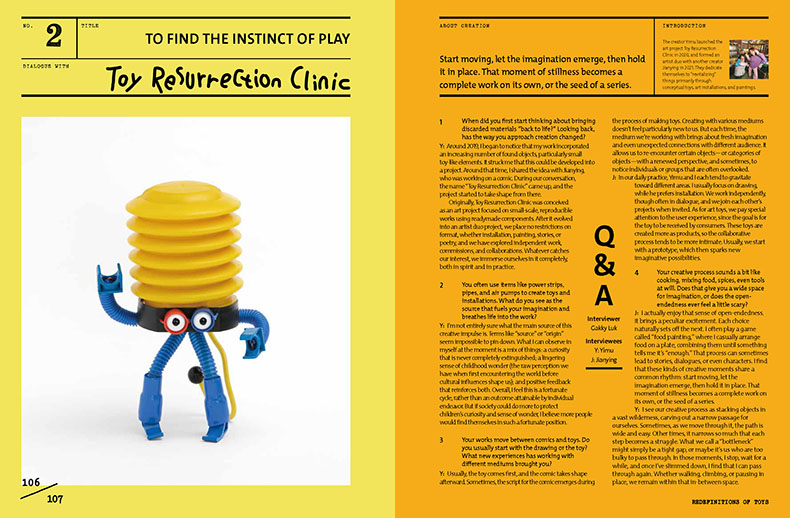 本期编辑部采访了20组来自全球的玩具创作者,其中不乏设计行业、广告行业等创意从业者的身影。从构思玩具概念到落实制作,他们进行了逐步拆解与分享:尺寸、材质及其特点,玩具原型,材料,定价,制作过程;设计灵感,创作的时间及契机,想通过玩具传达的情感,彩蛋信息等。每一款玩具背后,都有不同的创作故事。本期20位创作者教大家从0开始做玩具,实践设计师多线发展的可能性。