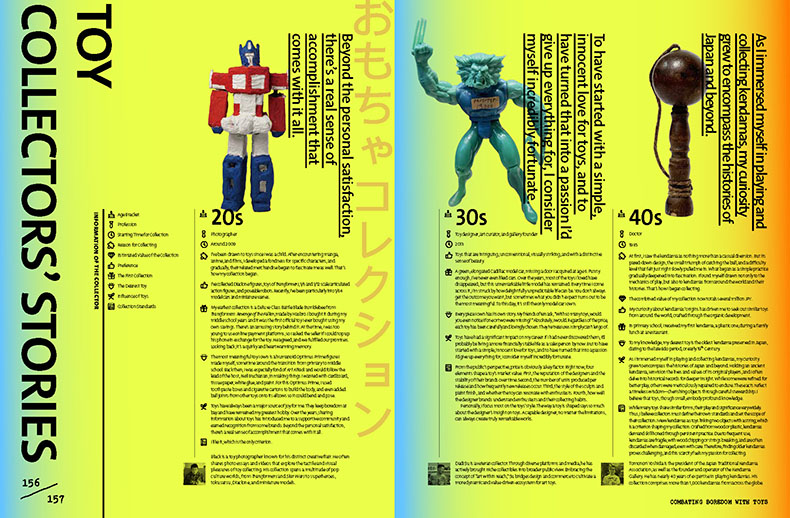玩具是人们对抗无聊的第一要义。本期呈现了玩具收藏家的视角,了解他们收藏玩具的契机,收藏过程中发生的趣事、收藏标准等。同时,编辑部邀请了本期的设计师分享他们的玩具收藏。设计师们纷纷拿出私人收藏,让杂志瞬间变成玩具展。一起开箱他们的玩具柜吧!