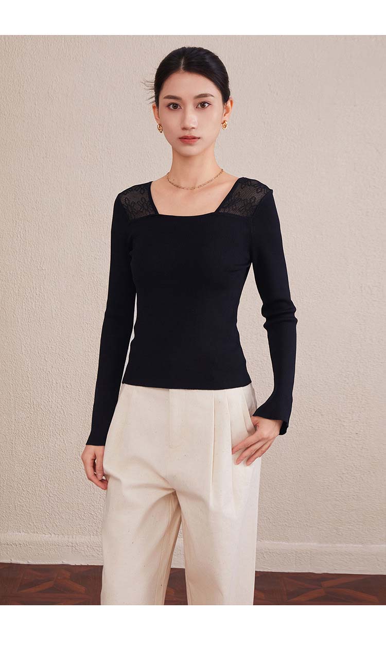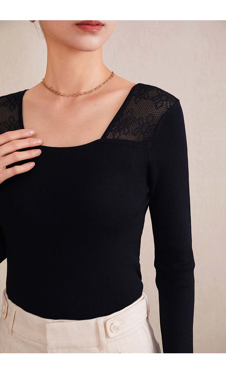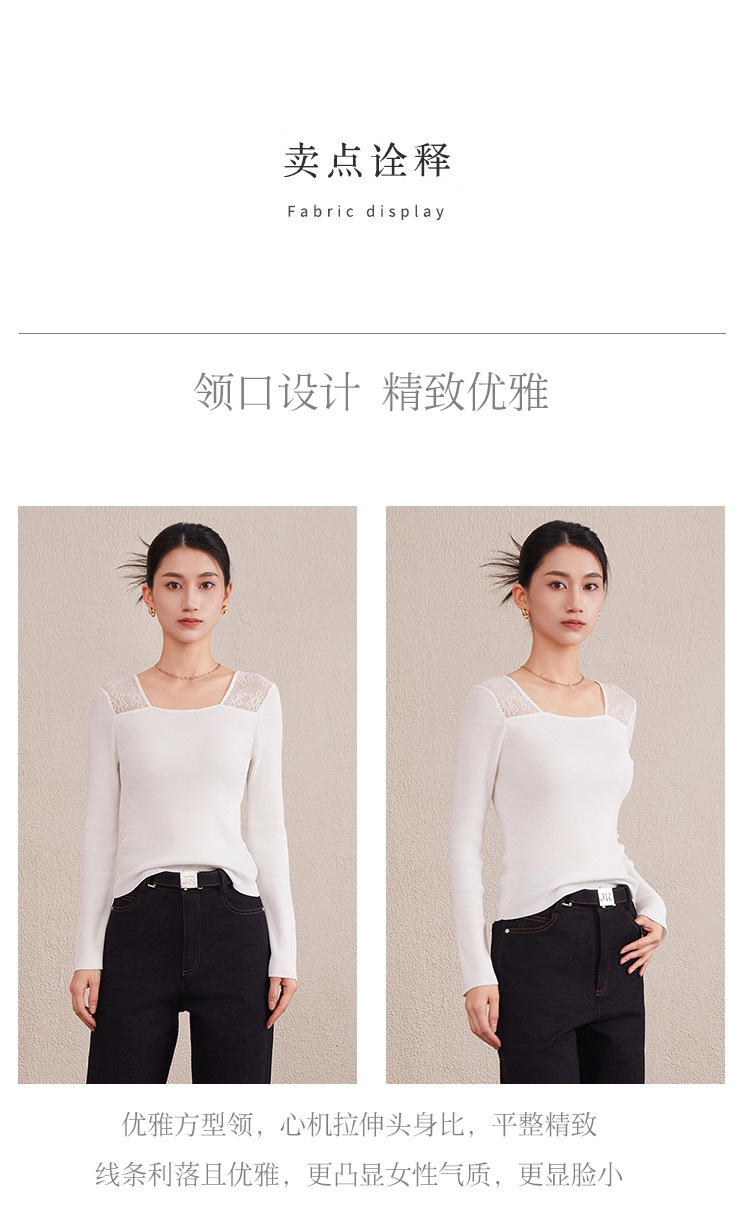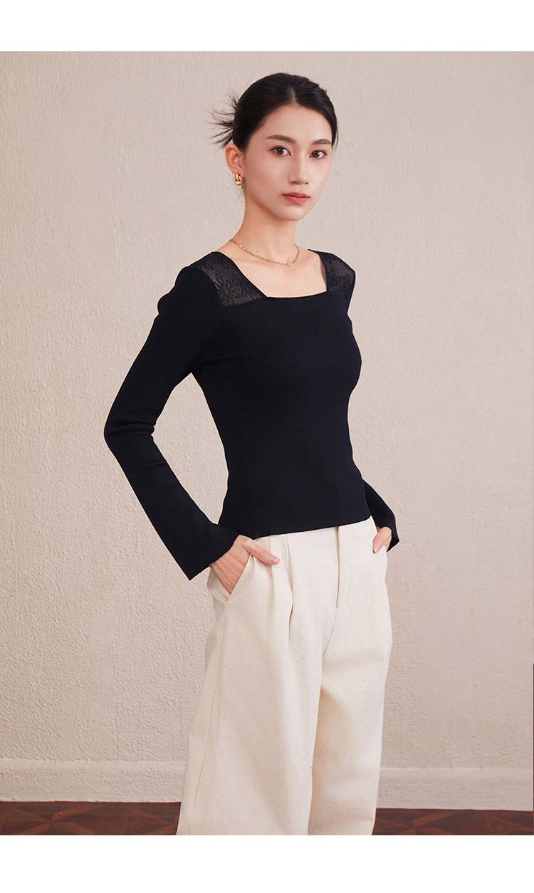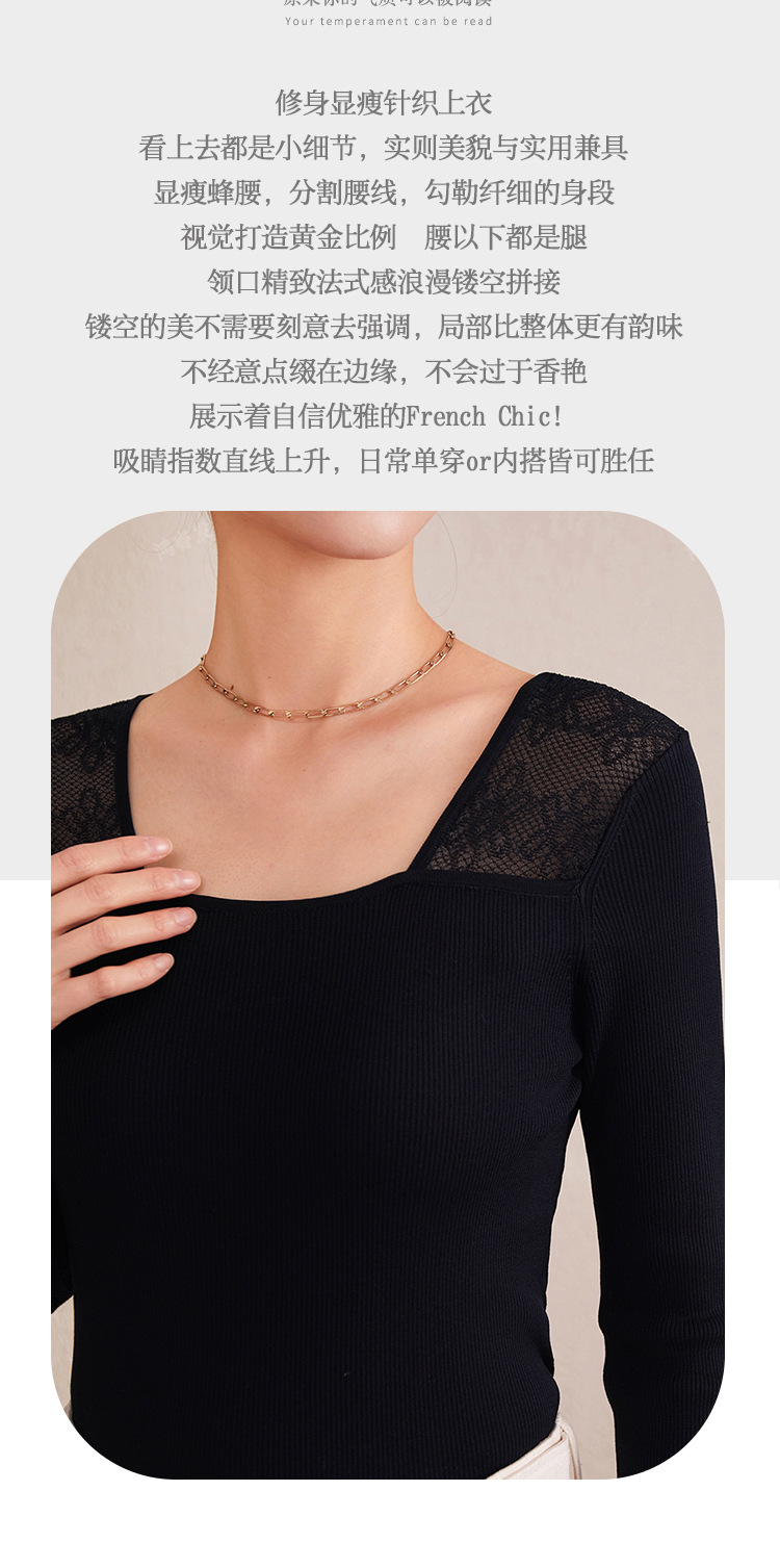 【自】全新升级【铂金会员238/天猫319/差价81】(81911) 洛诗琳25春季新款设计感方领拼接蕾丝长袖薄款纯色针织上衣