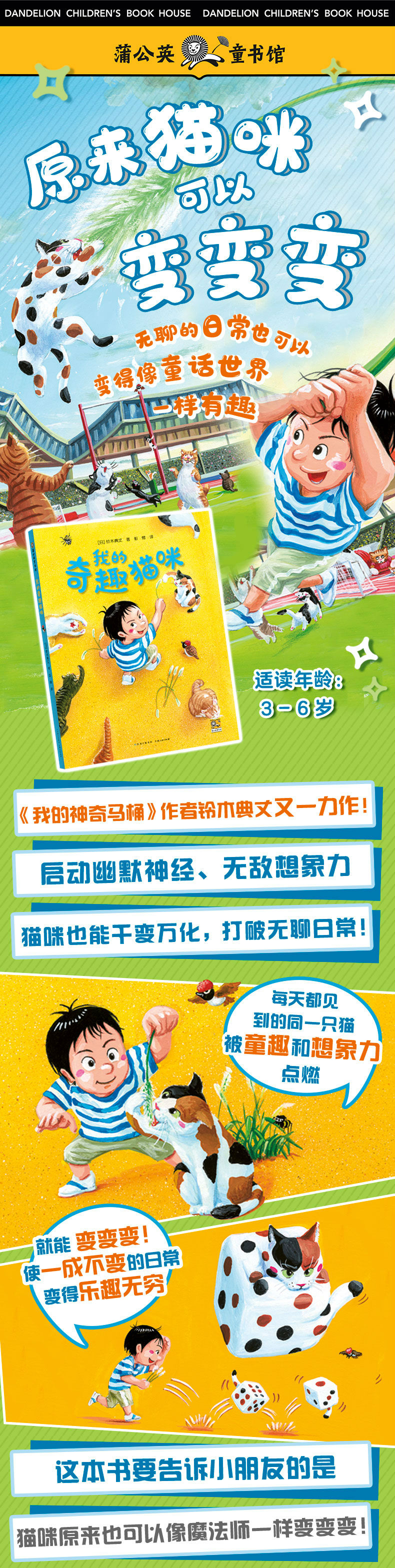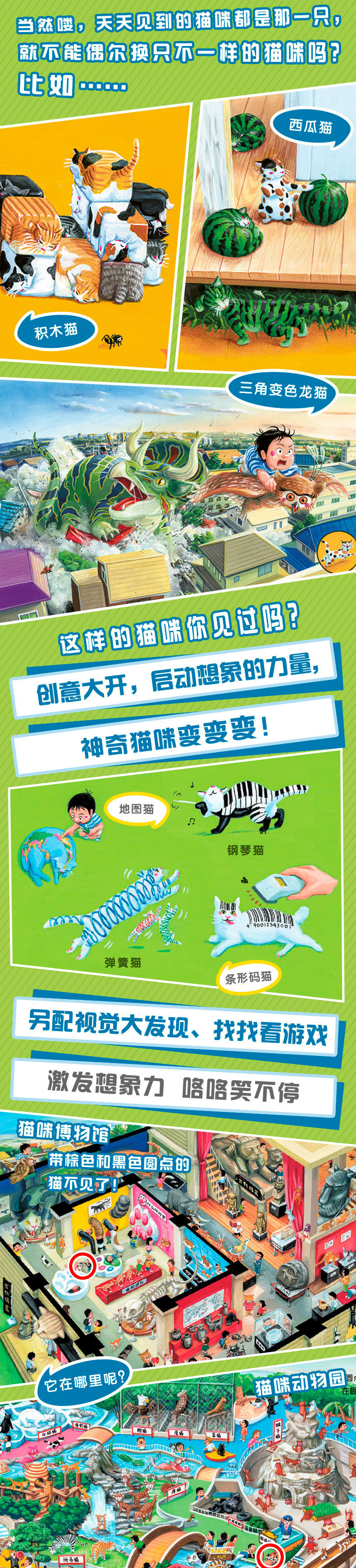 本书延续《我的神奇马桶》系列图画书幽默、想象力爆棚的风格,把每天都见到的猫咪千变万化,变成了各种各样的猫咪,比如小岛猫、西瓜猫、方块猫、透明猫……咦?猫咪不见了!它跑哪儿去了?快来找找看吧!