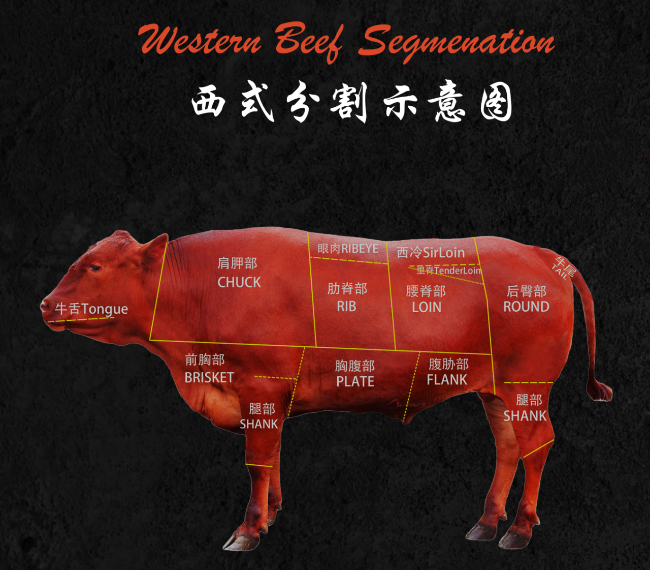 牛按照如下示意图分割,我们挑选了部分部位给大家上架,上脑、眼肉、西冷、小排等部位做成了牛排,除此之外还有牛腩粒、牛肉片、牛肉串等。
