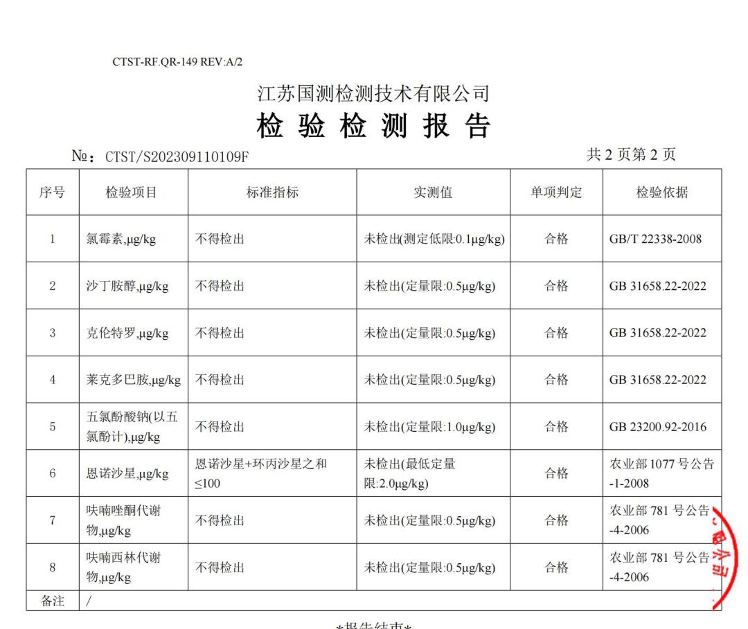 针对呋喃类、沙星类、氯霉素类、杀虫药、饲料添加剂、瘦肉精做了针对性检测,无检出。