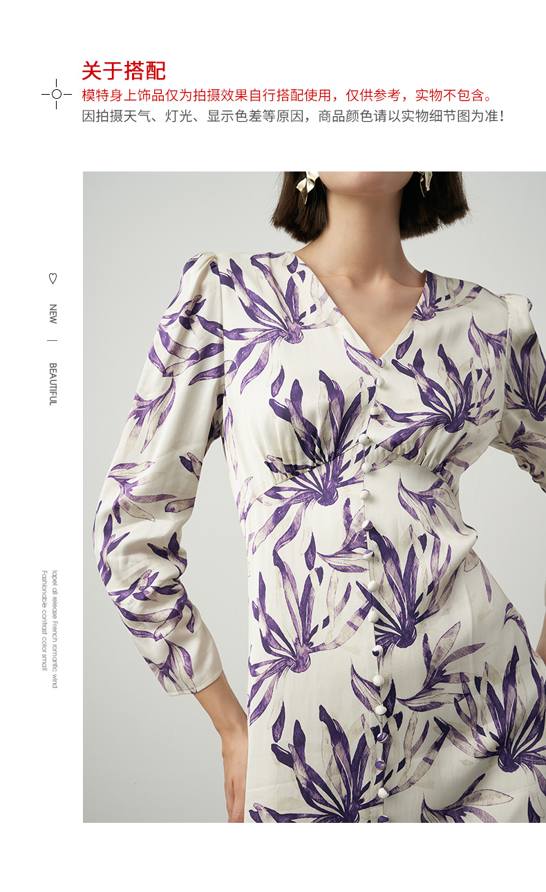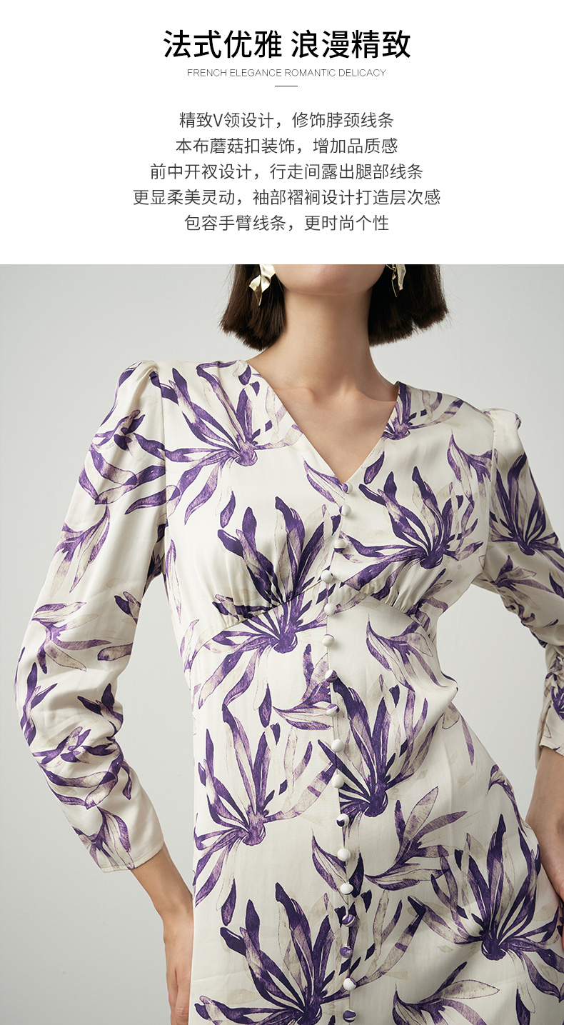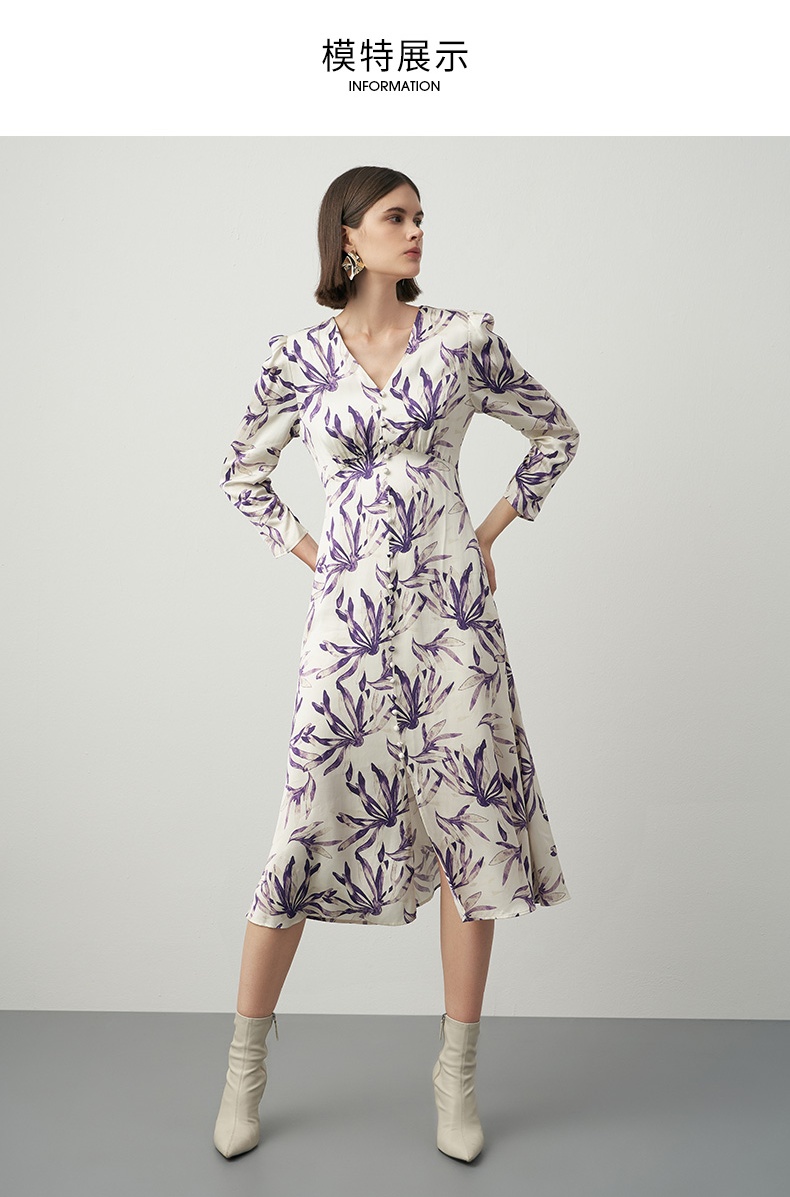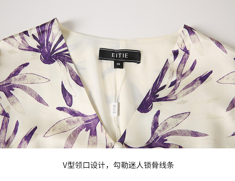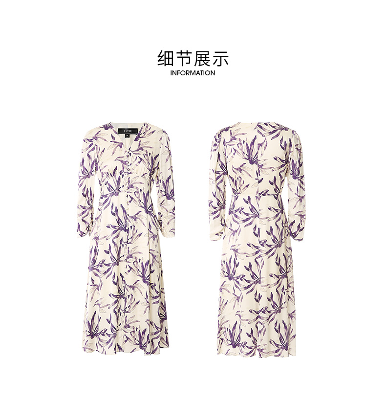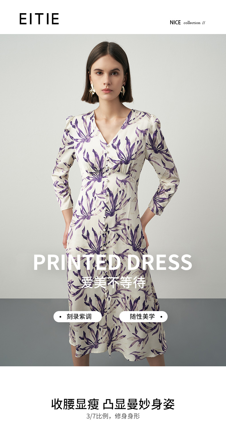 EITIE爱特爱秋季新款气质优雅高腰V领显瘦印花连衣裙7107805