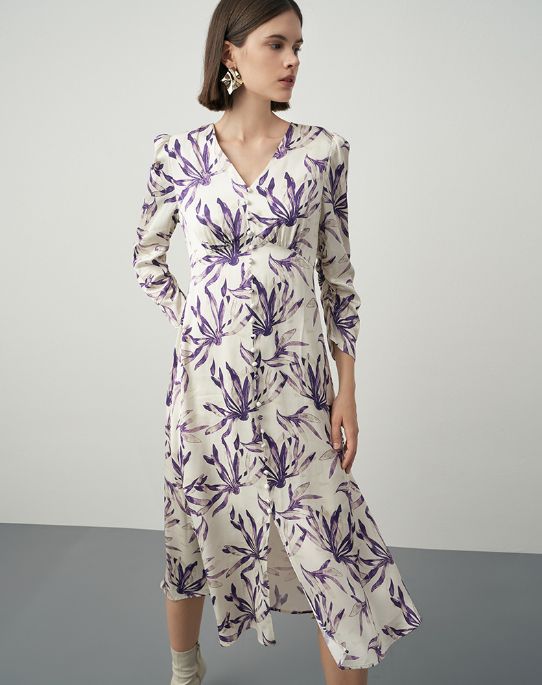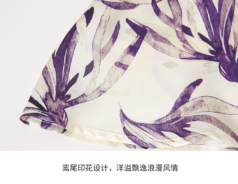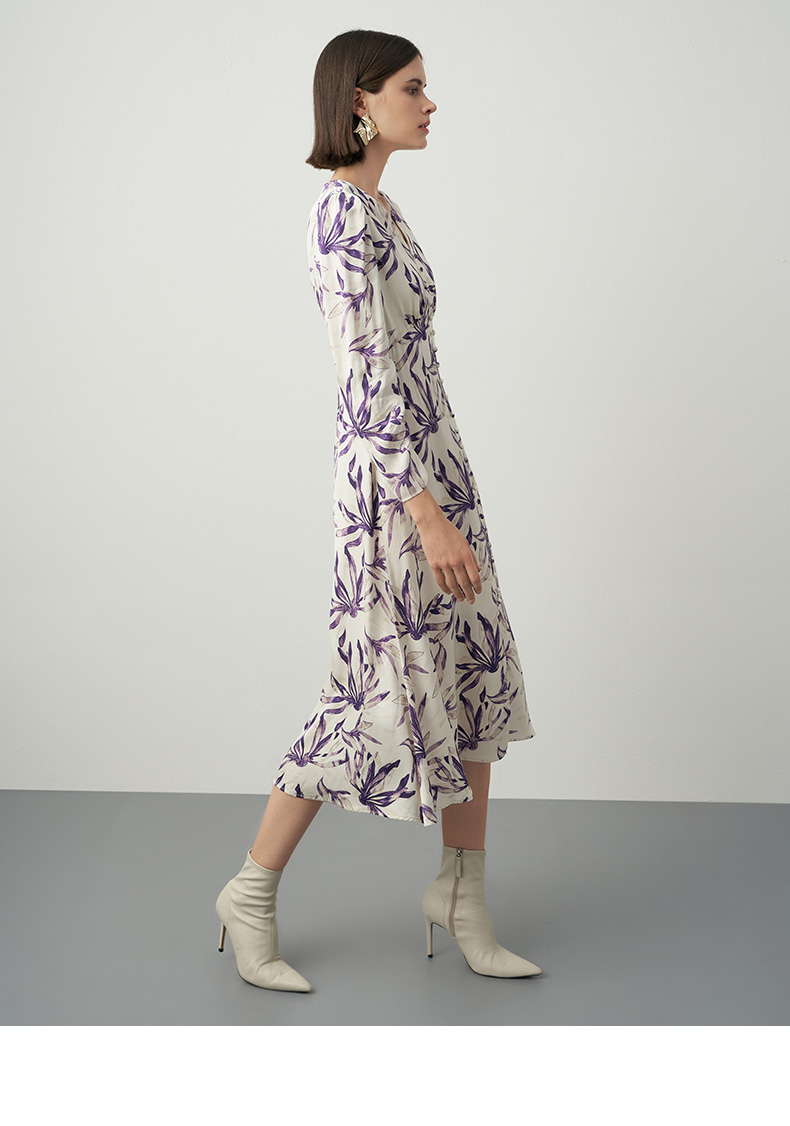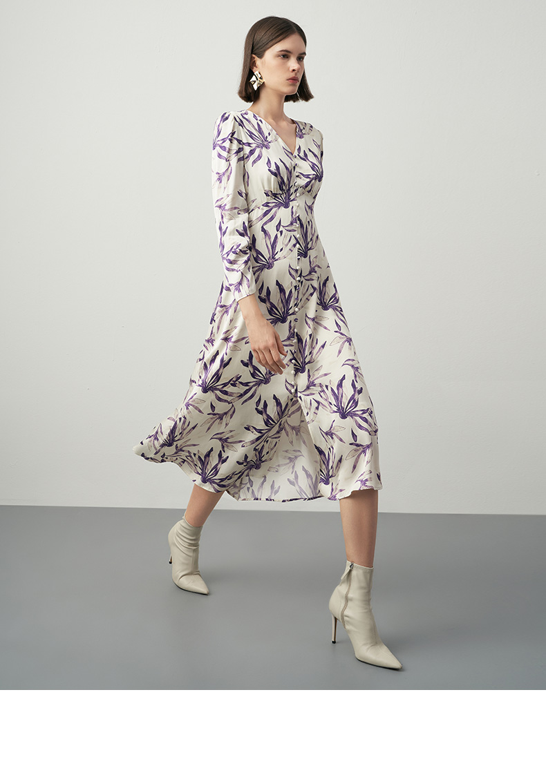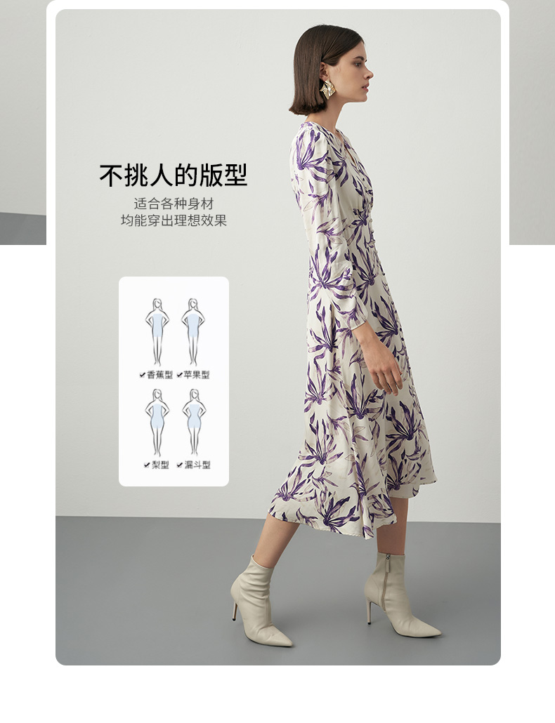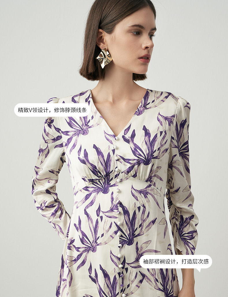 EITIE爱特爱秋季新款气质优雅高腰V领显瘦印花连衣裙7107805