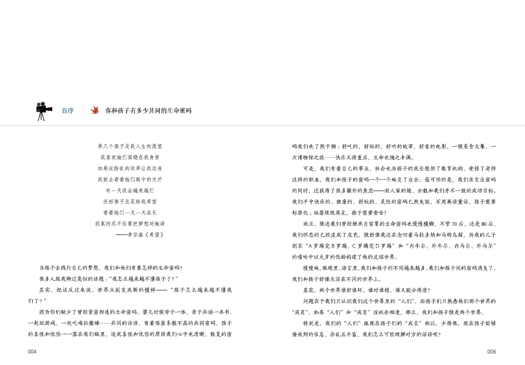 “当我们和孩子一起读那些无比美妙的童书,当我们和孩子一起在足球场上奔跑挥洒,当我们和孩子一起走过千山万水,当我们和孩子共同观看周末电影……我们和孩子就自然而然地拥有了可以轻松走近对方心灵的语言与密码……”