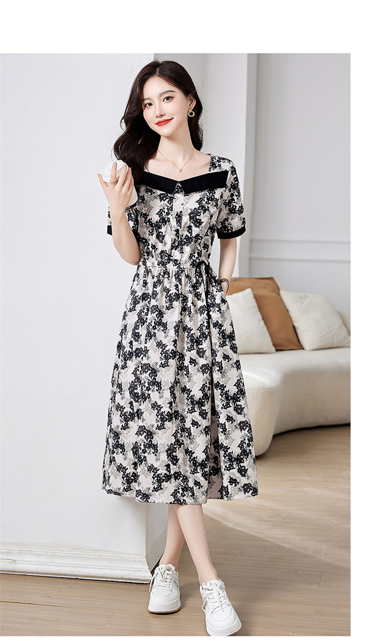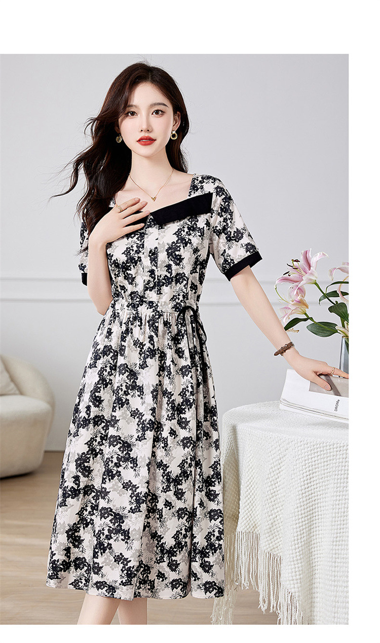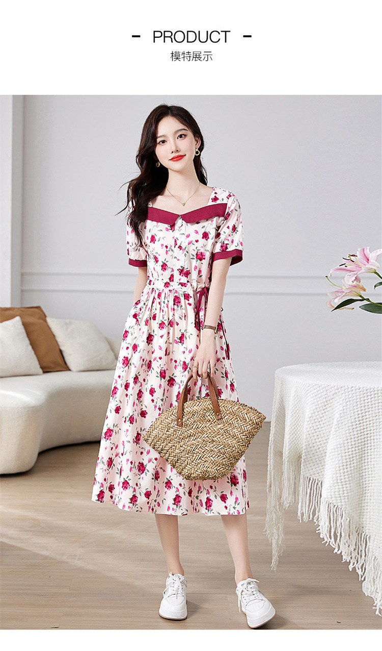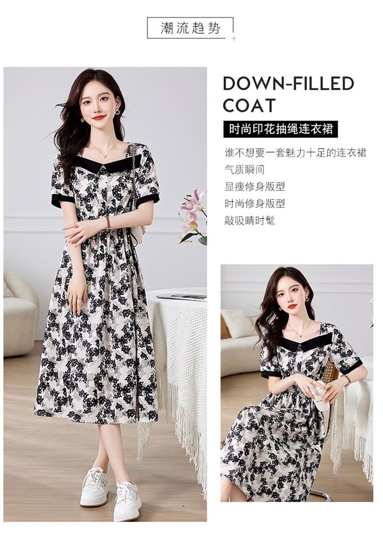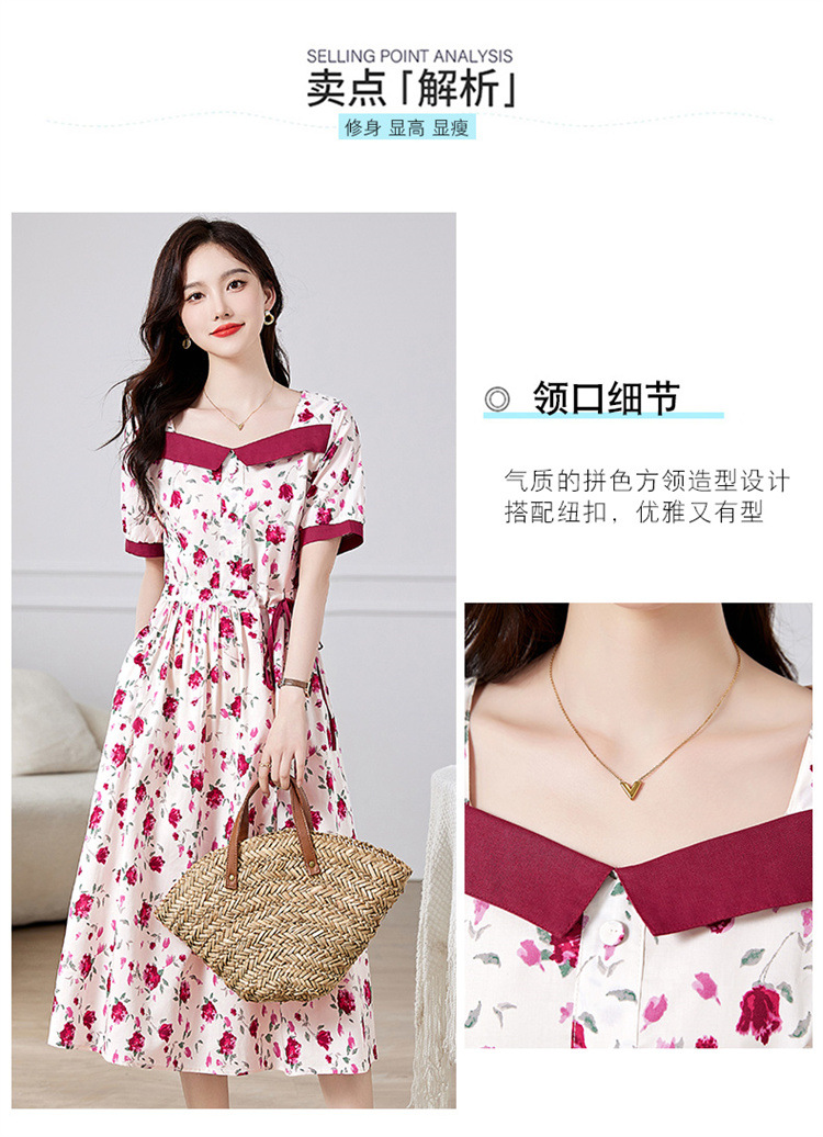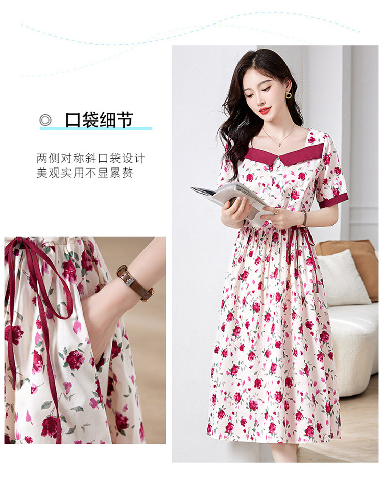 收腰显瘦,气质方领拼接撞色抽绳高腰A字碎花连衣裙HR-WX3019