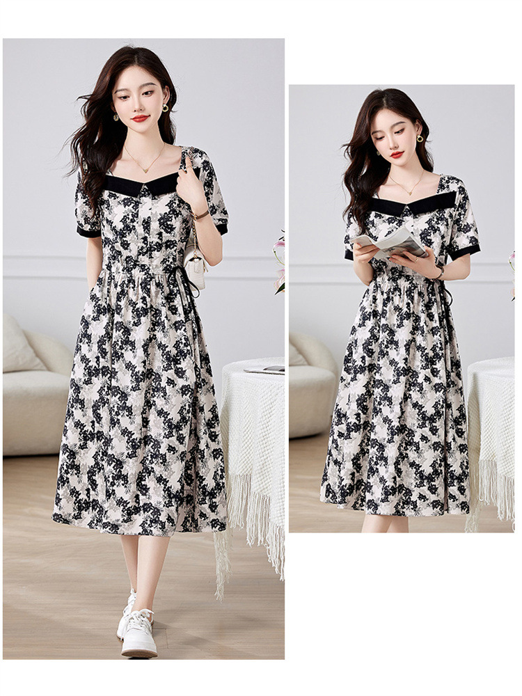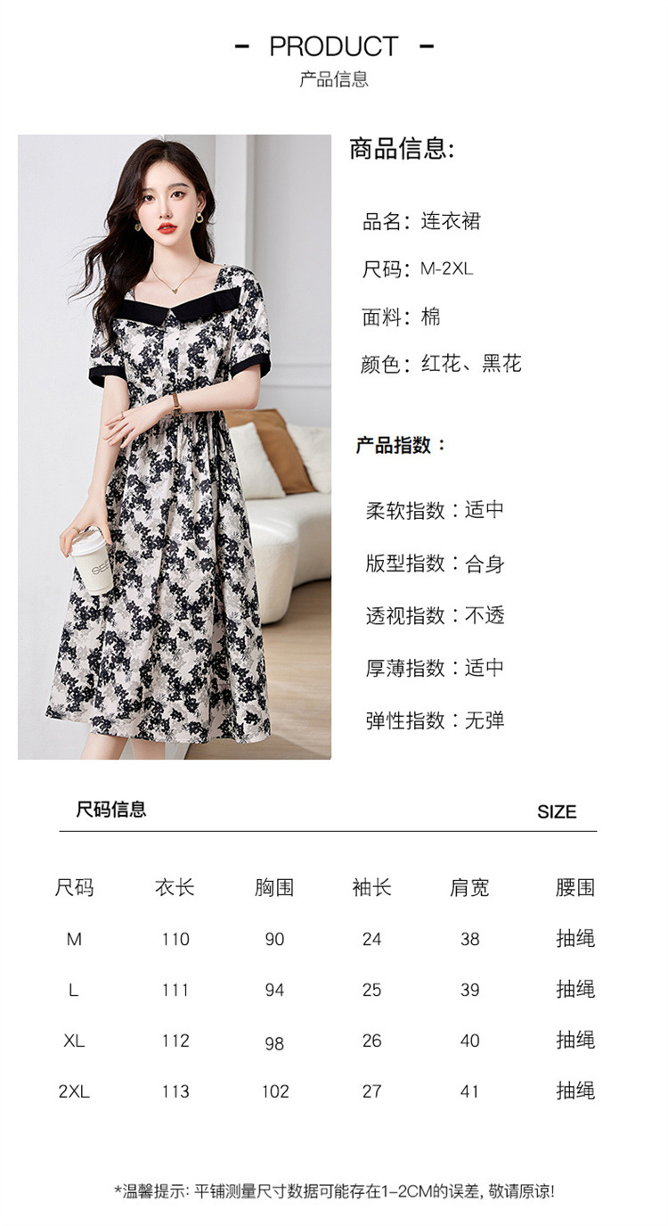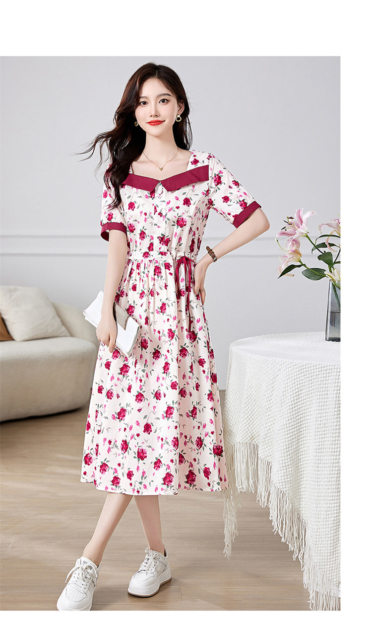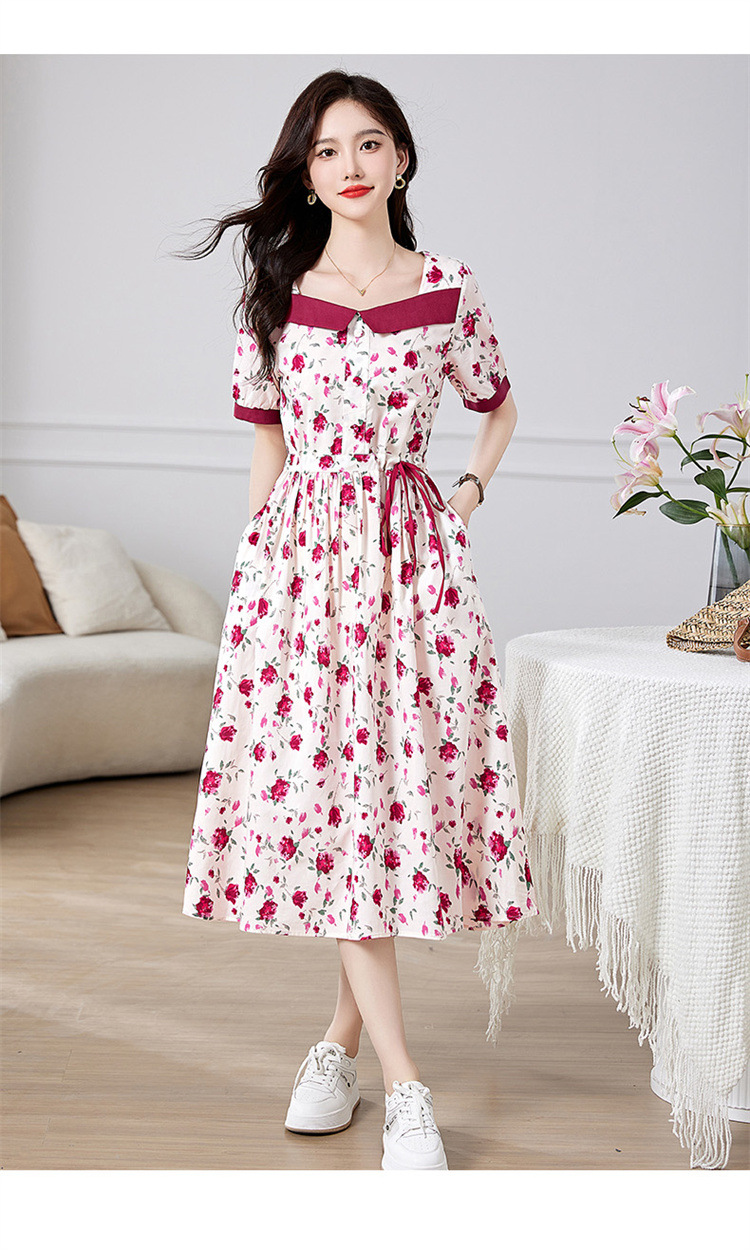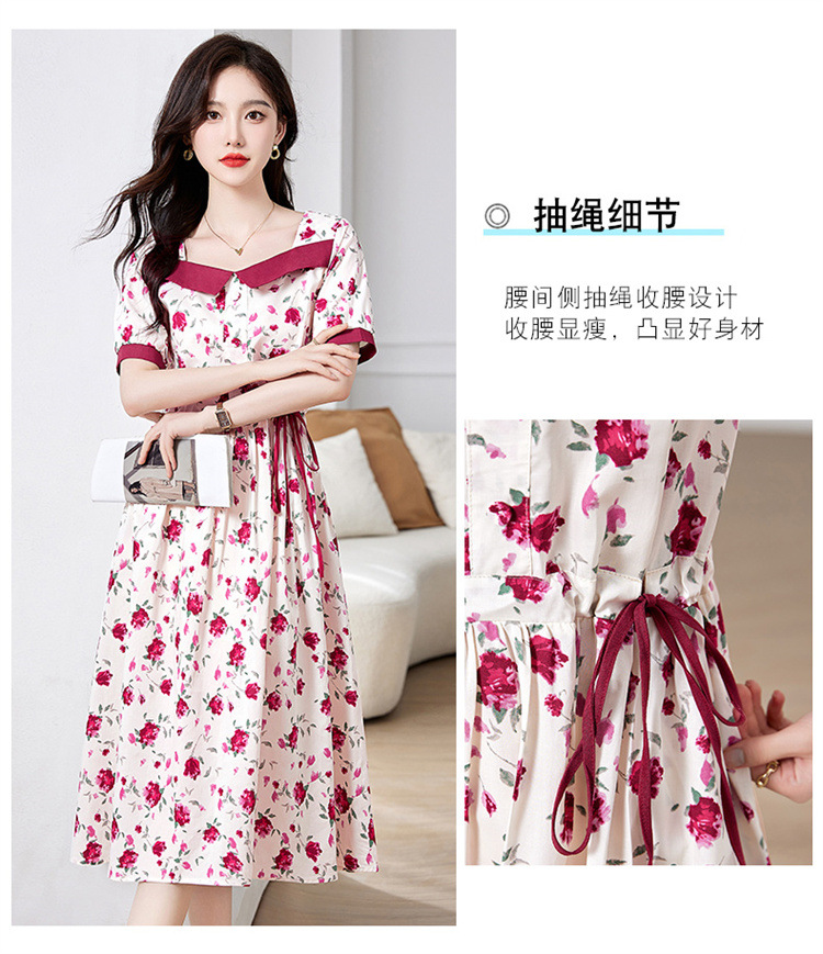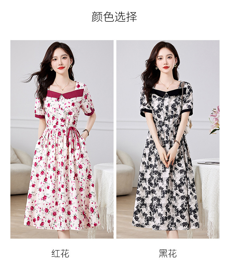 收腰显瘦,气质方领拼接撞色抽绳高腰A字碎花连衣裙HR-WX3019