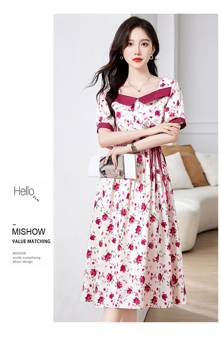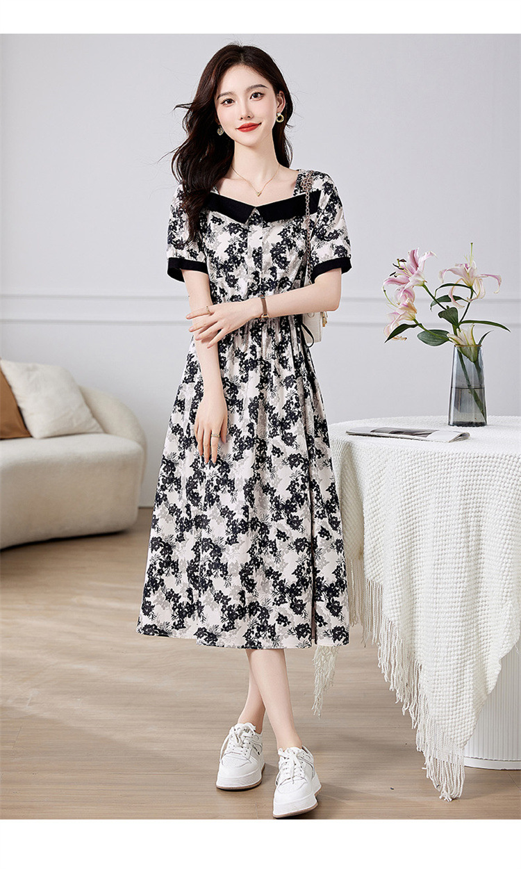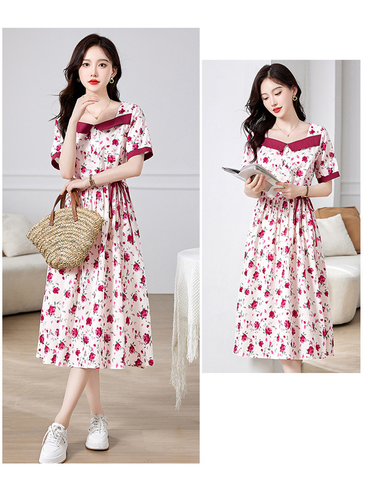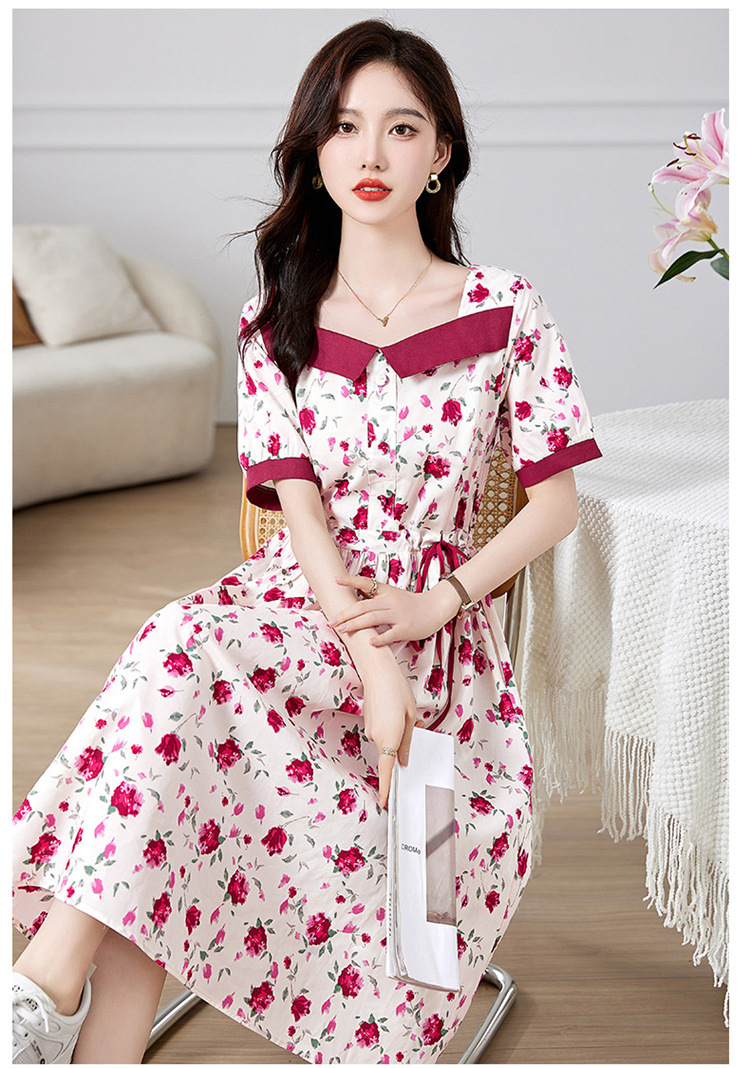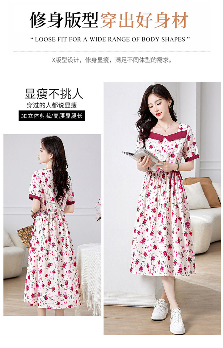 收腰显瘦,气质方领拼接撞色抽绳高腰A字碎花连衣裙HR-WX3019