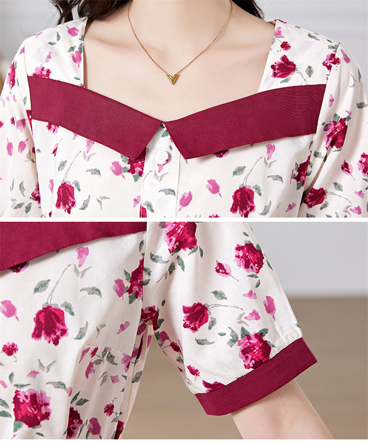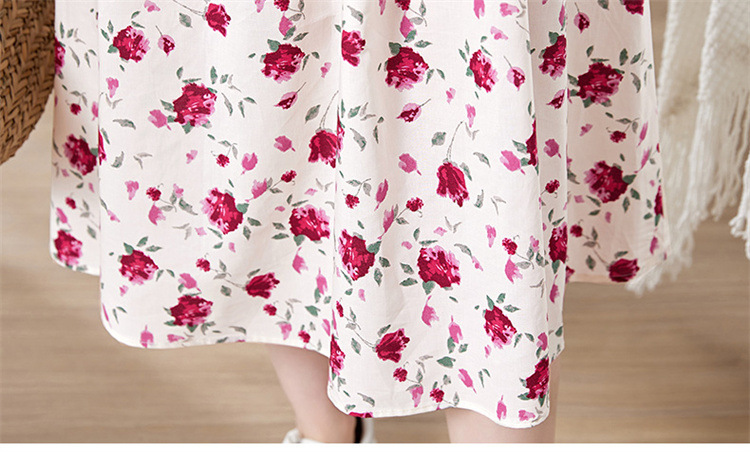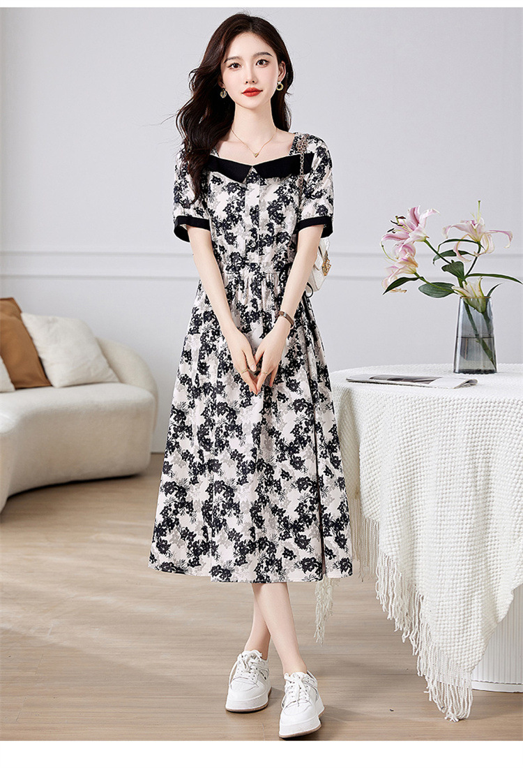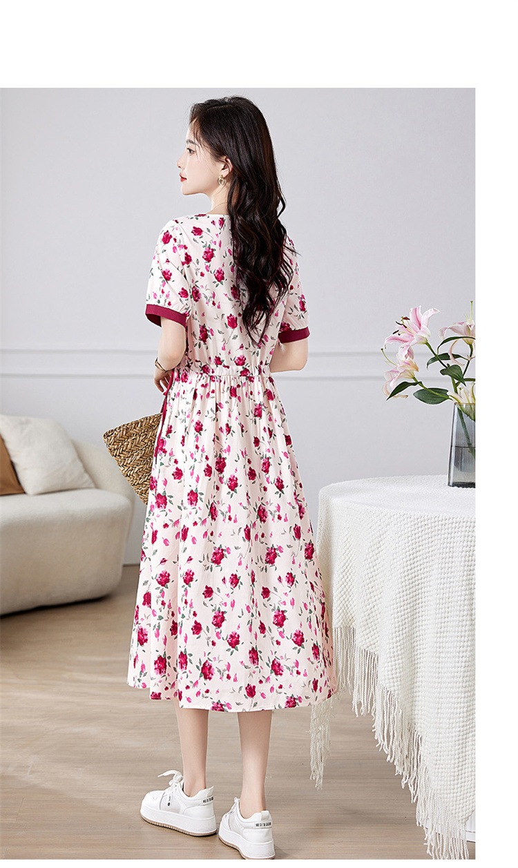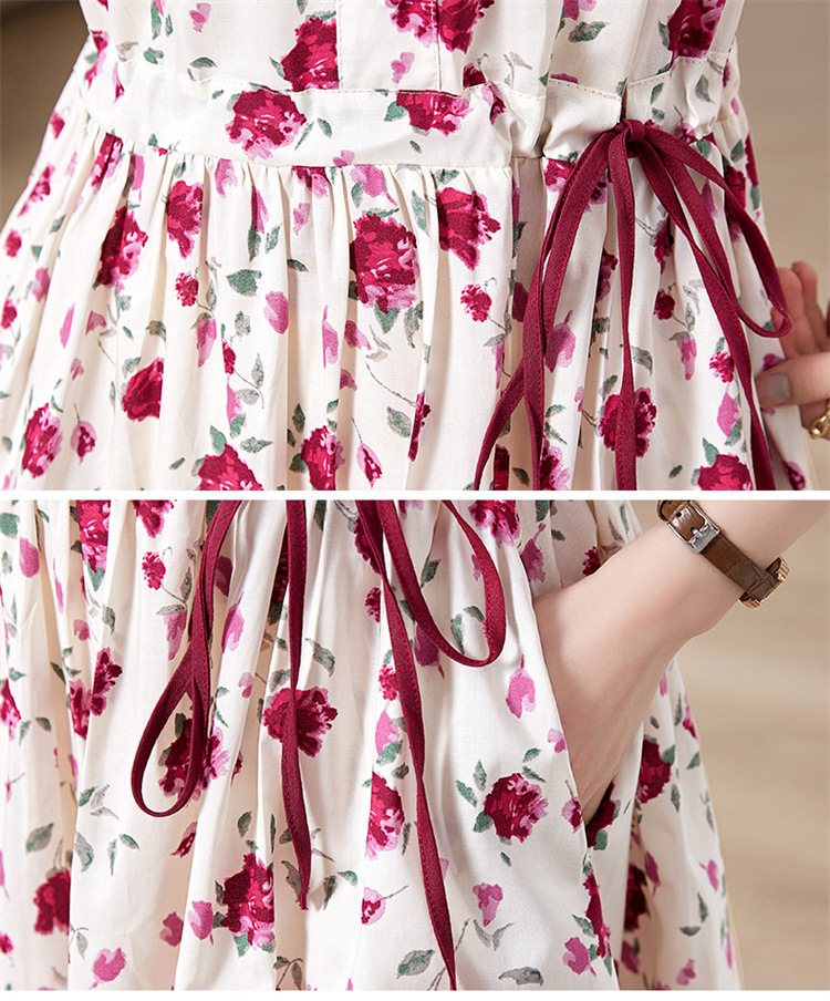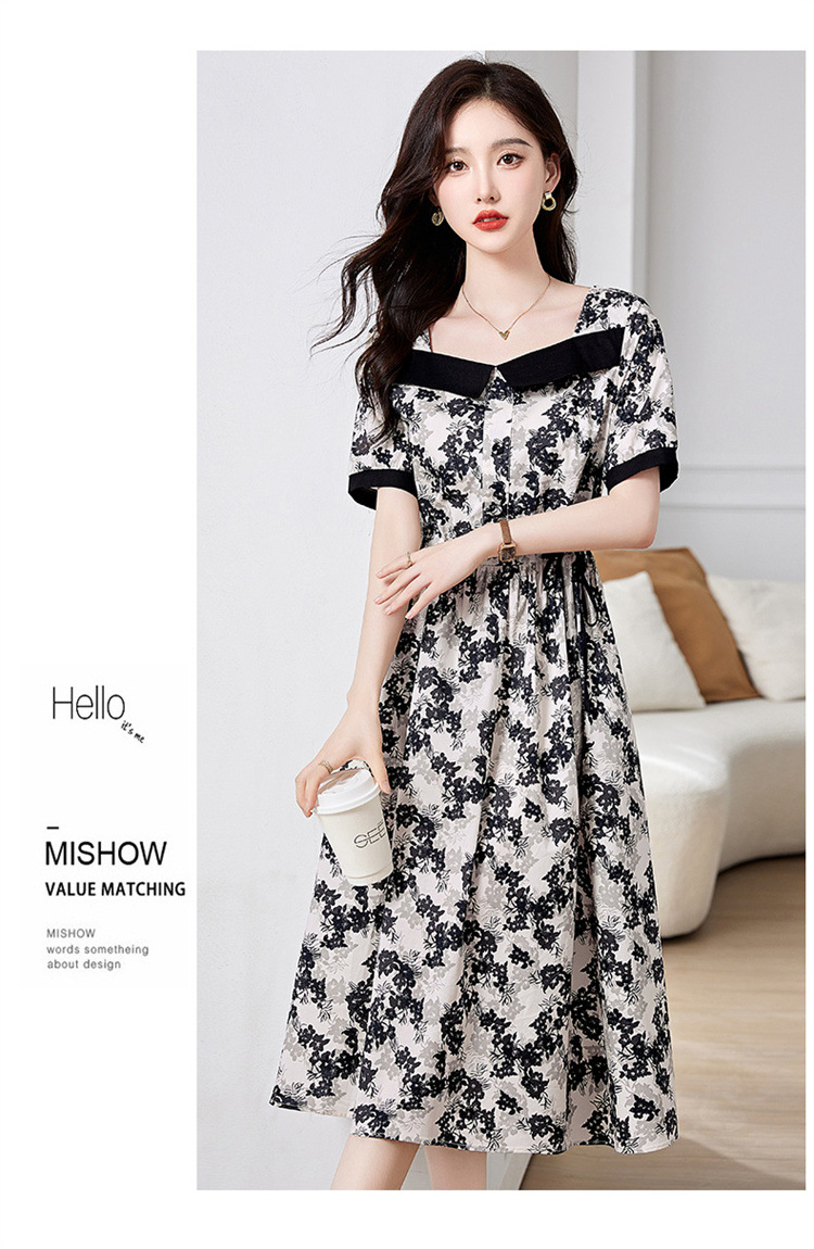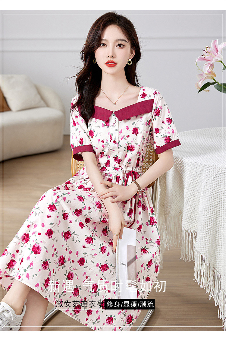 收腰显瘦,气质方领拼接撞色抽绳高腰A字碎花连衣裙HR-WX3019