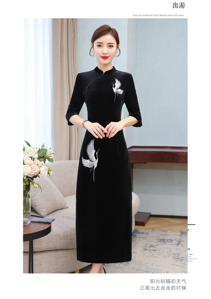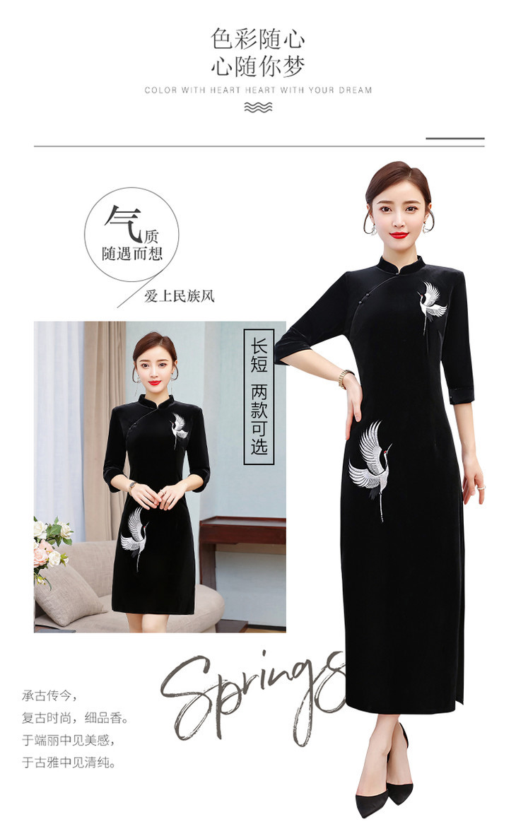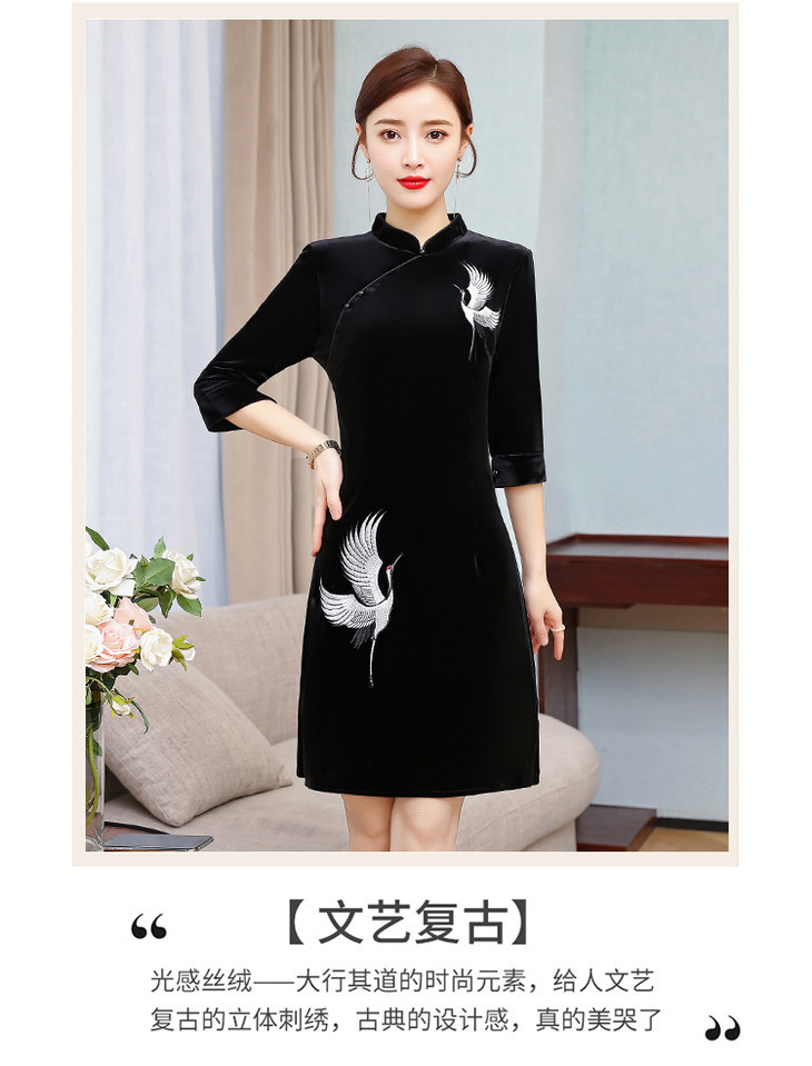 HT-1192 春秋新款仙鹤刺绣风七分袖改良旗袍连衣裙