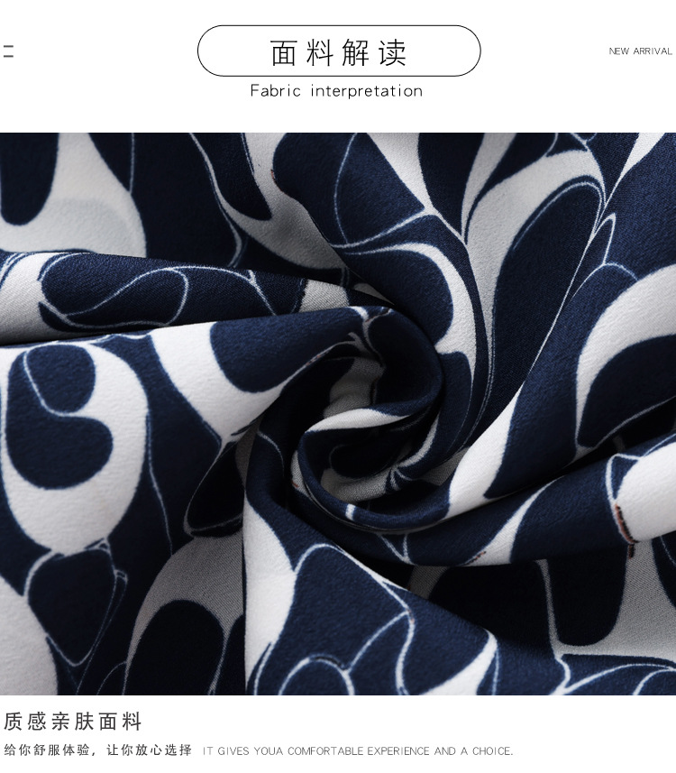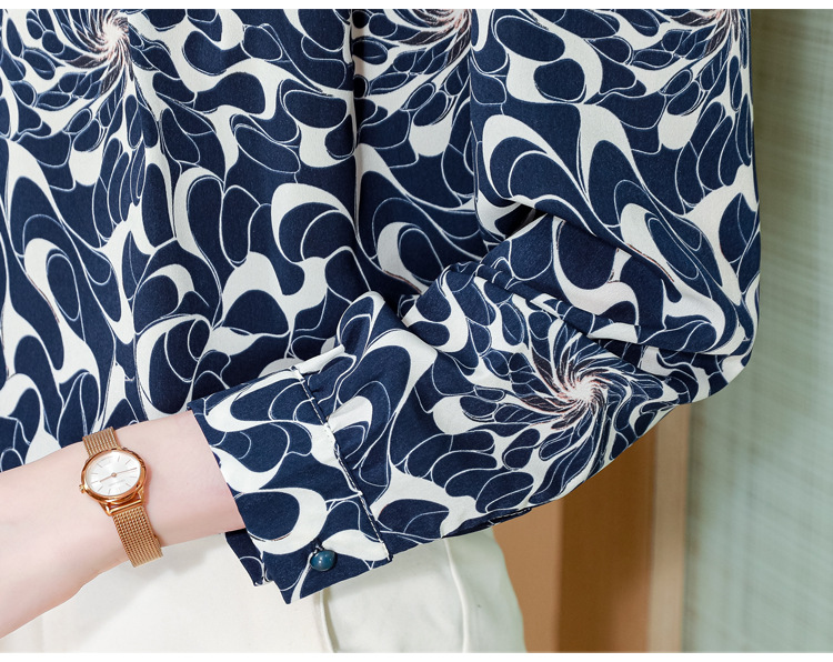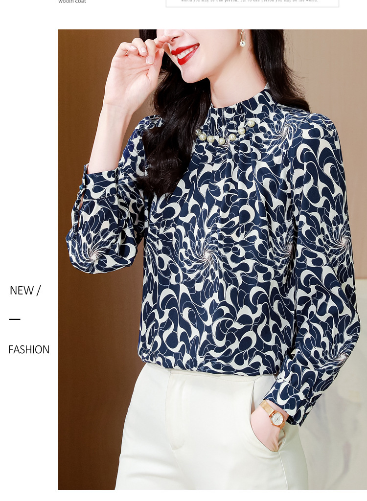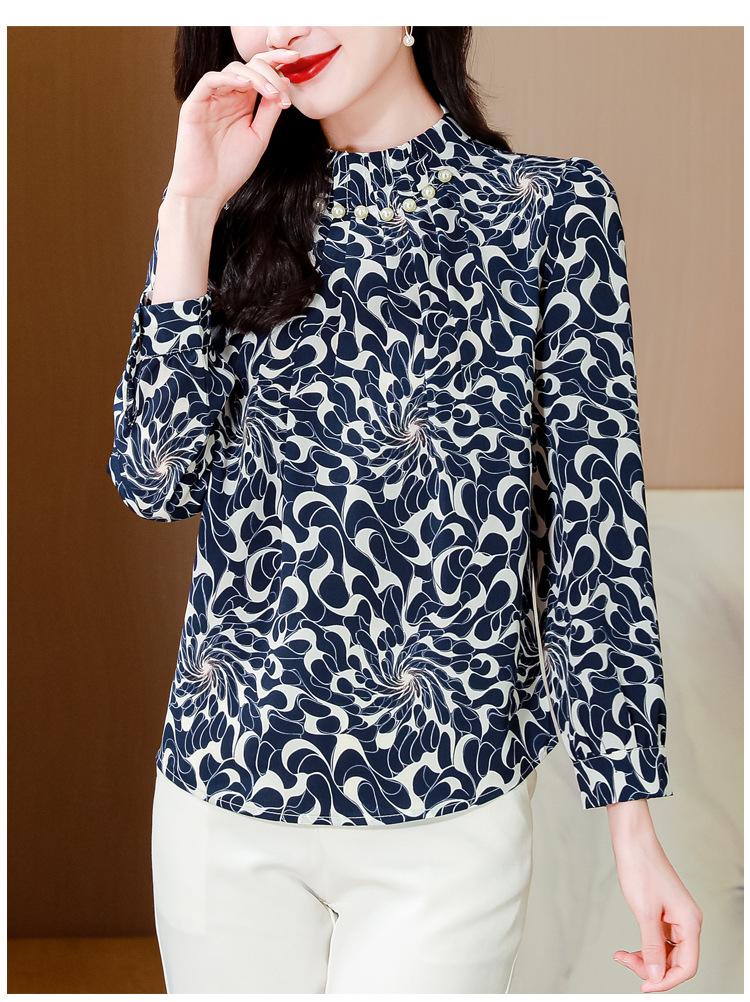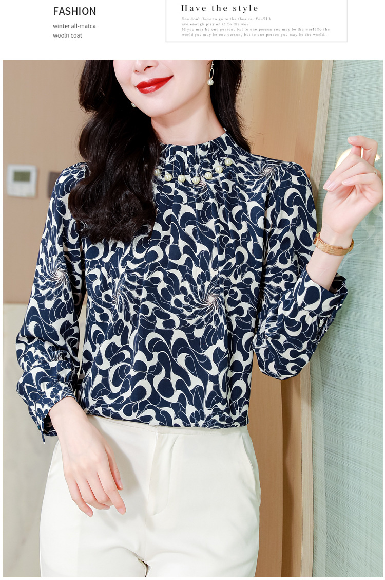 KQL 369H9979立领钉珠印花长袖雪纺衬衫