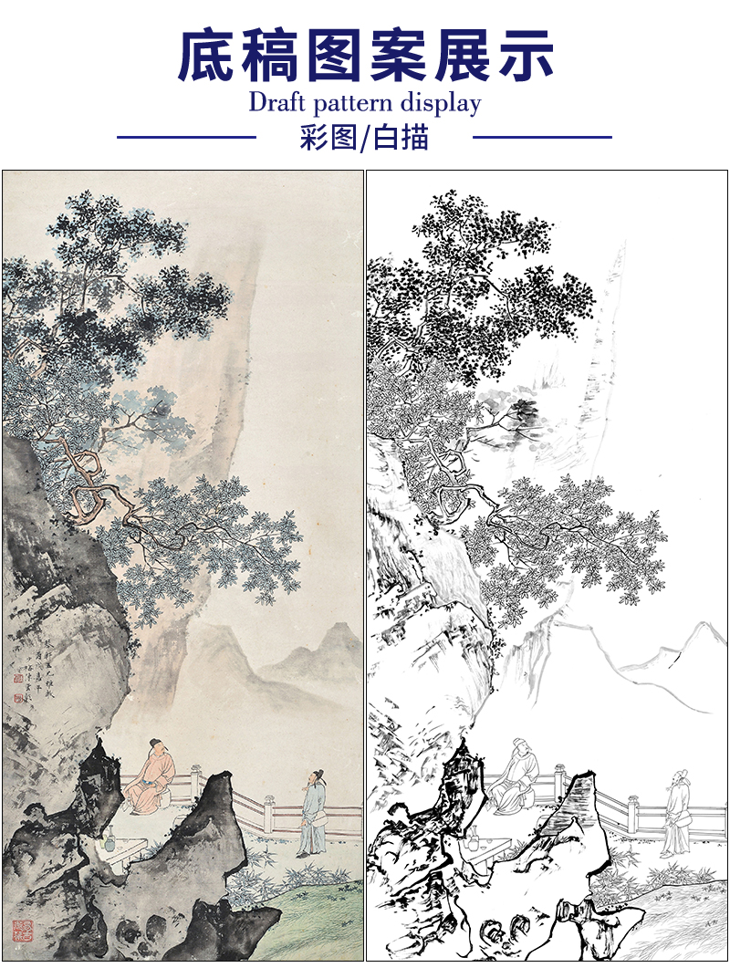 陈少梅山水人物工笔画白描底稿《秋林觅句图》临摹勾线高清打印稿SM29