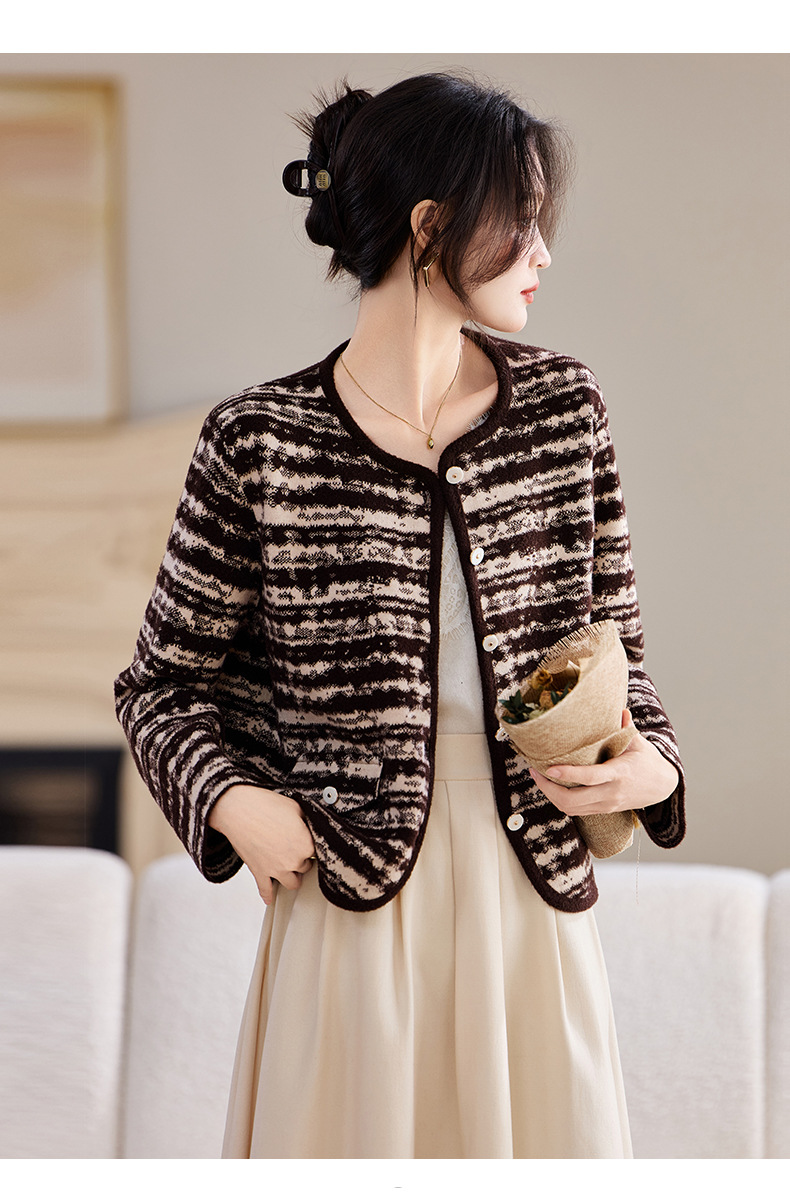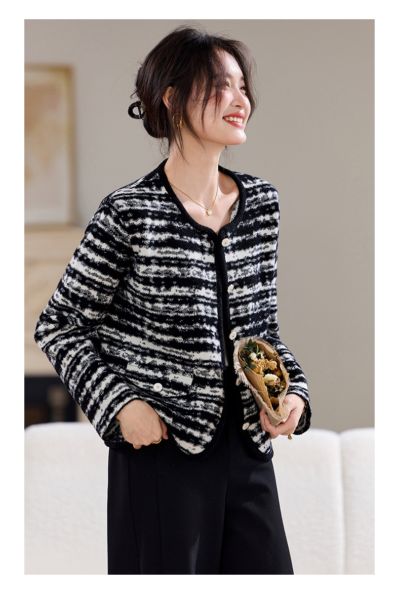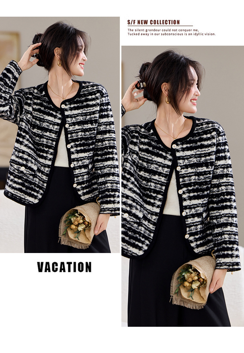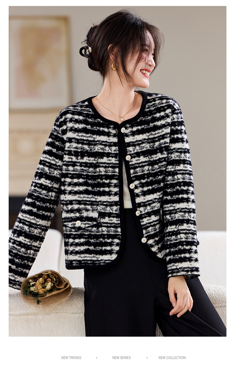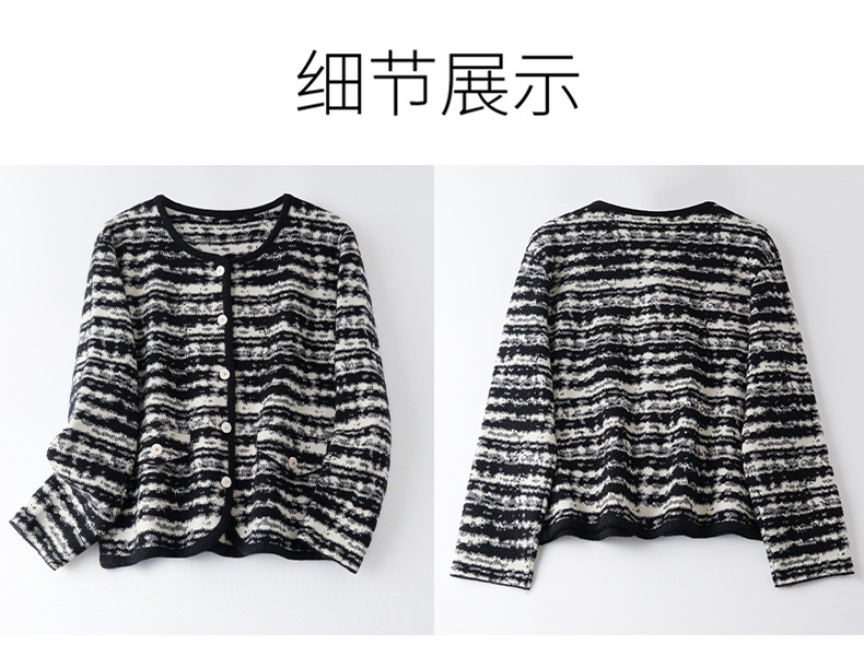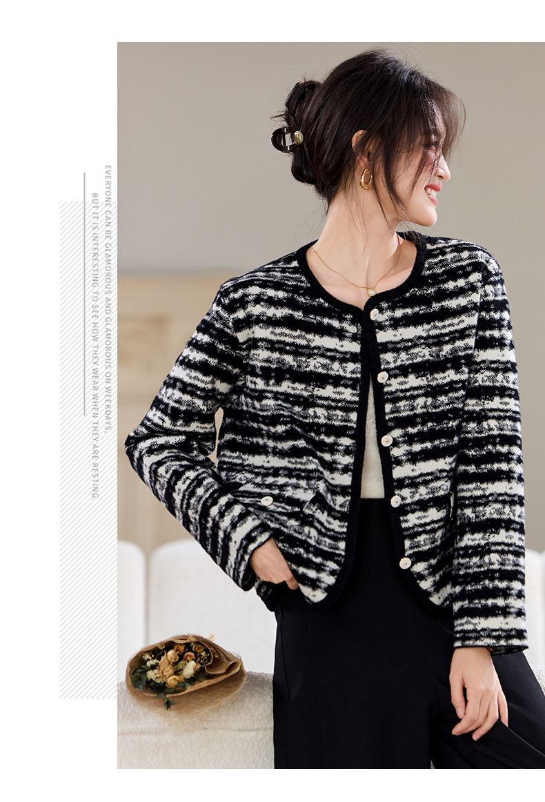 J6951 2025春秋新款小香风毛衣外套女短款圆领条纹显瘦针织开衫外搭上衣