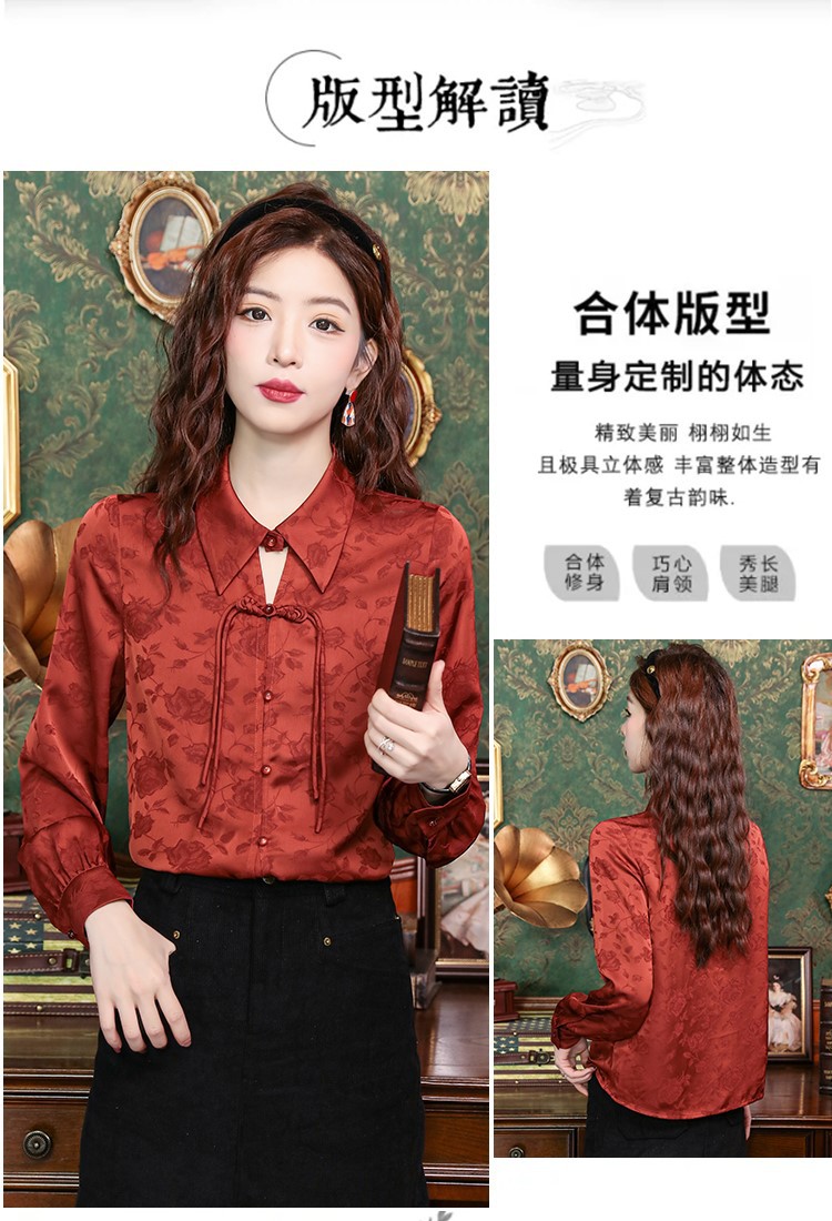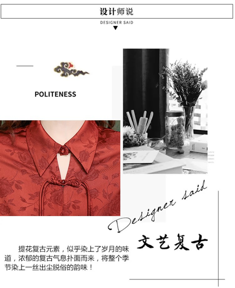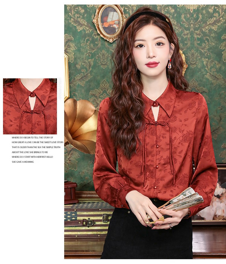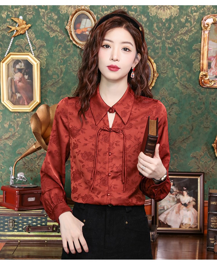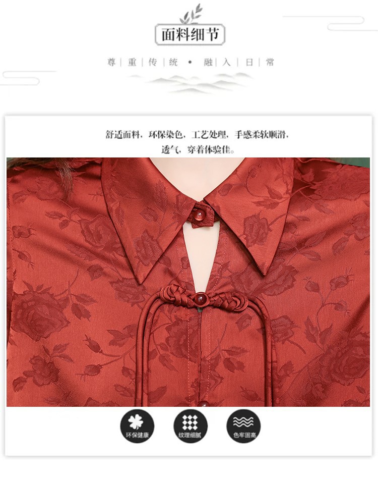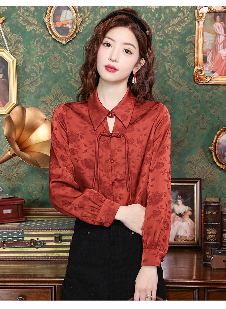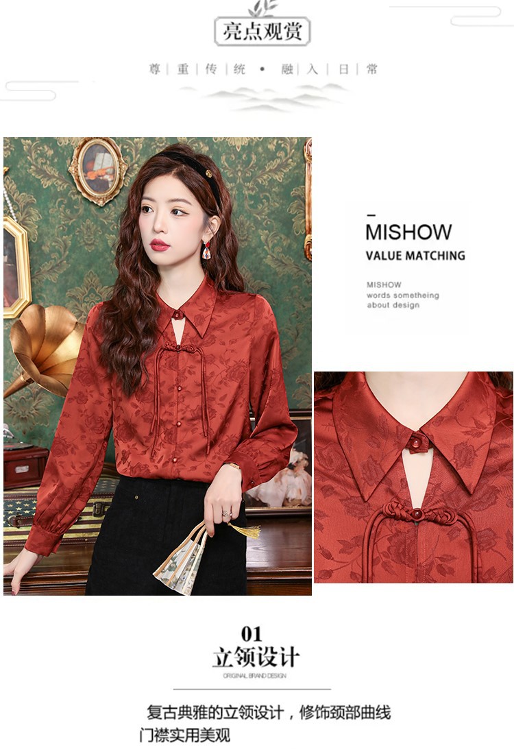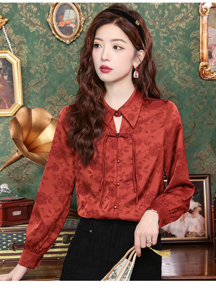 新中式国风红色雪纺衬衫女士春秋季新款时尚百搭气质小衫长袖衬衣