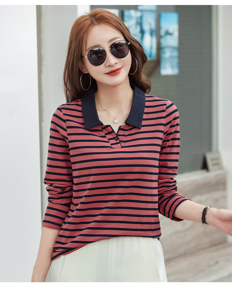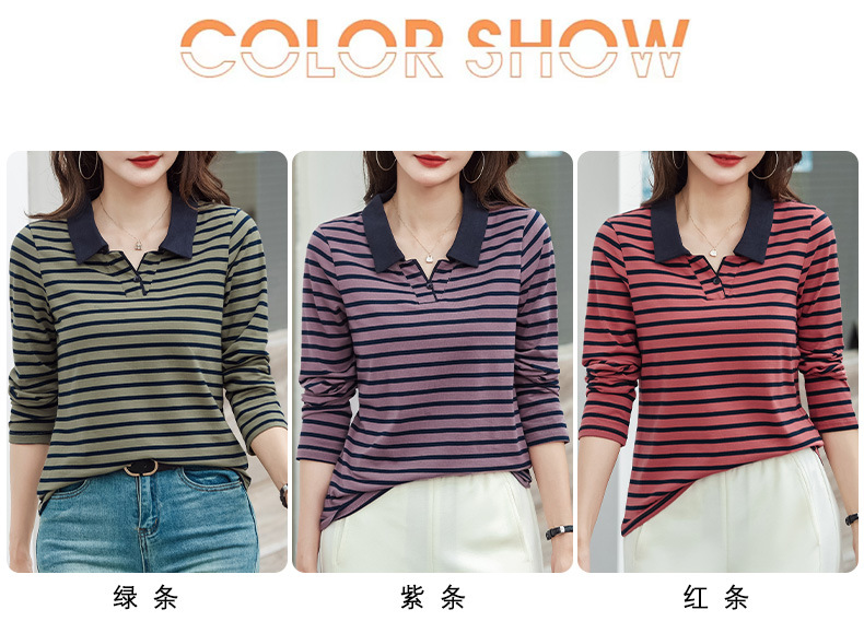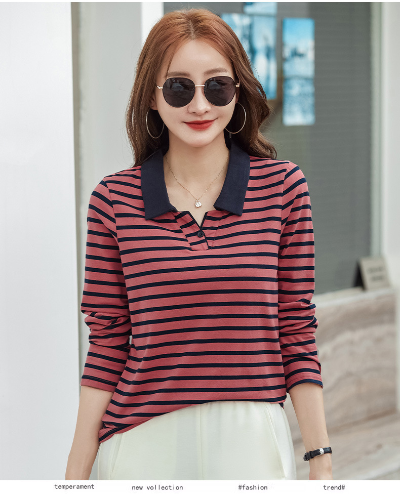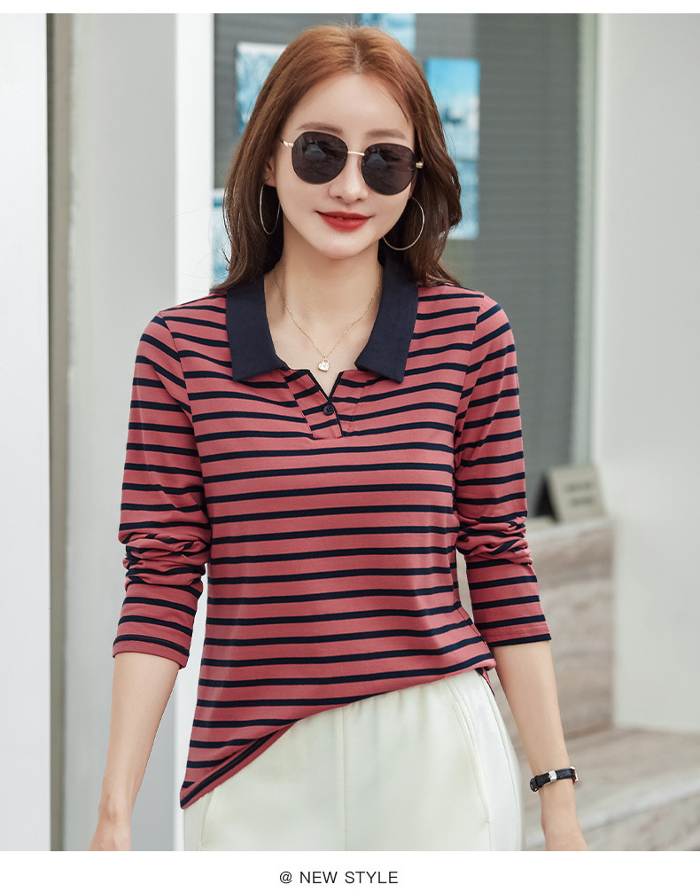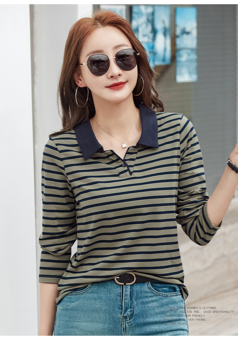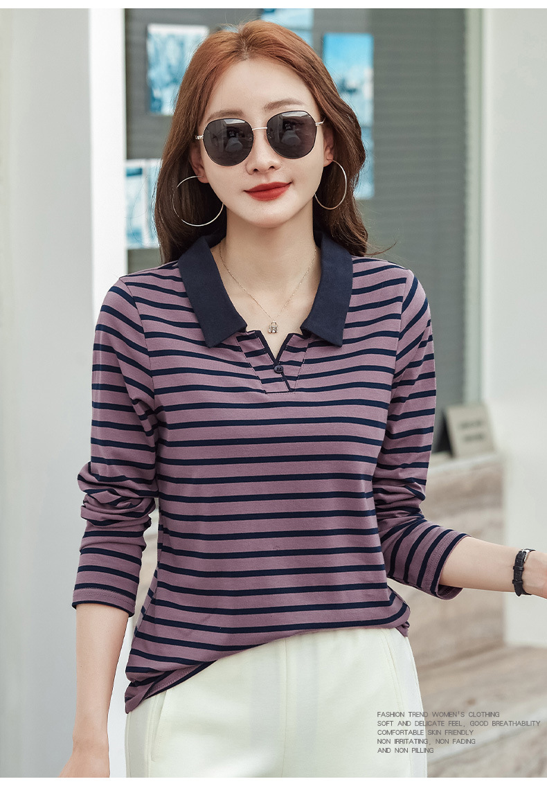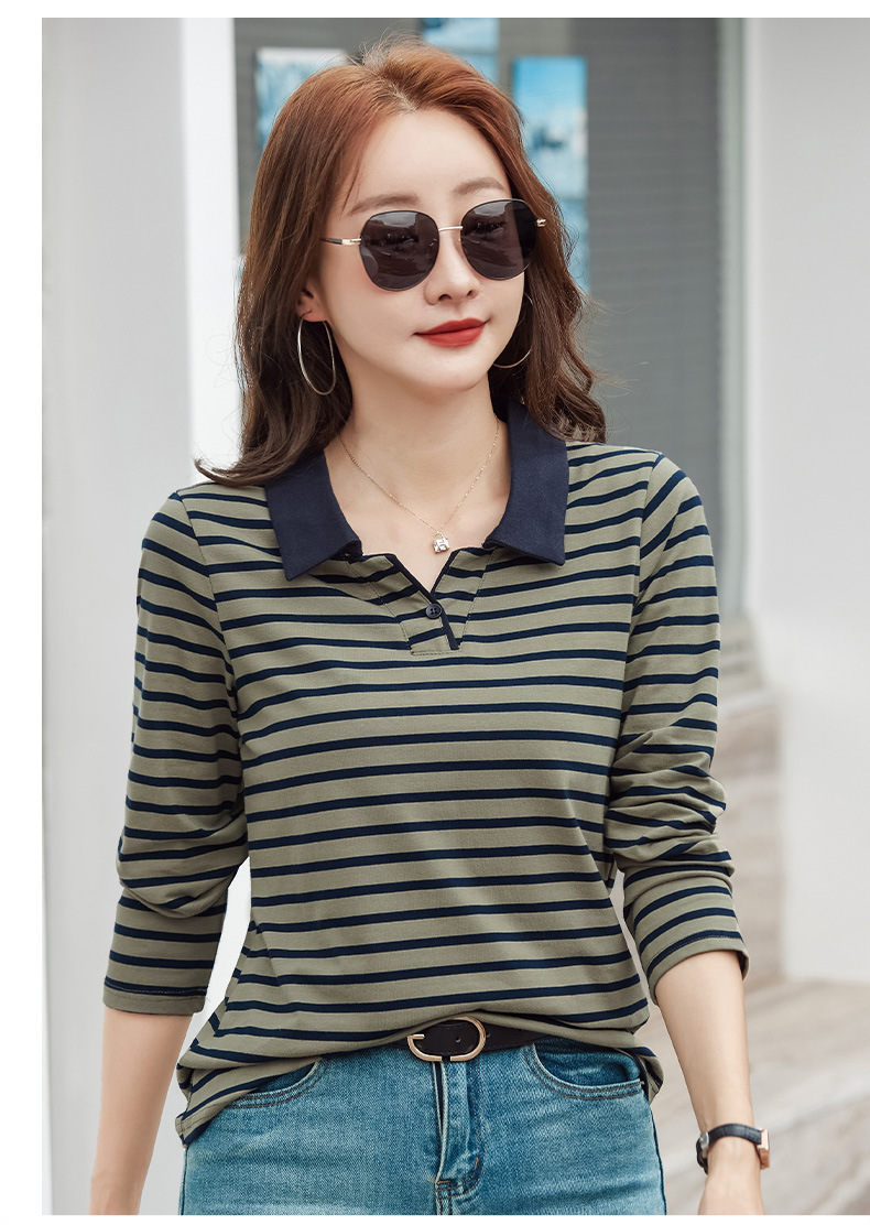 百媚生 棉质条纹翻领长袖T恤打底衫537