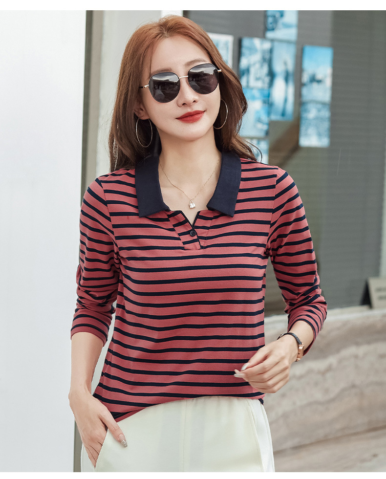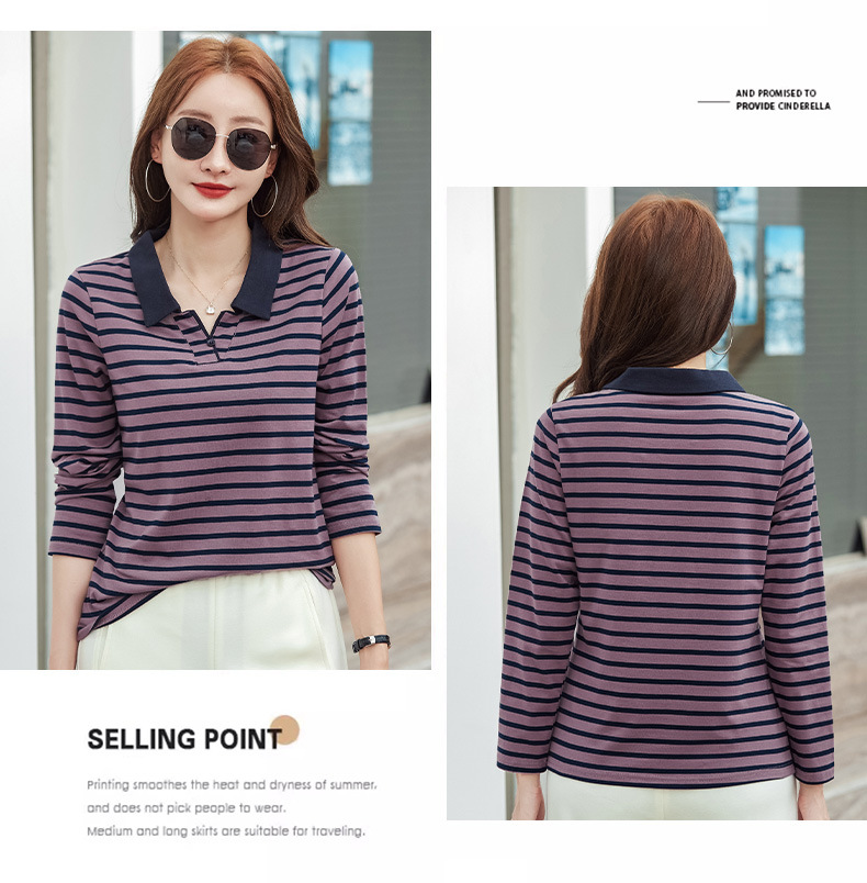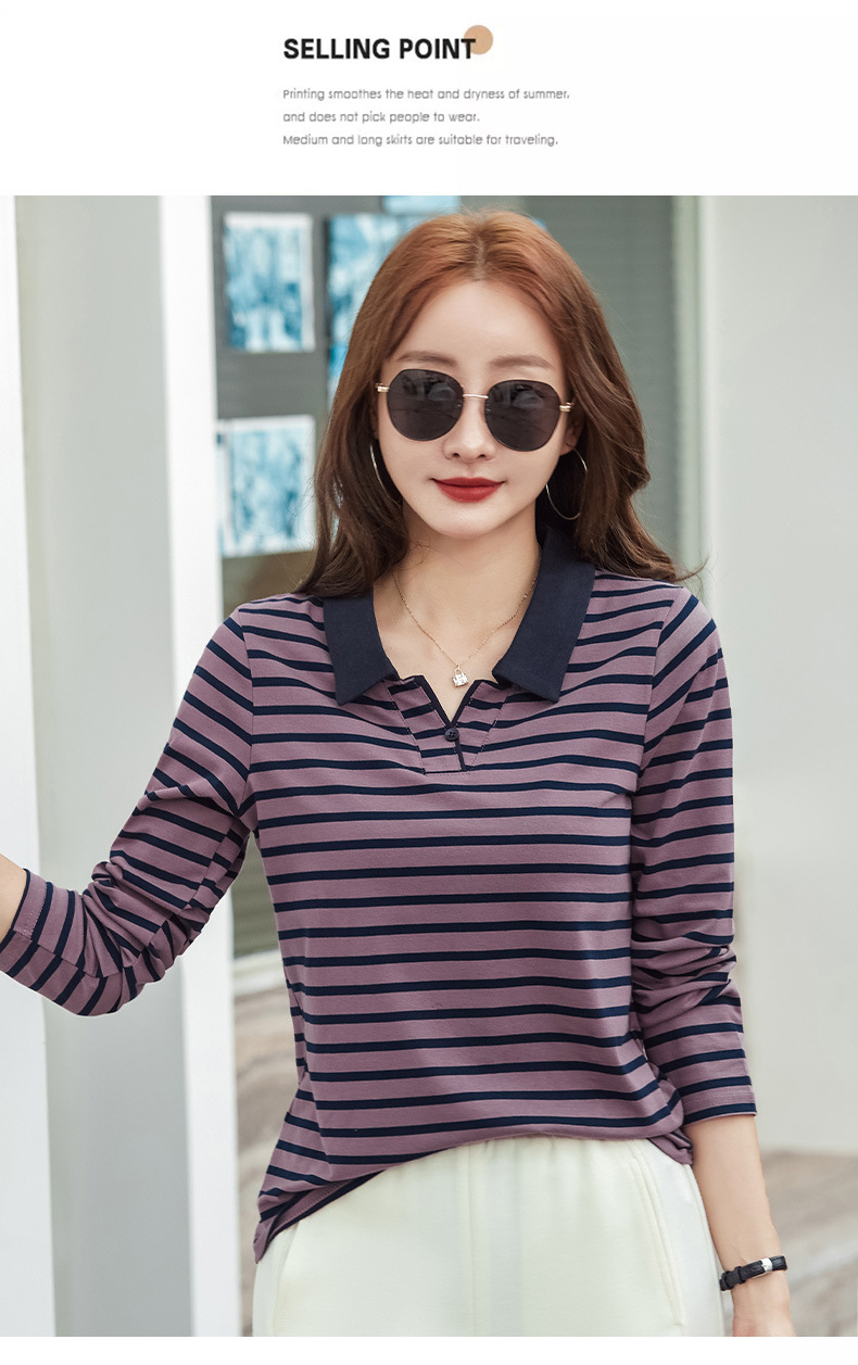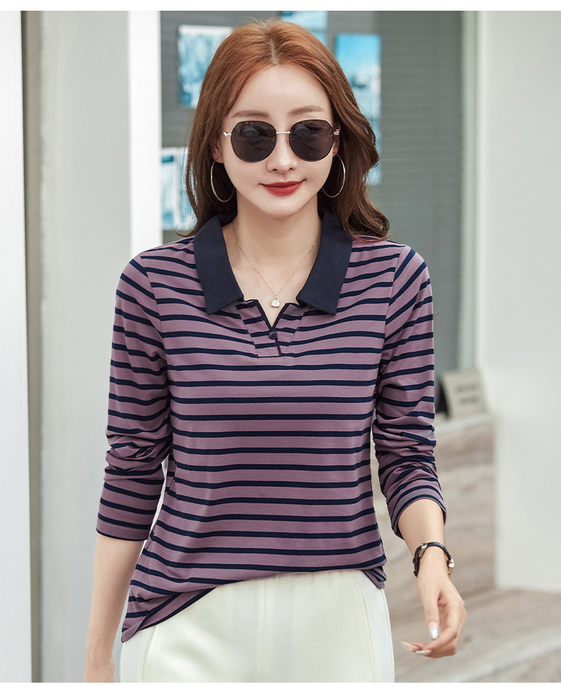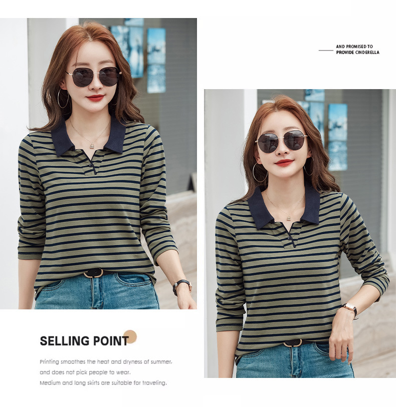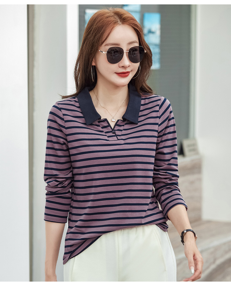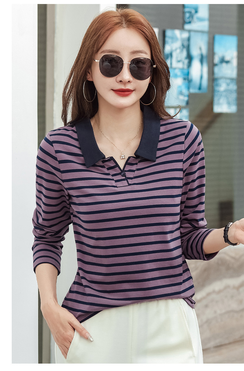 百媚生 棉质条纹翻领长袖T恤打底衫537