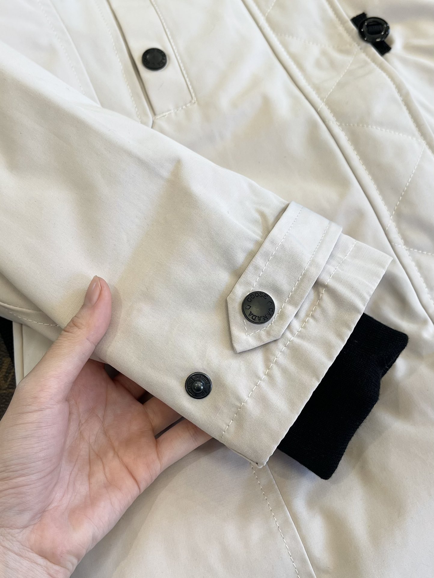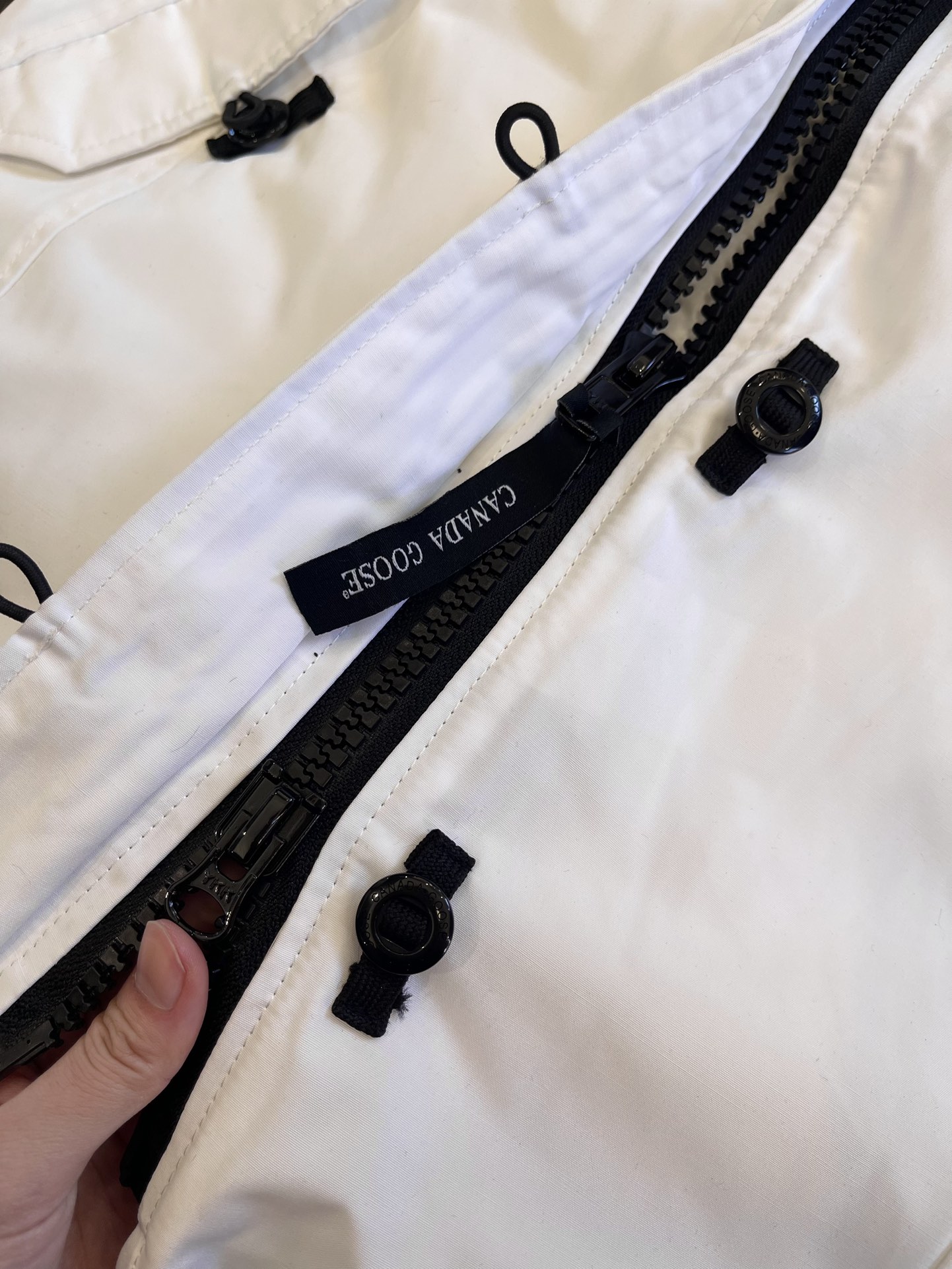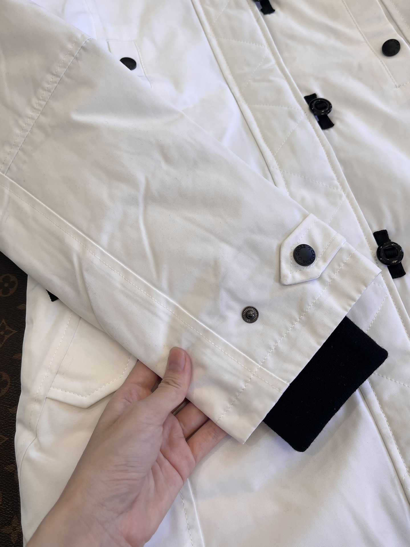 白色 防风表层的高科技防撕裂面料制成,高级客供细腻羽绒,由85%的涤纶和15%棉组成,表面特殊防护涂层处理可防风,品牌方特供YKK五金拉链,重点推荐,那种质感丝滑,卖过好货得自然知道这种好东西。全身多个口袋设计既可以拿来拗造型也可以拿来装物品。口袋处的LOGO设计和品牌名设计更能体现大牌范