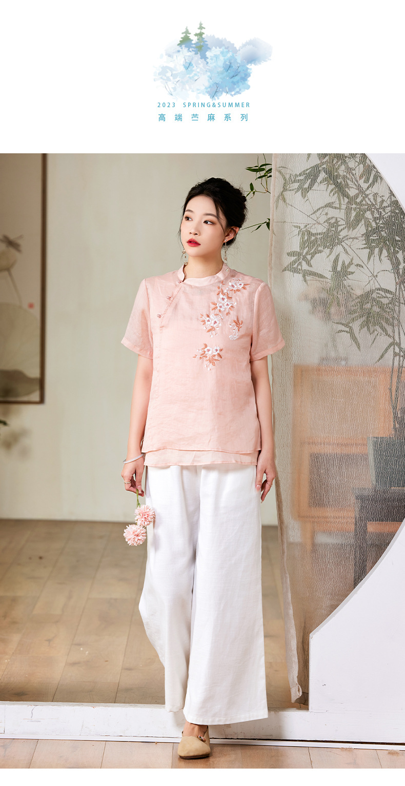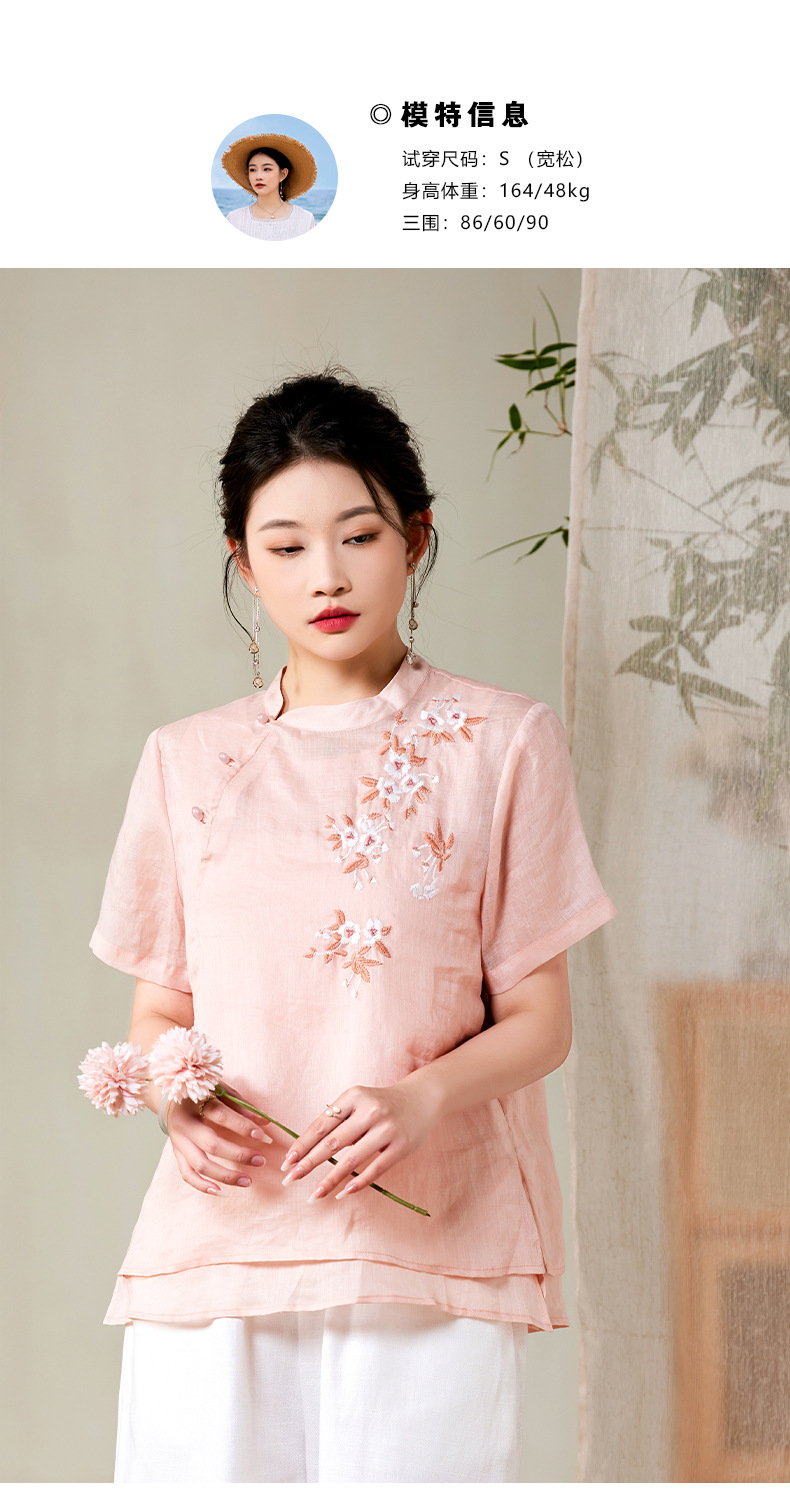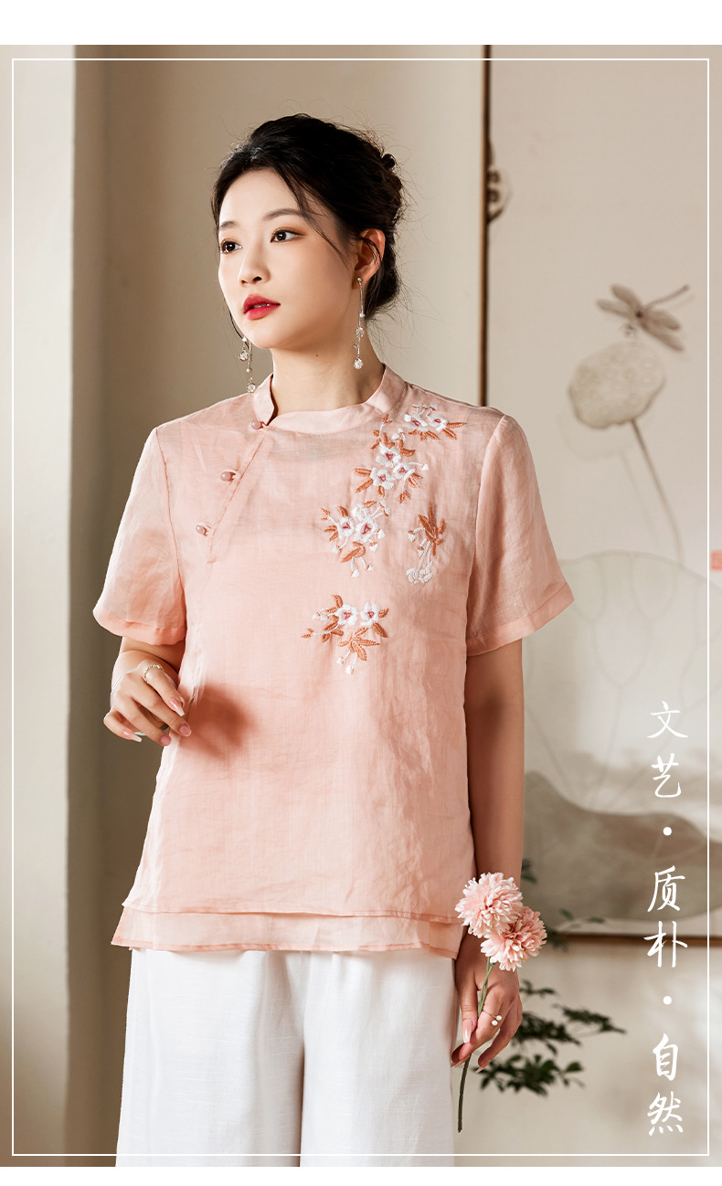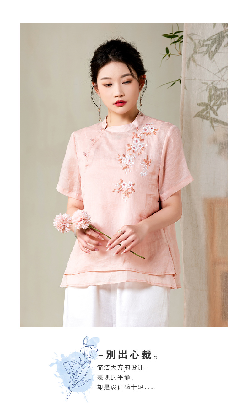 夏新款国风苎麻上衣,新中式复古刺绣改良式立领短袖T恤YM-C034