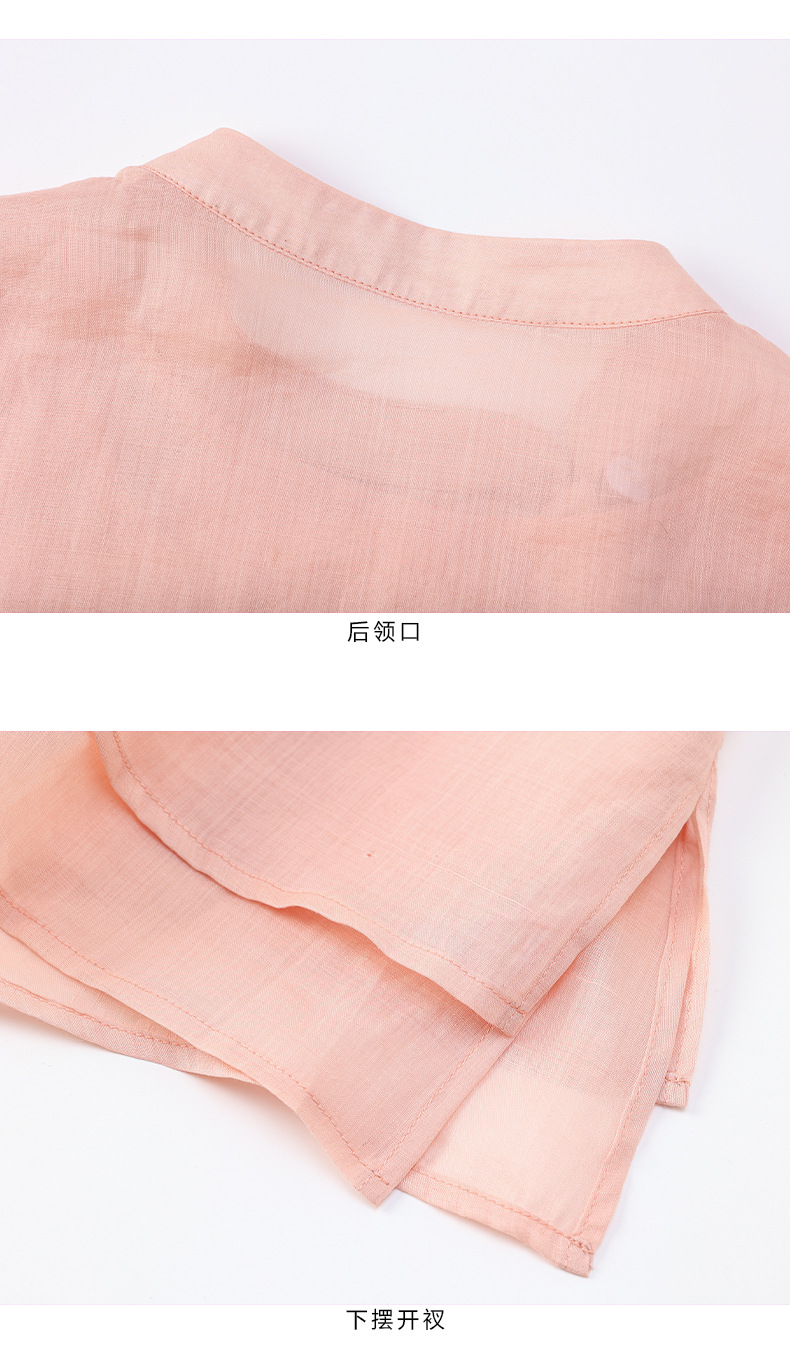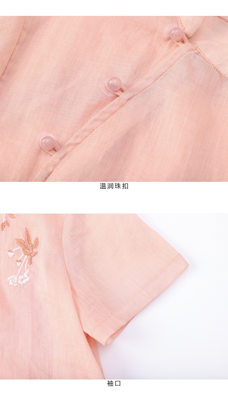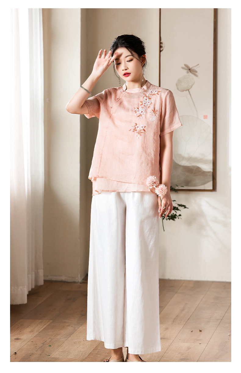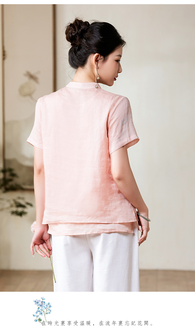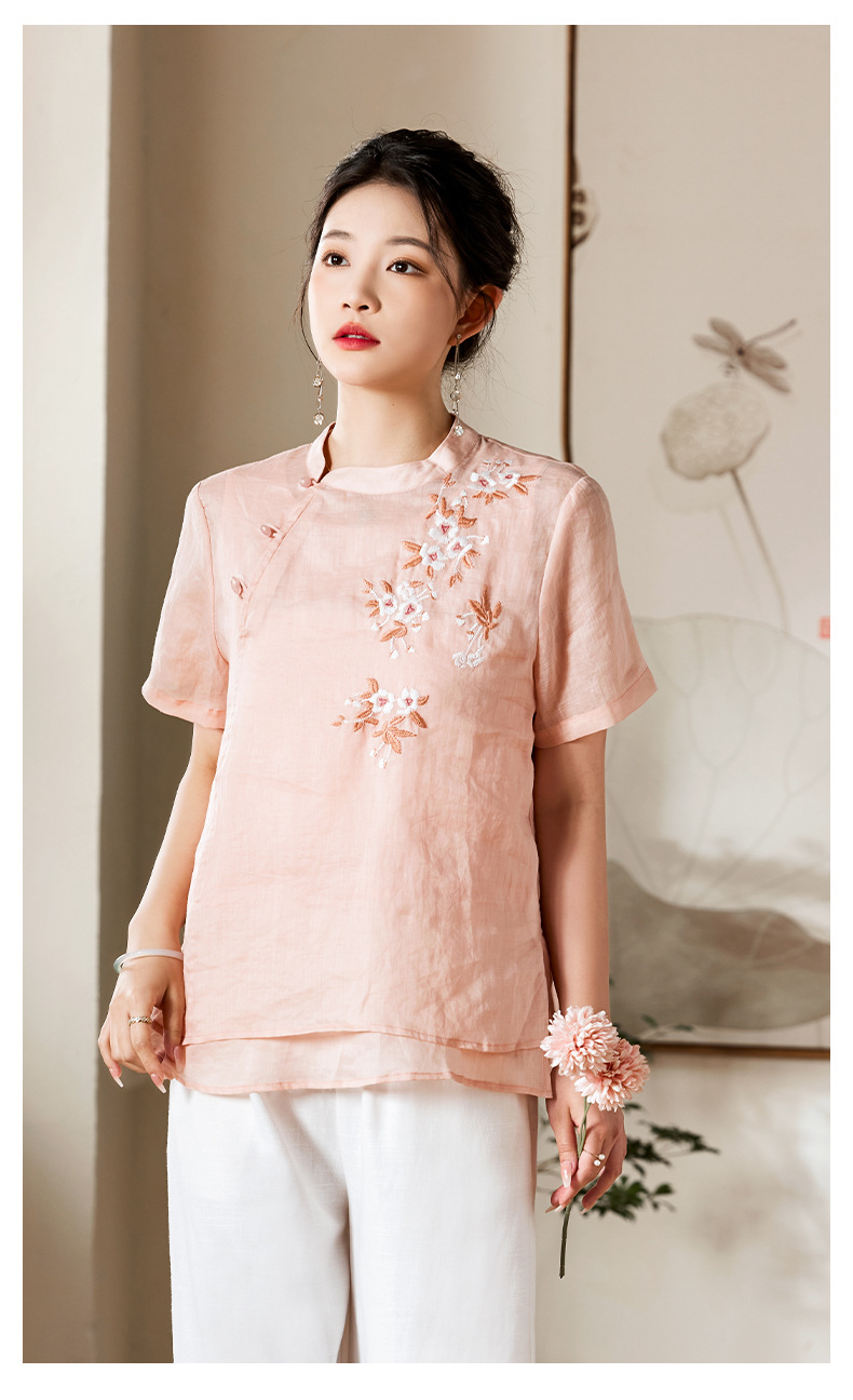 夏新款国风苎麻上衣,新中式复古刺绣改良式立领短袖T恤YM-C034