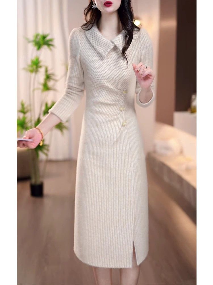 QYMXYKL-C537 2025冬季新款米驼色洋气交叉翻领设计感优雅大气收腰显瘦连衣裙 商品图0