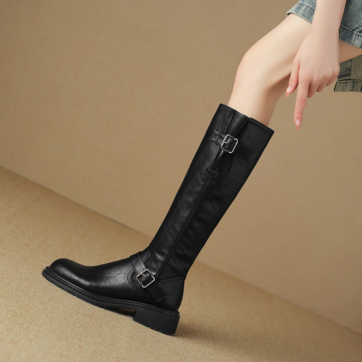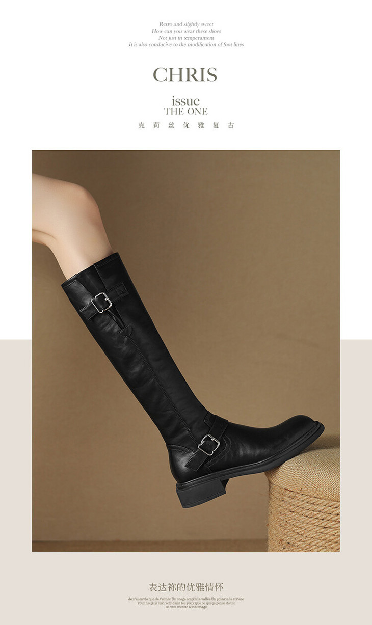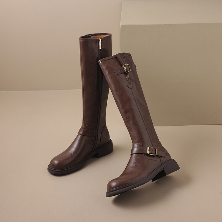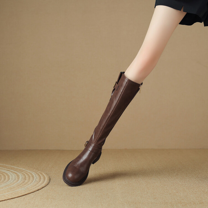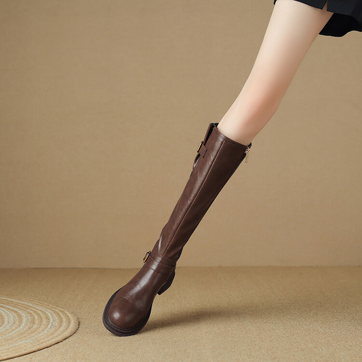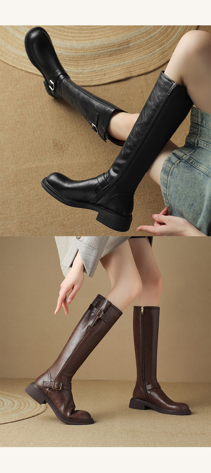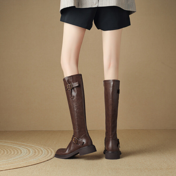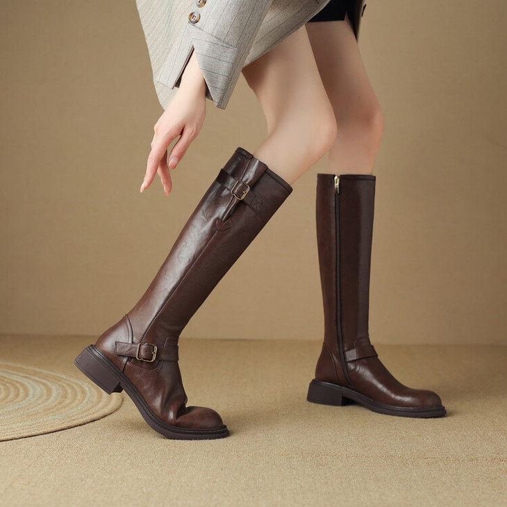 【预售7天】全牛皮复古粗跟长筒靴女秋冬新款真皮显瘦高筒骑士靴MD&67-45