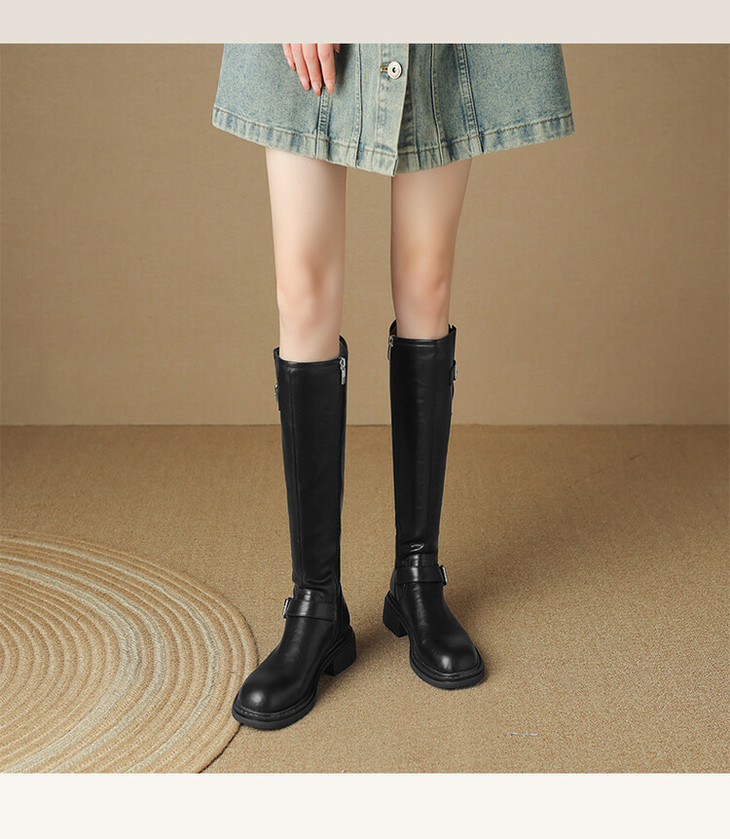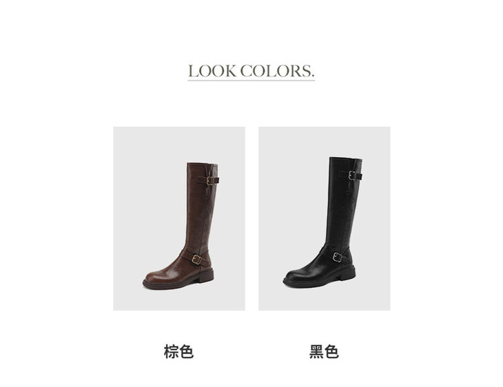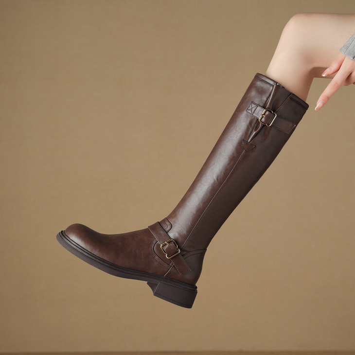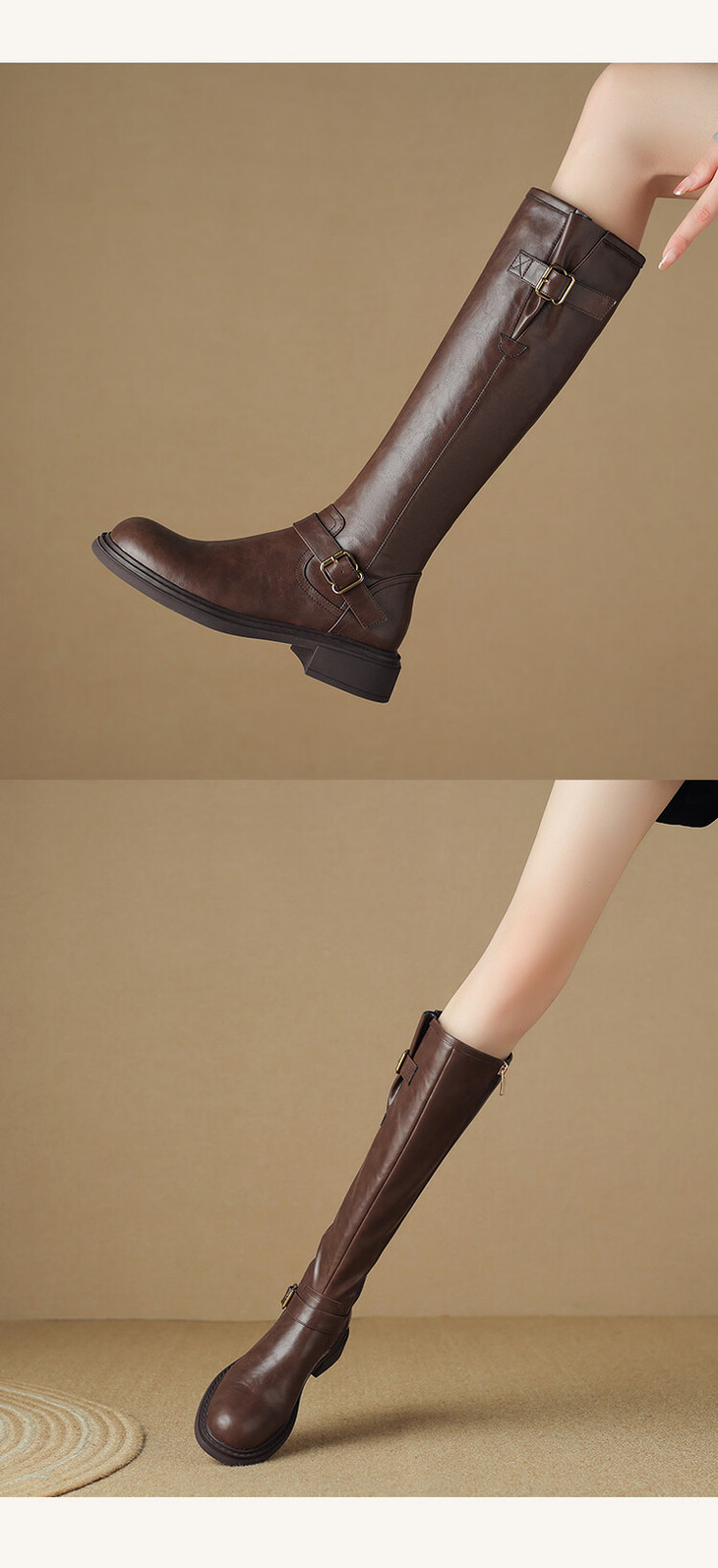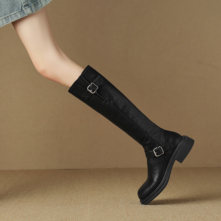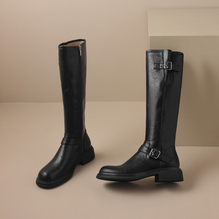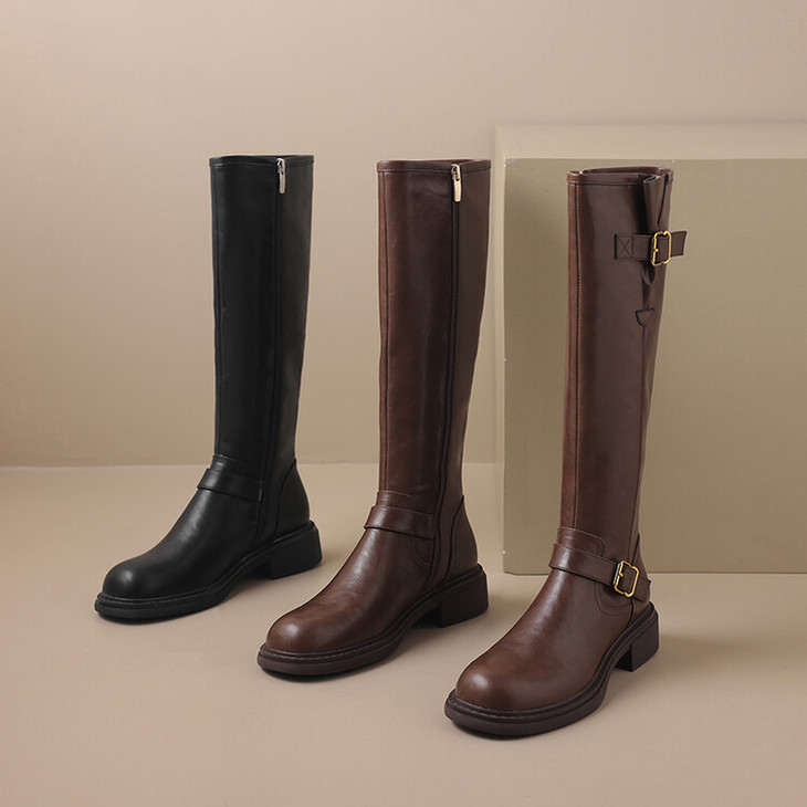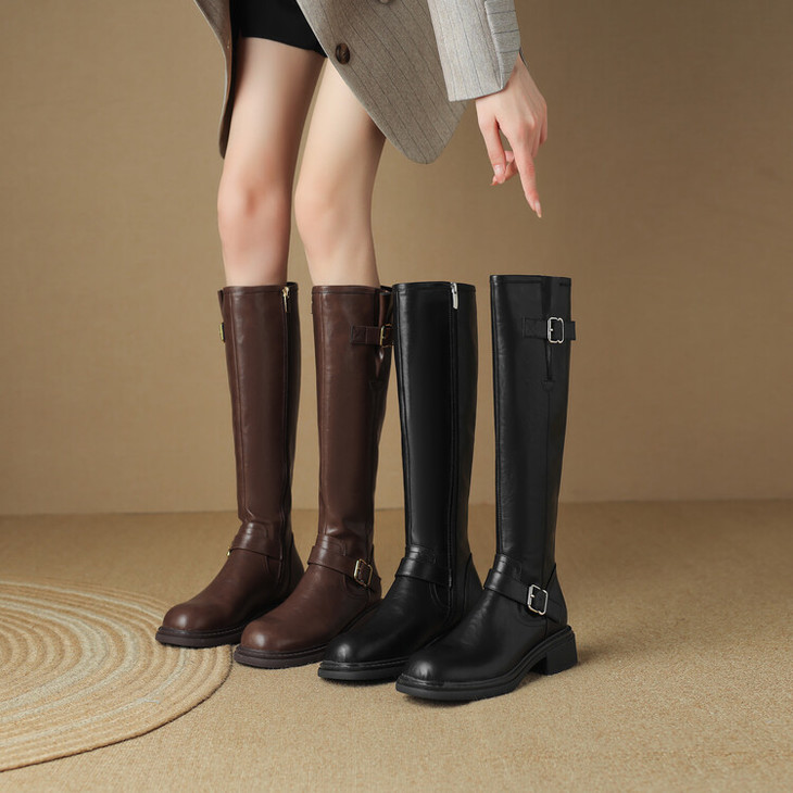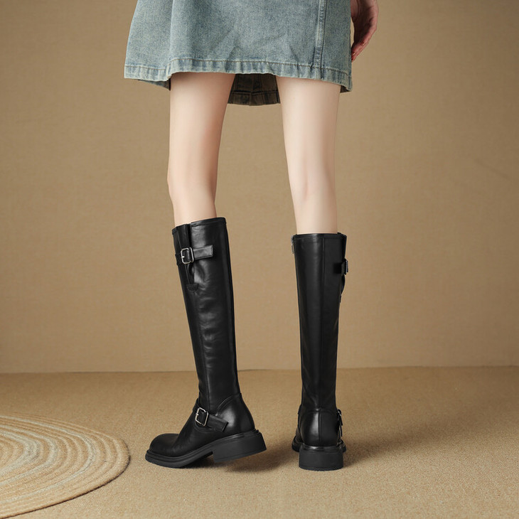 【预售7天】全牛皮复古粗跟长筒靴女秋冬新款真皮显瘦高筒骑士靴MD&67-45