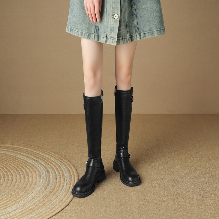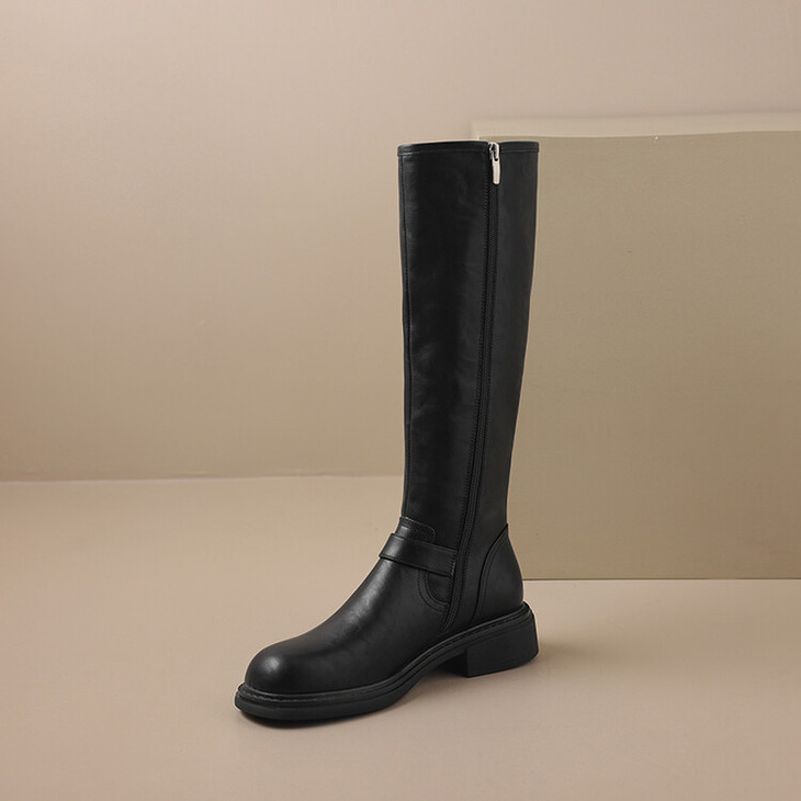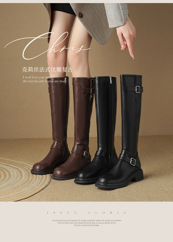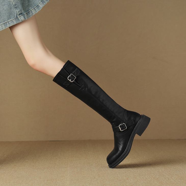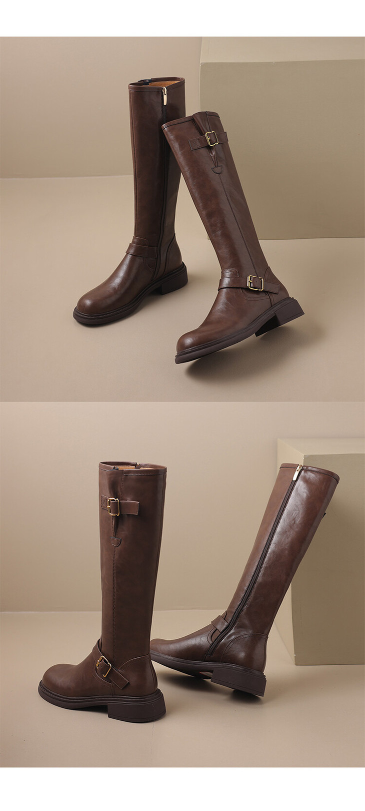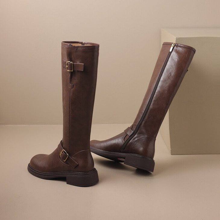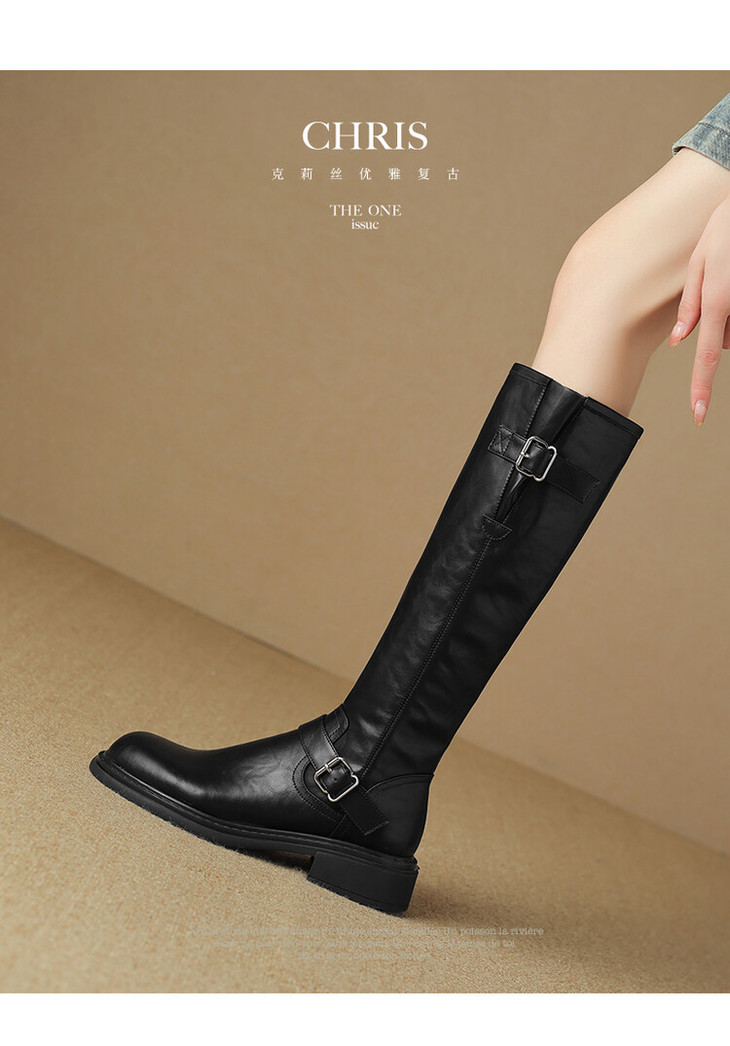 【预售7天】全牛皮复古粗跟长筒靴女秋冬新款真皮显瘦高筒骑士靴MD&67-45