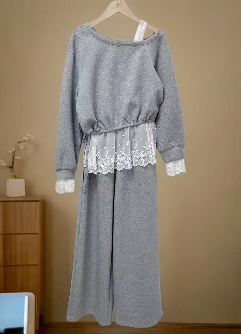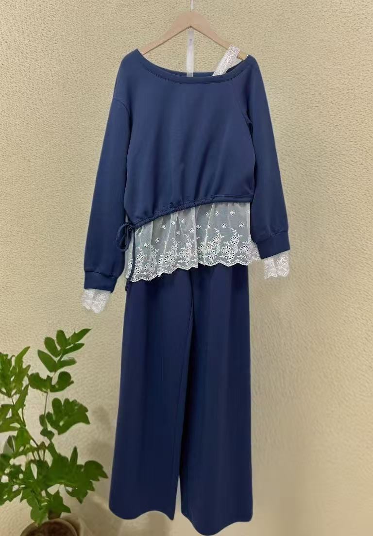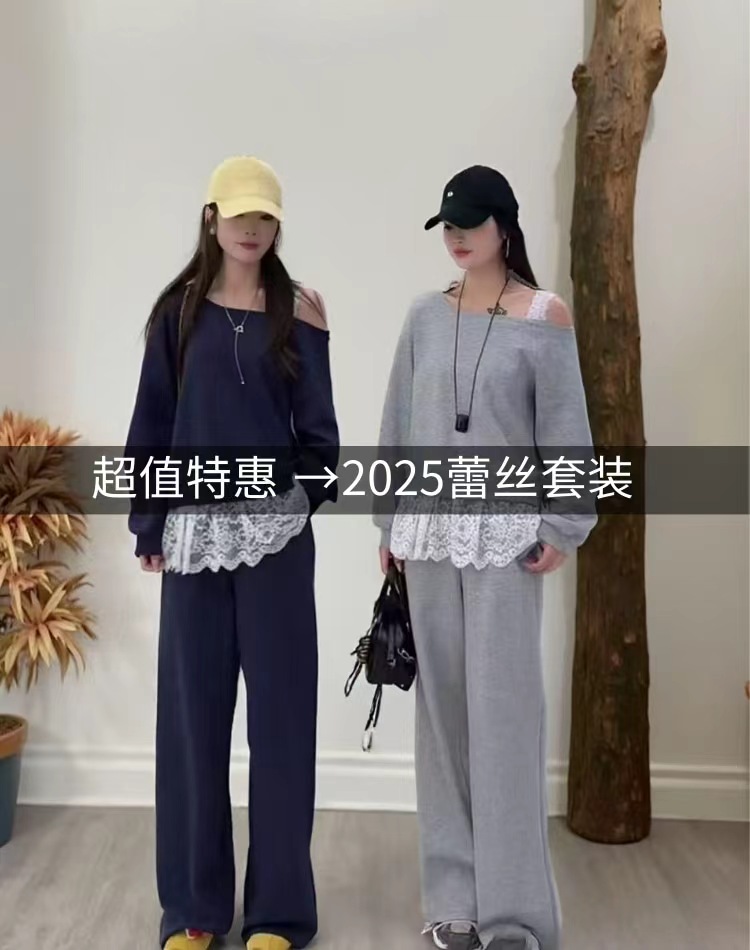 11.11直降到底!!【秋上新】(套装)5817斜肩一字肩蕾丝上衣➕休闲裤两件套-喜出