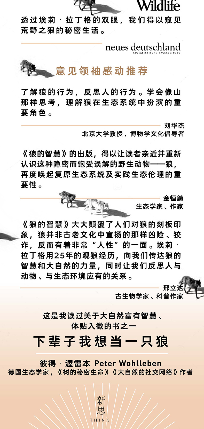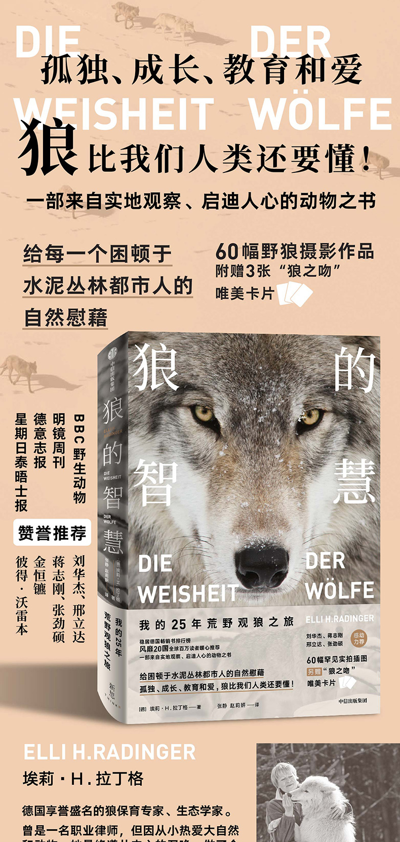 3. 埃莉·拉丁格是享誉德国、广受欢迎的狼研究专家,放弃高薪律师工作,潜心研究野狼三十年。拉丁格拥有研究野狼的一手资料,亲临现场观察野狼,还建立了以狼为主题的网站,与彼得·渥雷本等生态学家互动,在多个电视节目中为狼代言,消除我们对狼的偏见。