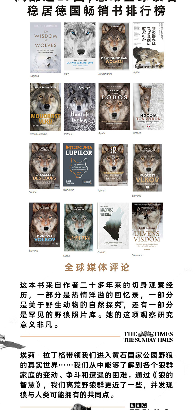 在埃莉·拉丁格的镜头和笔尖下,每一只狼都有自己的名字和个性。你会遇到黄石公园的超级巨星、狼界的安吉丽娜·朱莉“06”,“花花公子”卡萨诺瓦,天生喜欢流浪的“瘸腿儿”,以及为爱殉情的头狼21号。你也会看到拉马尔狼群、莫丽狼群、德鲁伊狼群,如何为捍卫领地而矢志不渝,谱写着一个又一个传奇。