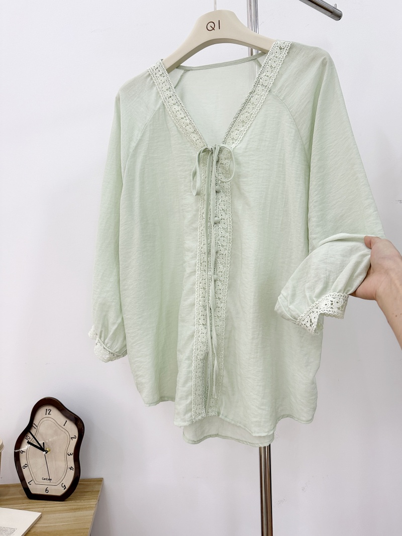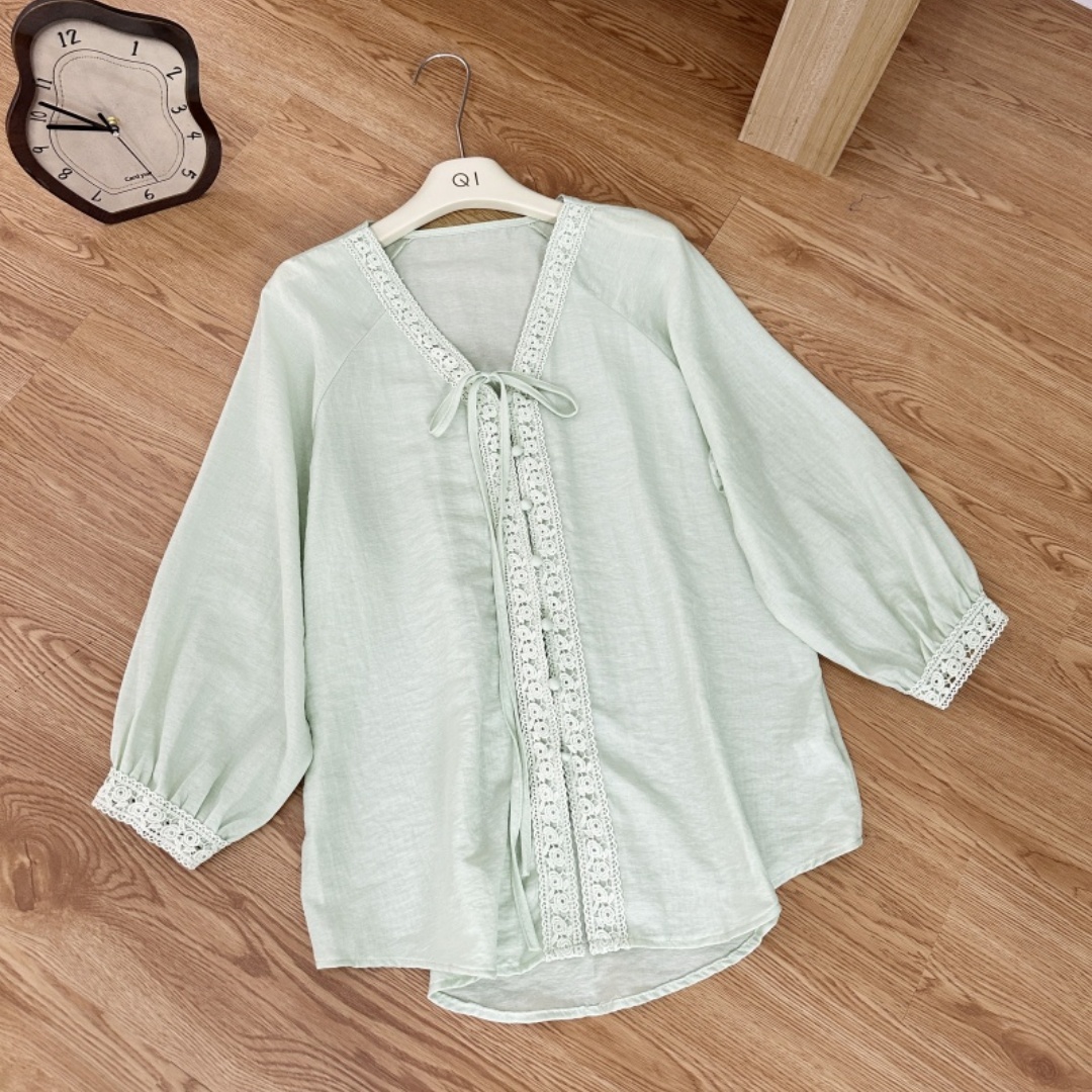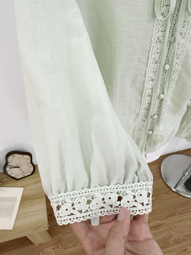 灯笼袖蕾丝花边衬衫【AUChris早秋清冷气质宽松v领蕾丝衫显白衬衣】手臂肉肉隐形术 人棉材质 柔软透气 垂坠感 不易皱