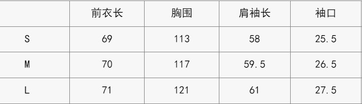 S:前衣长69 胸围113 肩袖长58袖口25.5